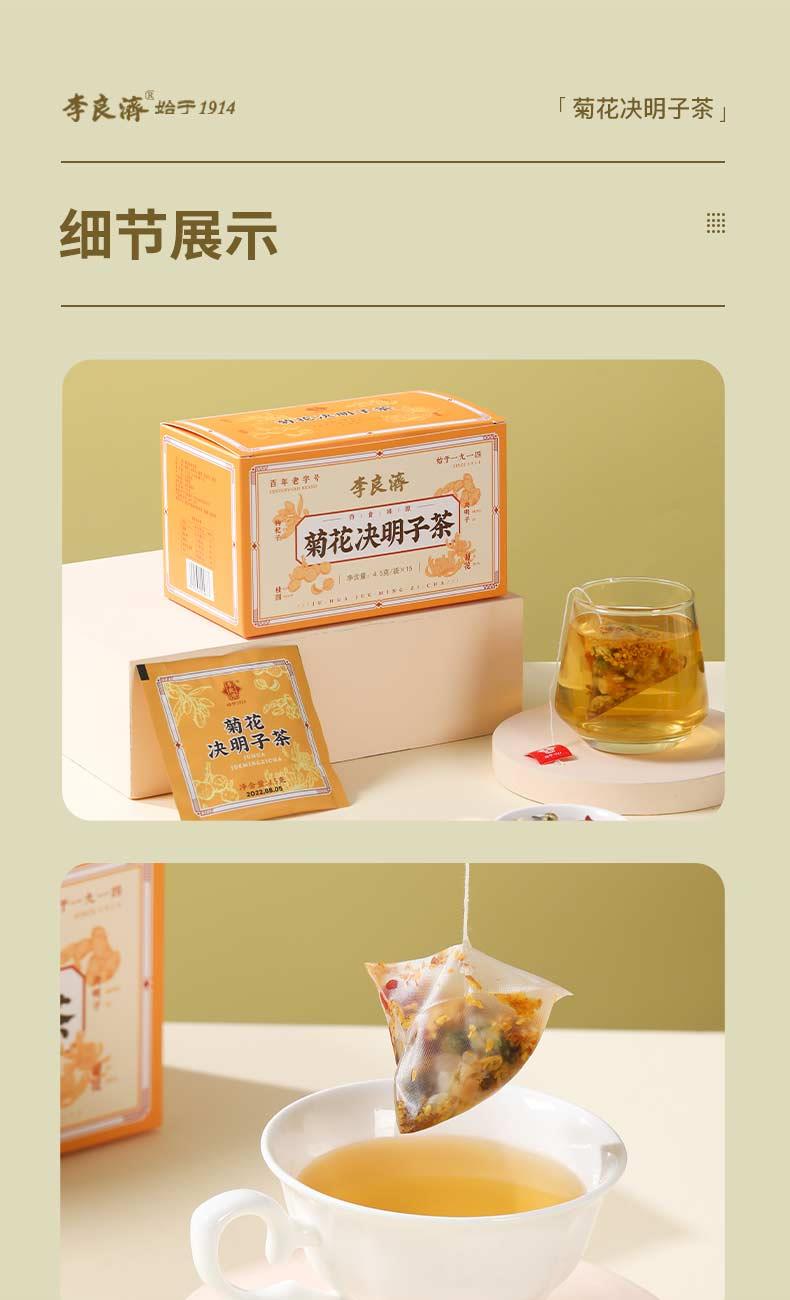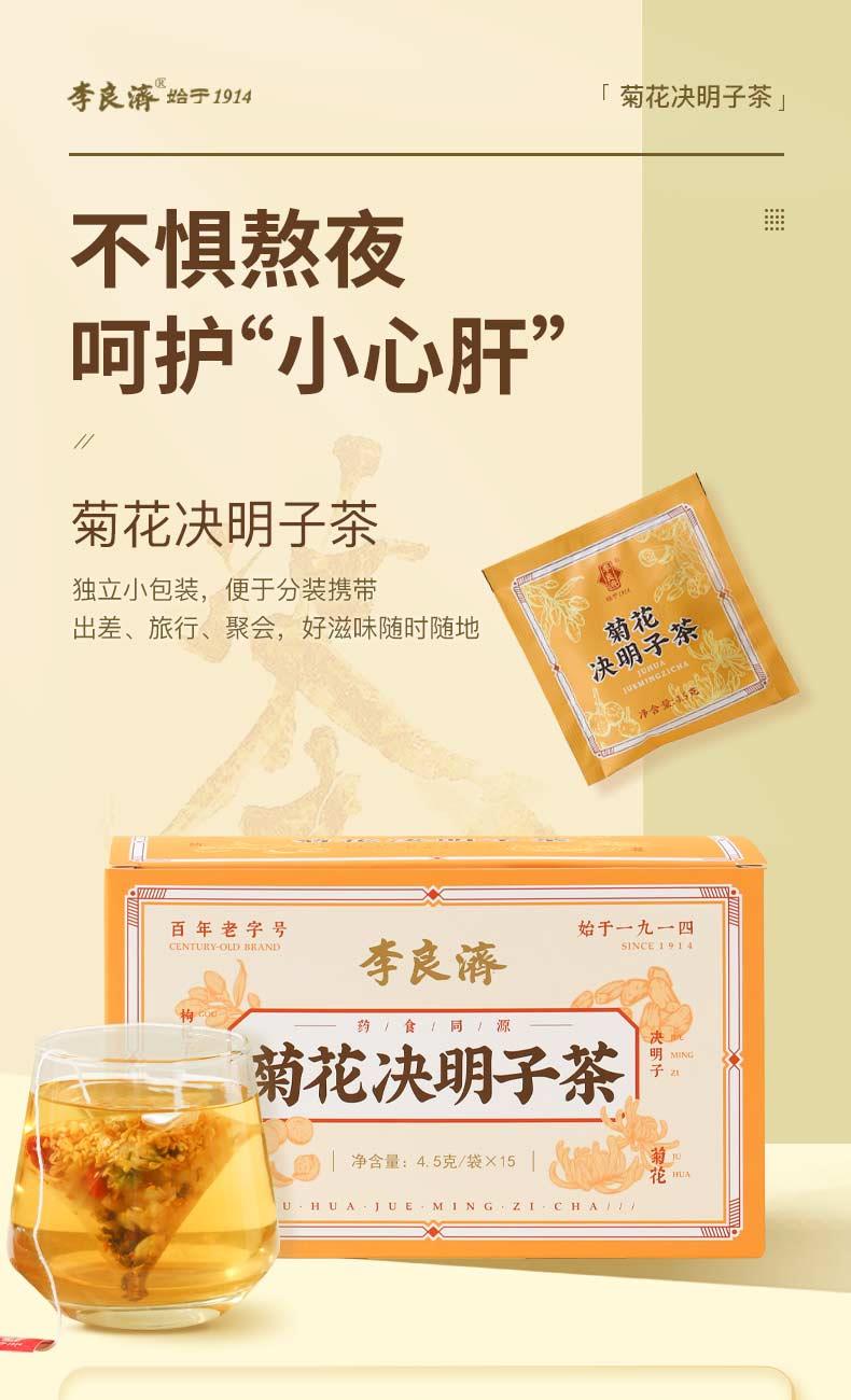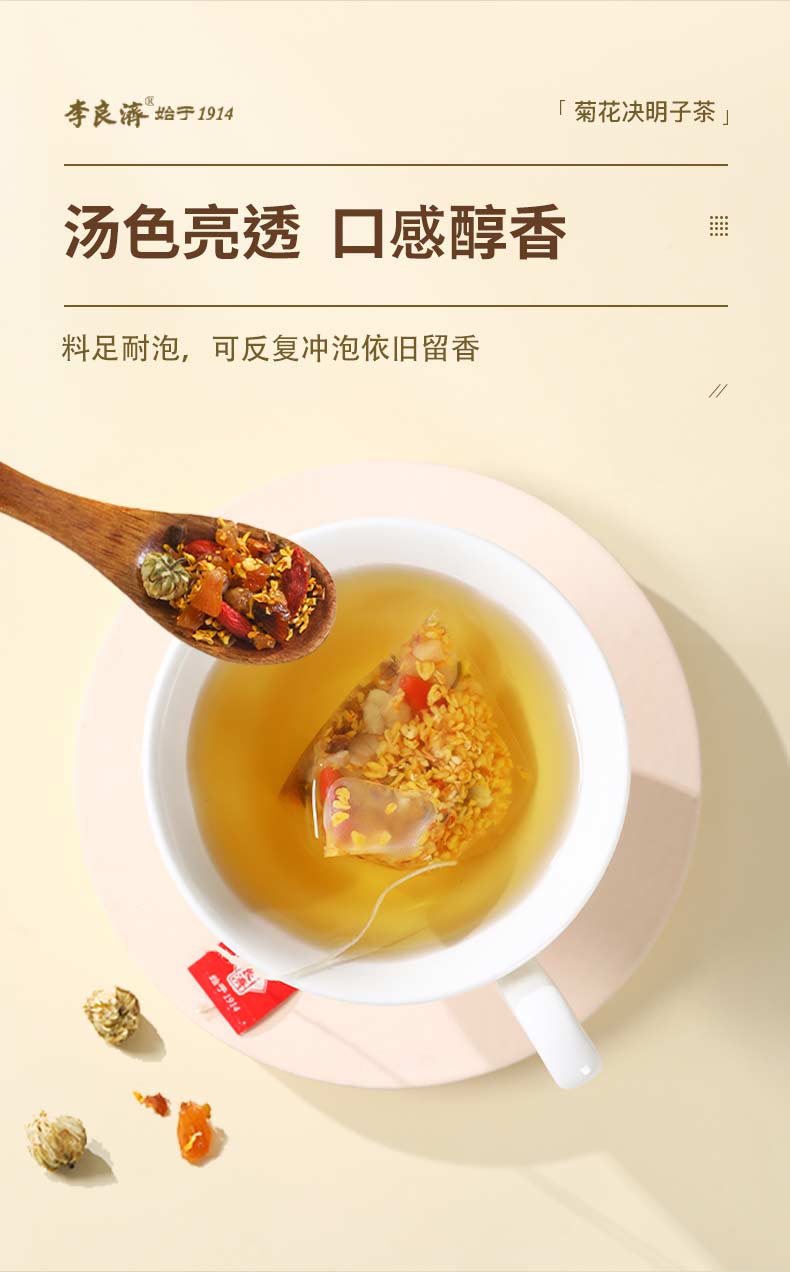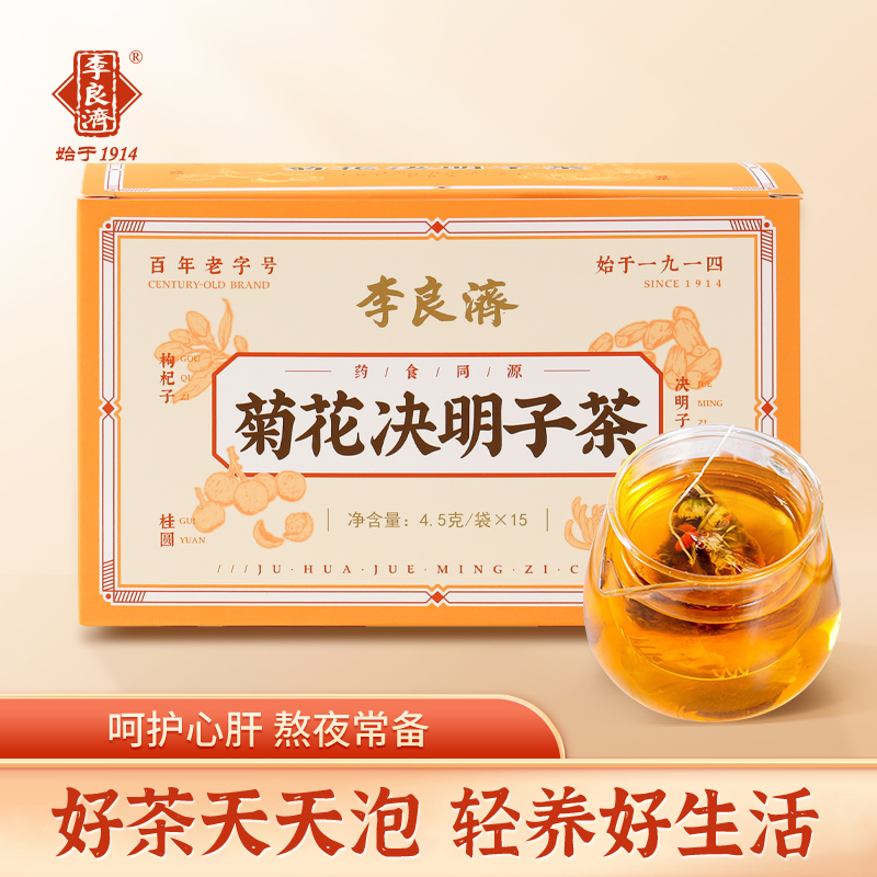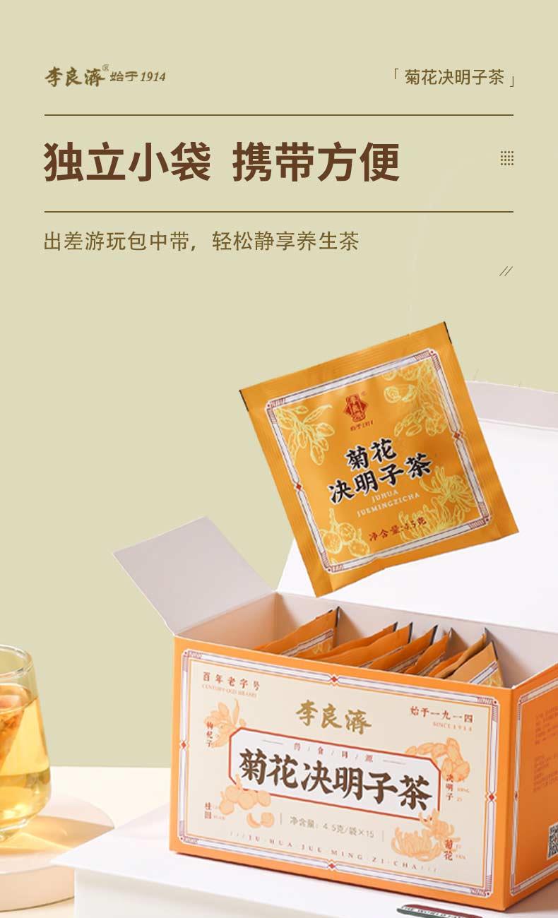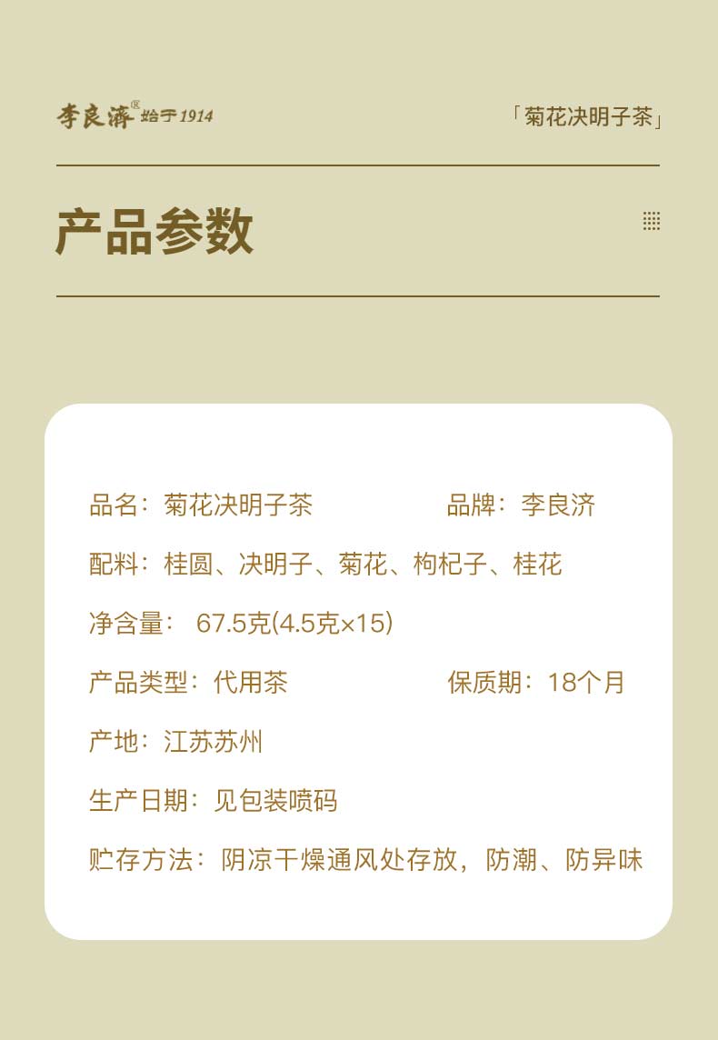 产品:菊花决明子茶 规格:净含量67.5克(4.5g*15包) 保质量:18个月 贮藏方法:阴凉干燥通风处存放,防潮,防异味 配料表:枸杞、菊花、决明子、桂圆等 办公室饮品,商务接待,白领自饮 精致包装,送礼佳选