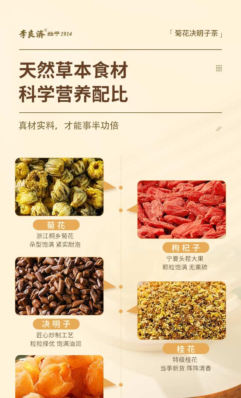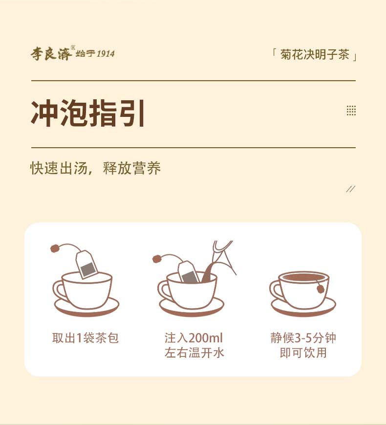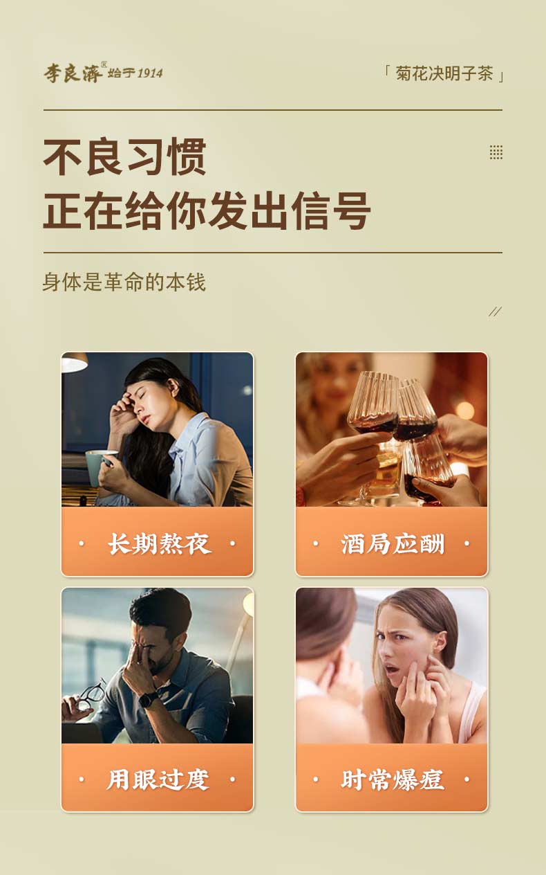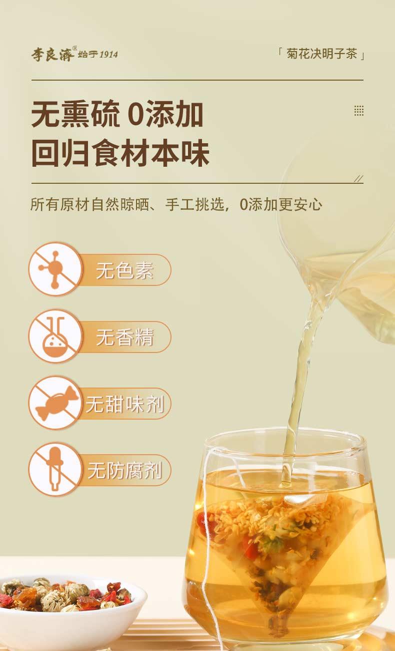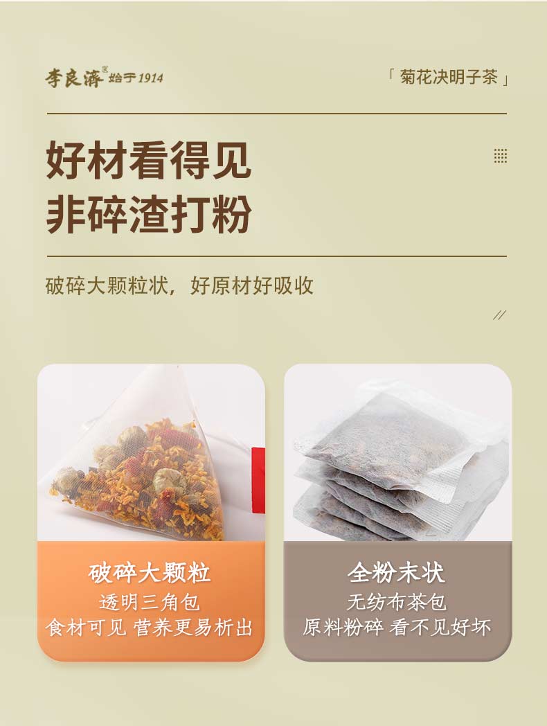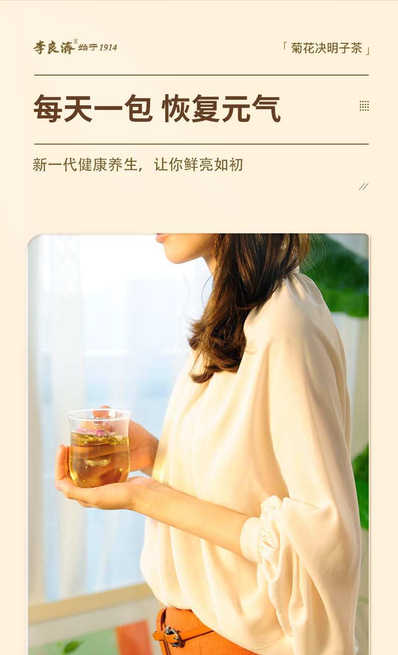 产品:菊花决明子茶 规格:净含量67.5克(4.5g*15包) 保质量:18个月 贮藏方法:阴凉干燥通风处存放,防潮,防异味 配料表:枸杞、菊花、决明子、桂圆等 办公室饮品,商务接待,白领自饮 精致包装,送礼佳选
