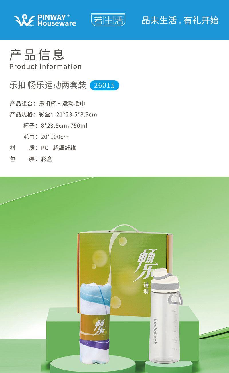 产品组合:乐扣杯+运动毛巾 产品规格:彩盒21*23.5*8.3cm 乐扣杯:8*23.5cm,750ml 毛巾:20*100cm 材质:PC 超细纤维 包装:彩盒