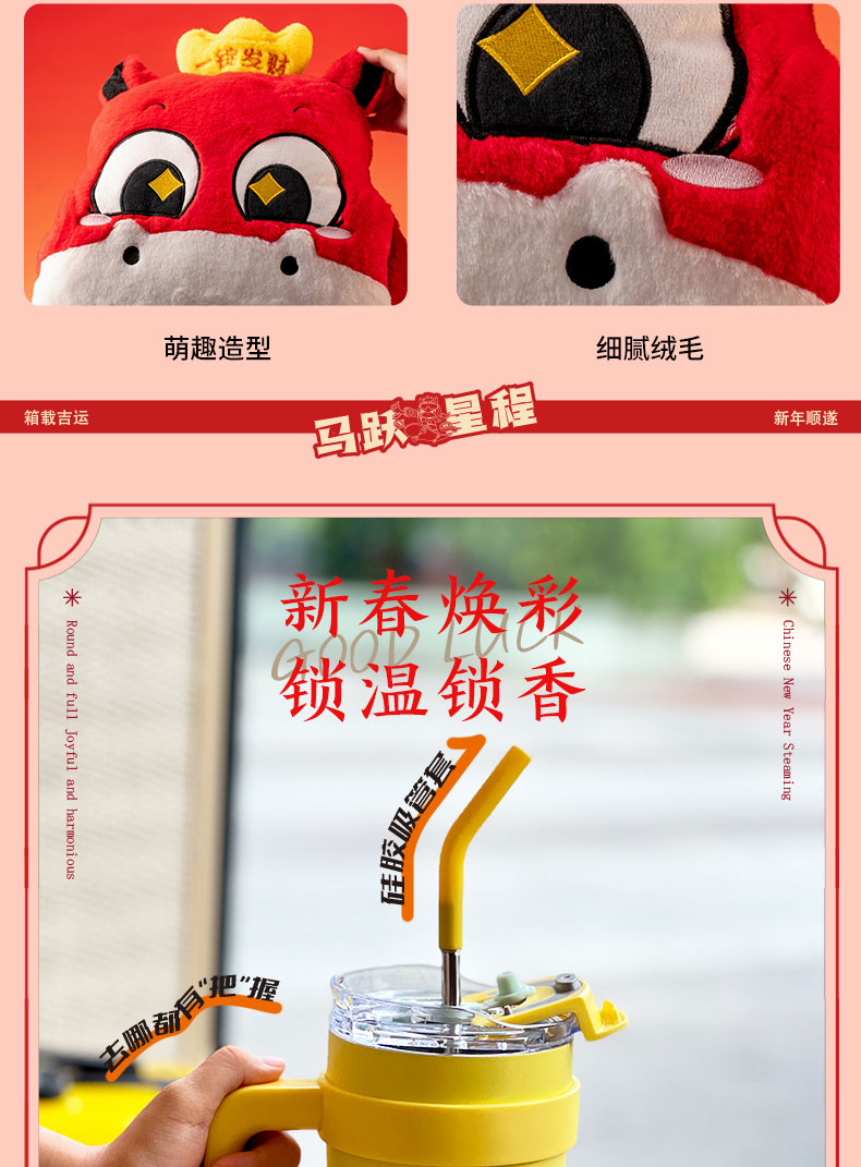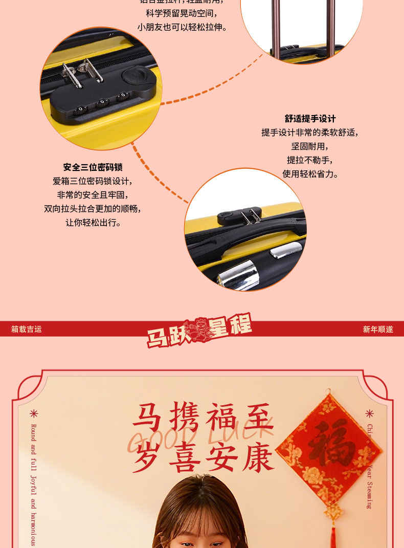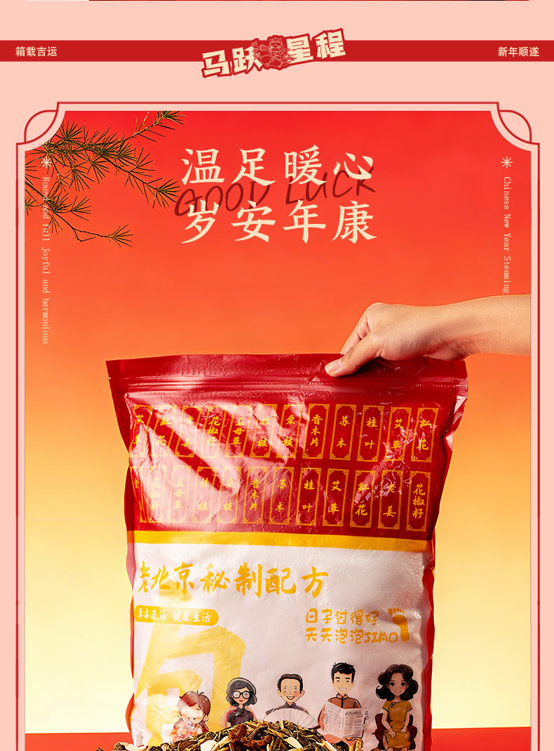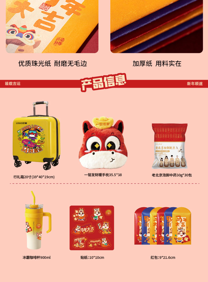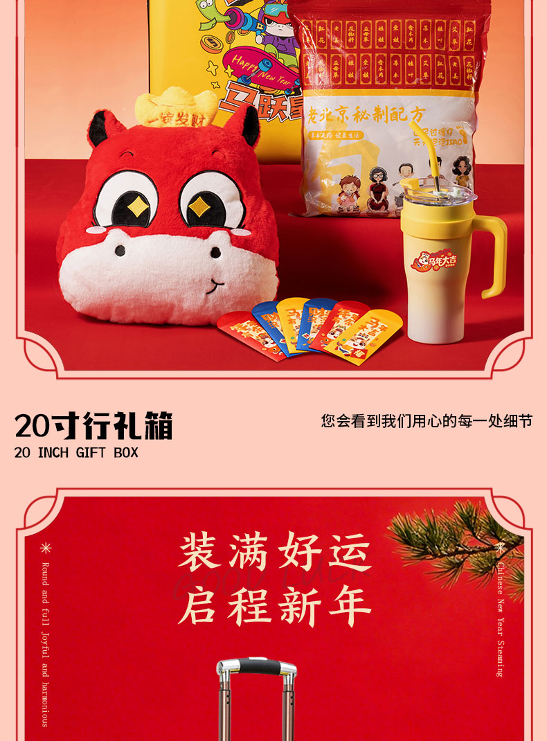 产品配置:20寸行李箱、咖啡杯*1(900ml)、十八味药材泡脚包30小包一袋、一锭发财暖手抱枕、马年大吉红包*6个