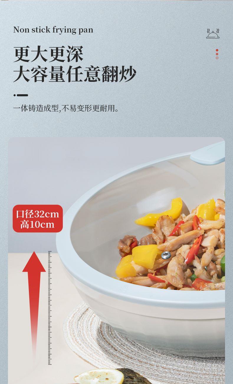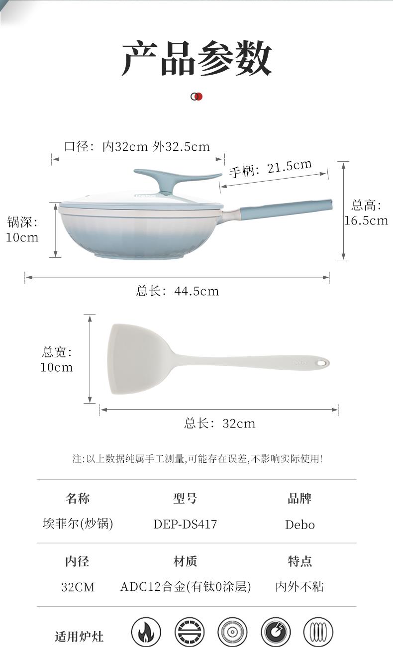 型号:DEP-DS417 口径:32cm 容量:4.3L 材质:ADC12合金 包装尺寸:350*125*533mm 配置:锅身*1、玻璃盖*1、硅胶铲*1 1. 钛合金技术,耐磨耐腐蚀性; 2. 内钛外陶双面不粘,无惧各种易粘食材; 3. 有钛惰性强,保持食材的原汁原味; 4. 好锅不挑灶,双强化导磁不锈钢复底,适用更多炉灶; 5. 美味与形色兼顾,烹饪出好的味道。