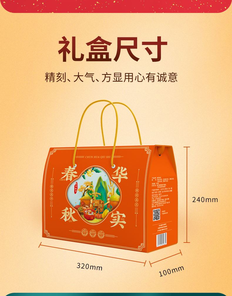 礼盒:春华秋实 条码:6972761600864 产品规格配置:高粱米、麦 仁玉米碴、糙 米(250g*4袋) 盒尺寸:32*24*10cm 净含量:1000g 箱重量:15.5kg 箱体积:0.107方