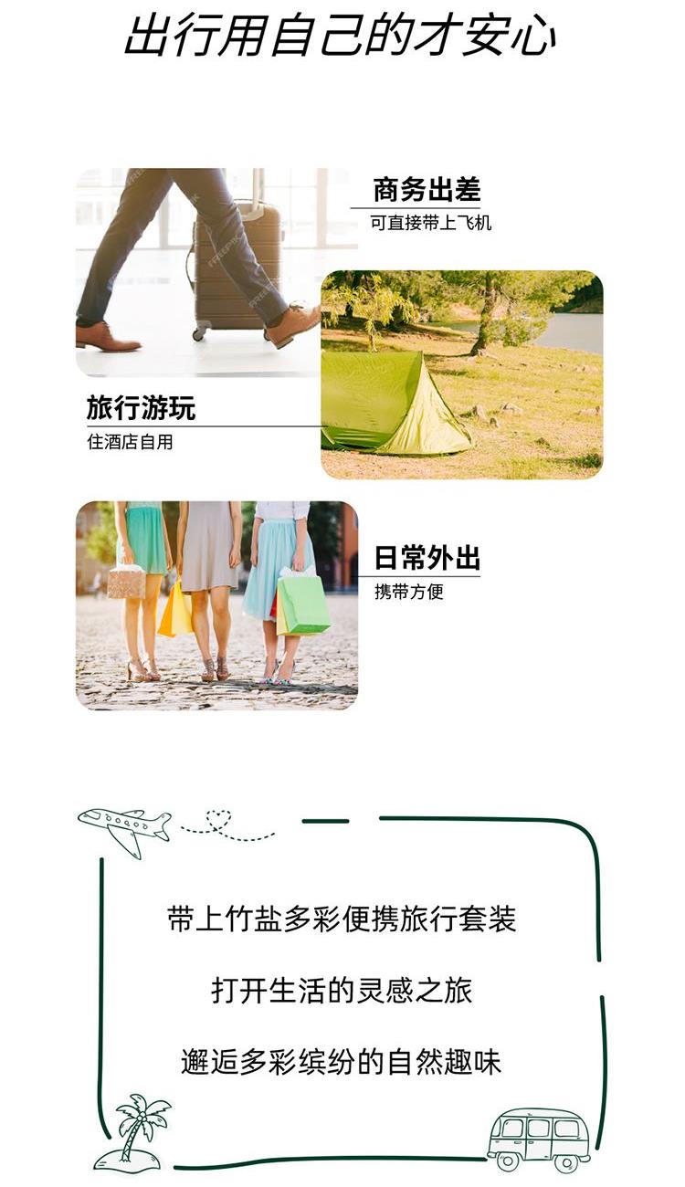 沐浴露:香水级香氛(馥郁香气 丝丝索饶),产品功效:清洁皮肤,滋润美肌,留香更长,植物精油成分,细致渗透力,肌肤易吸收,打造润泽美肌。 竹盐多彩便携旅行套装(颜色随机):出差旅游等方便携带,小小一个不占地方,竹盐系列牙膏+牙刷精心搭配