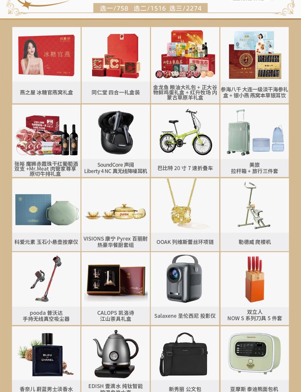选项1 燕之屋 品燕阁明星款·冰糖官燕窝礼盒 选项2 同仁堂 四合一礼盒装 选项3 红升牧场内 蒙古草原羊肉礼盒+金龙鱼 粮油大礼包+正大 谷物鲜鸡蛋 选项4 参海八千 大连一级淡干海参礼盒+银小燕 燕窝本草银耳饮 选项5 张裕 魔狮赤霞珠干红葡萄酒双支+Mr.Meat肉管家尊享原切牛排礼盒 选项6 SoundCore声阔 Liberty 4 NC真无线降噪耳机 选项7 巴比特 20寸7速折叠车 选项8 美旅 拉杆箱24英寸+美旅 旅行三件套 选项9 科爱元素 玉石小悬壶按摩仪 选项10 VISIONS康宁 Pyrex百丽耐热豪华餐厨套组 选项11 OOAK 列维斯蕾丝环项链 选项12 勒德威 爬楼机 选项13 pooda普沃达 手持无线真空吸尘器 选项14 CALOPS凯洛诗2+1江山茶具礼盒 选项15 Salaxene圣伦西尼 投影仪 选项16 双立人 NOW S系列刀具5件套 选项17 香奈儿 蔚蓝男士淡香水 选项18 新秀丽 公文包 选项19 EDISH壹滴水 纯钛智能控温电热水壶 选项20 亚摩斯 泰迪熊家用智能面包机