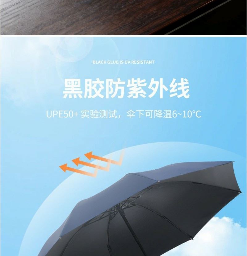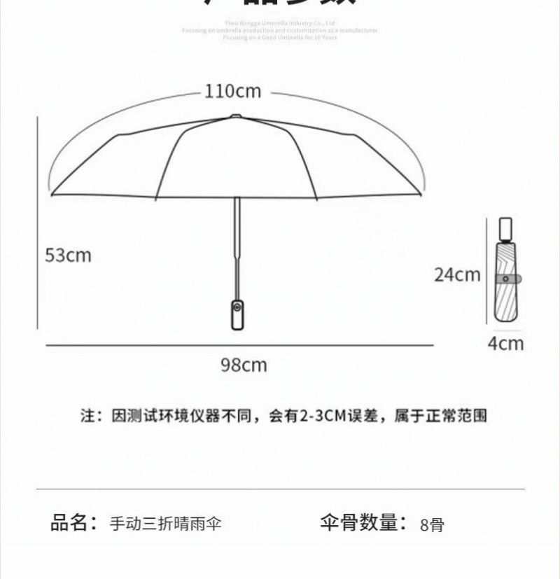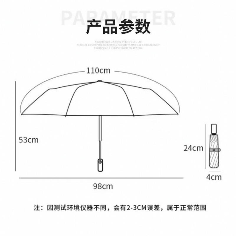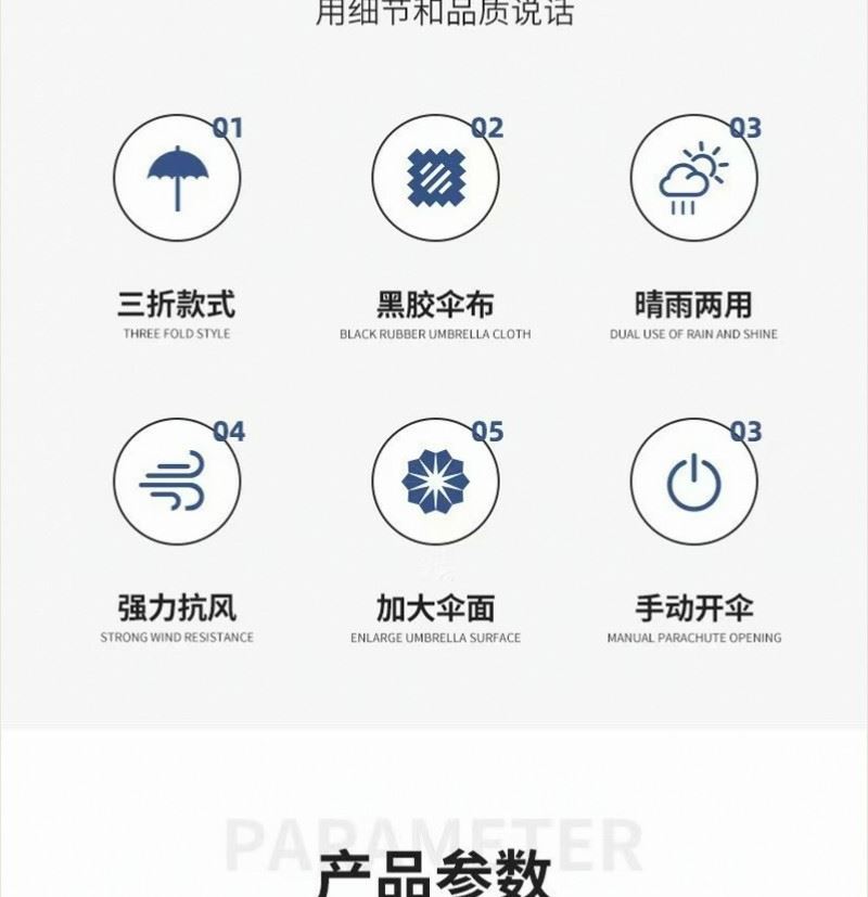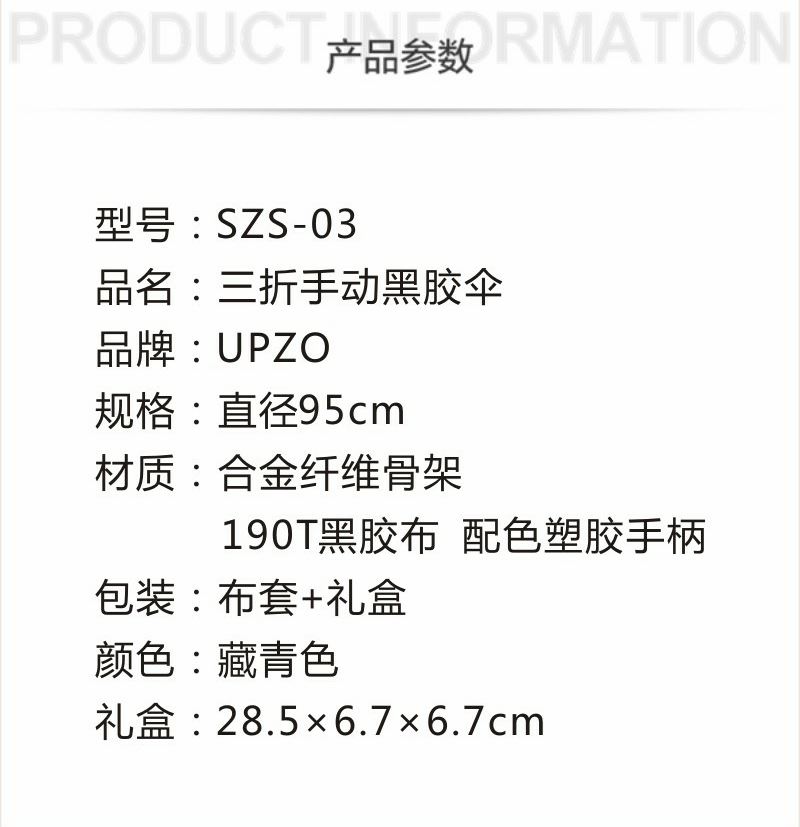 规格:直径95CM 伞架:合金纤维骨架 面料:190T黑胶布 手柄:配色塑胶手柄 包装:布套+礼盒 颜色:藏青色 礼盒:28.5×6.7×6.7cm
