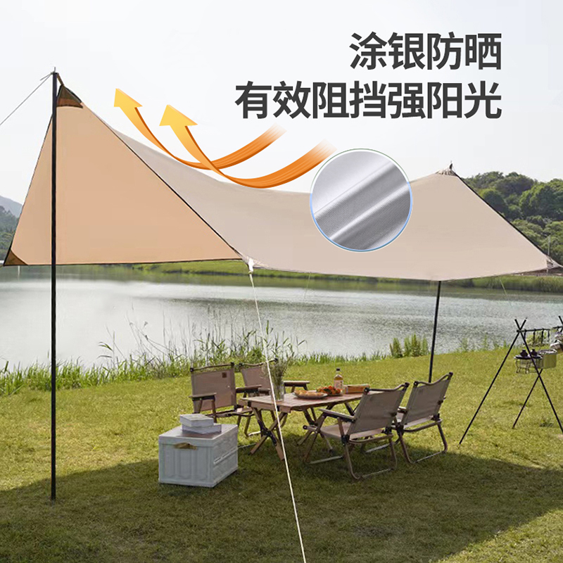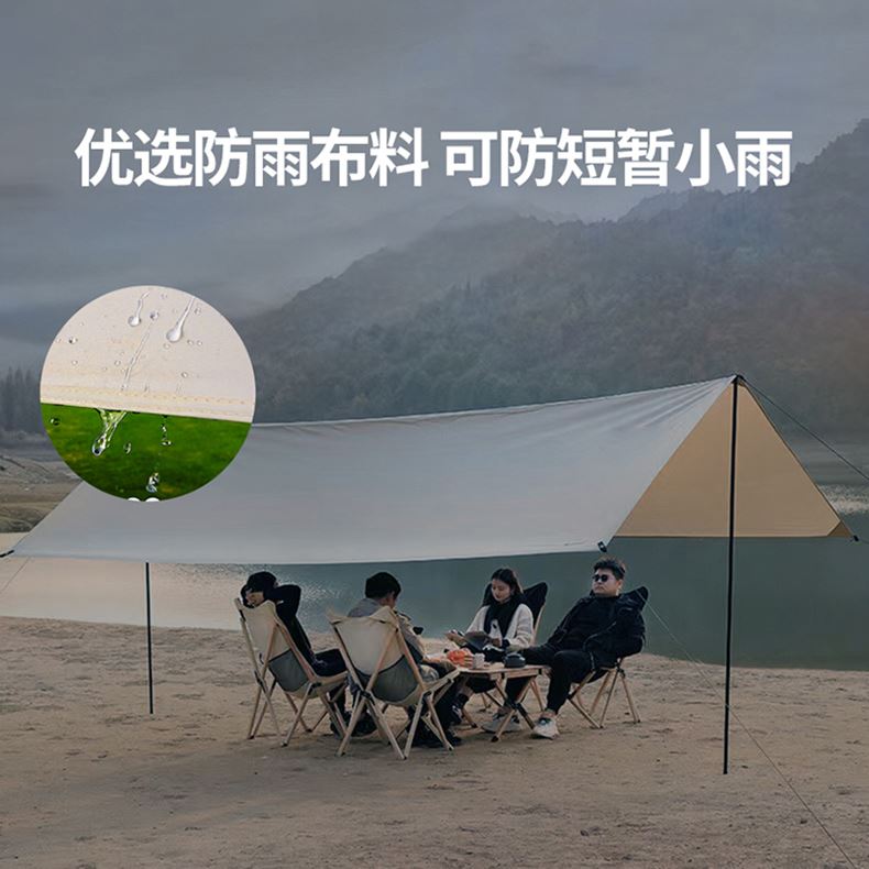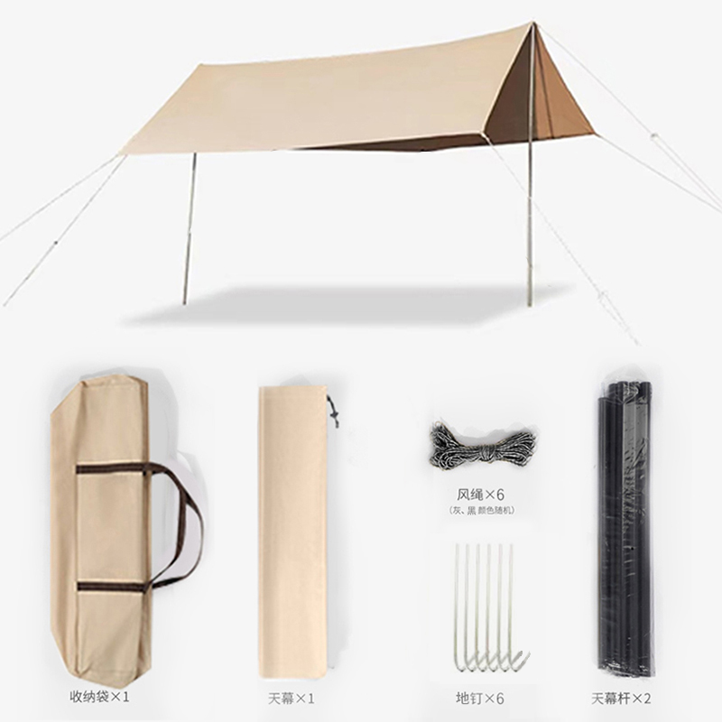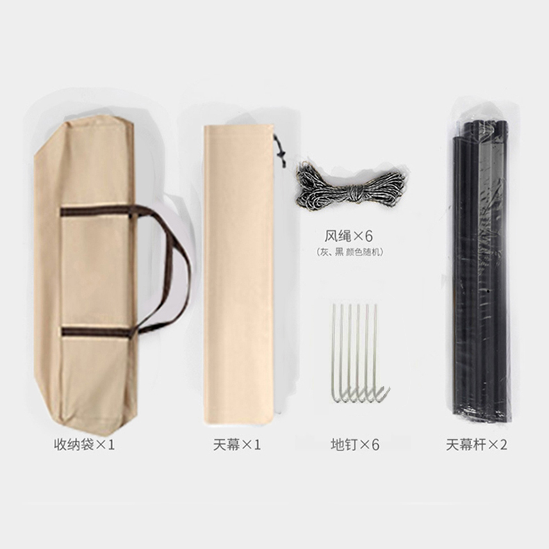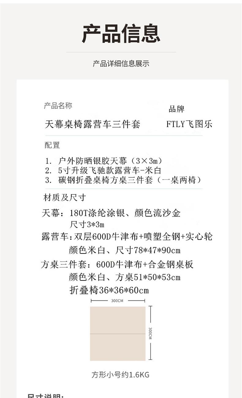 配置含: 1. 户外防晒银胶天幕(3×3m) 2. 5寸升级飞驰款露营车 3. 碳钢折叠桌椅三件套(一桌两椅+收纳袋) 天幕 防晒系数:UPF50+ 防水系数:pu1500+ 材质:180T涤纶涂银 颜色:流沙金 尺寸:3*3m 露营车 材质:双层600D牛津布+喷塑全钢+实心轮 容量:80-120L 承重:60kg 颜色:米白 类型:折叠式 折叠桌椅三件套 材质: 600D加密透气牛津布 +合金钢桌板 颜色:米白 、净重:7kg 、承重:120-130kg 桌子尺寸:51*50*50cm 椅子尺寸:60*36*36cm