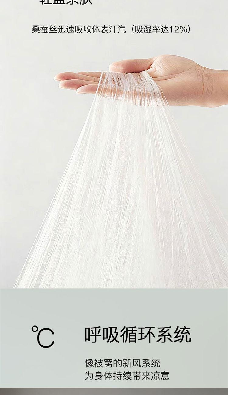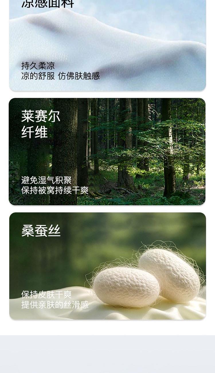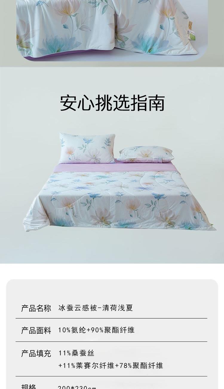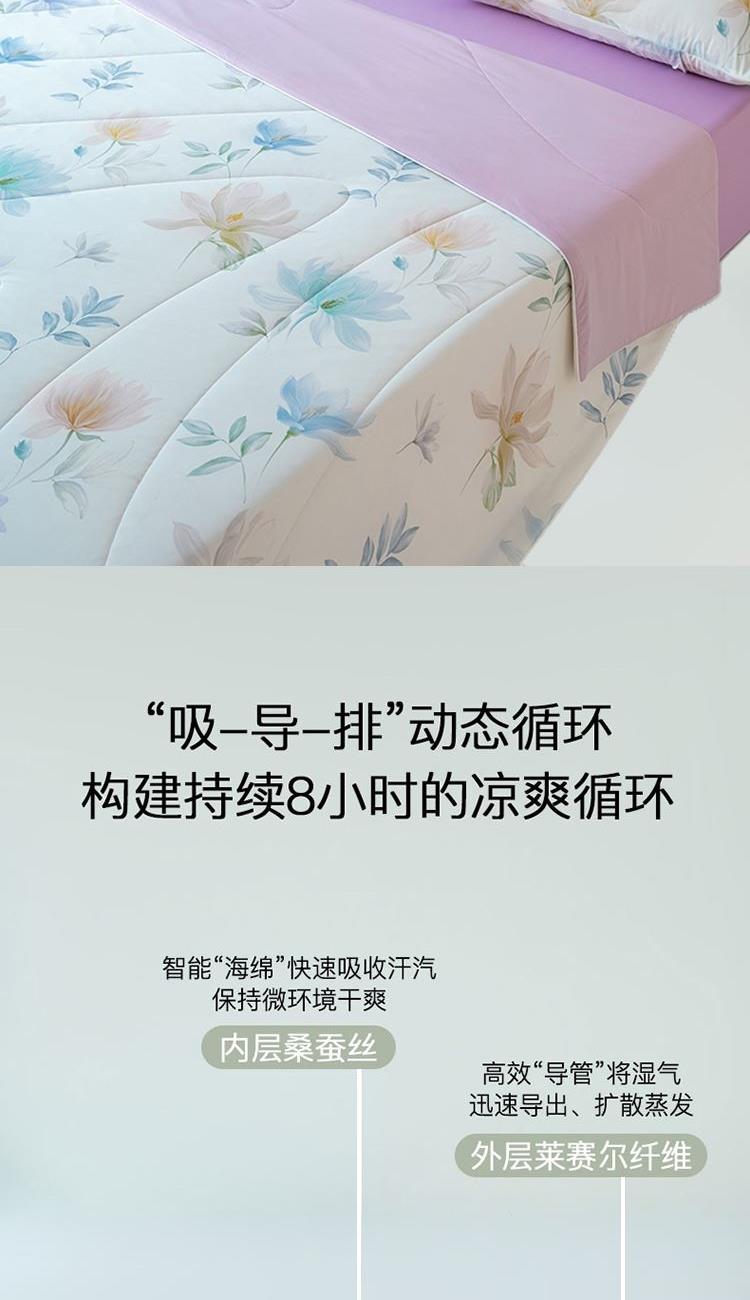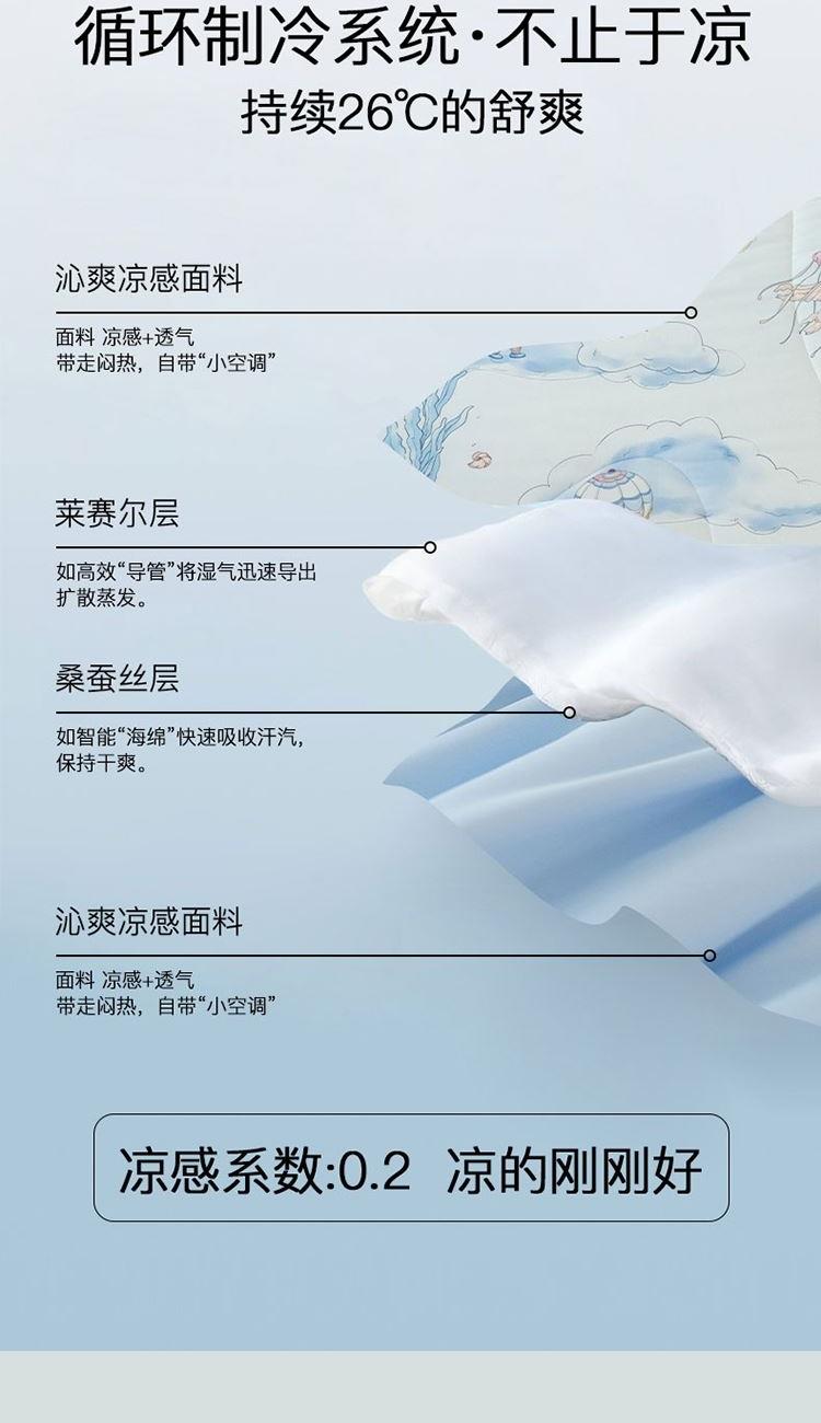 规格:200*230cm 面料:10%氨纶+90%聚酯纤维 填充:11%桑蚕丝+11%赛尔纤维+78%聚酯纤维 重量:1.6kg 卖点:1、一触即凉,裸睡级肤感,双料黑科技:莱赛尔纤维+桑蚕丝,凉感与柔润兼得 2、循环制冷系统:持续26℃舒爽,告别黏腻夏夜 3、可机洗水洗,不易变形、不易结团,懒人福音,每次使用都像新的一样。