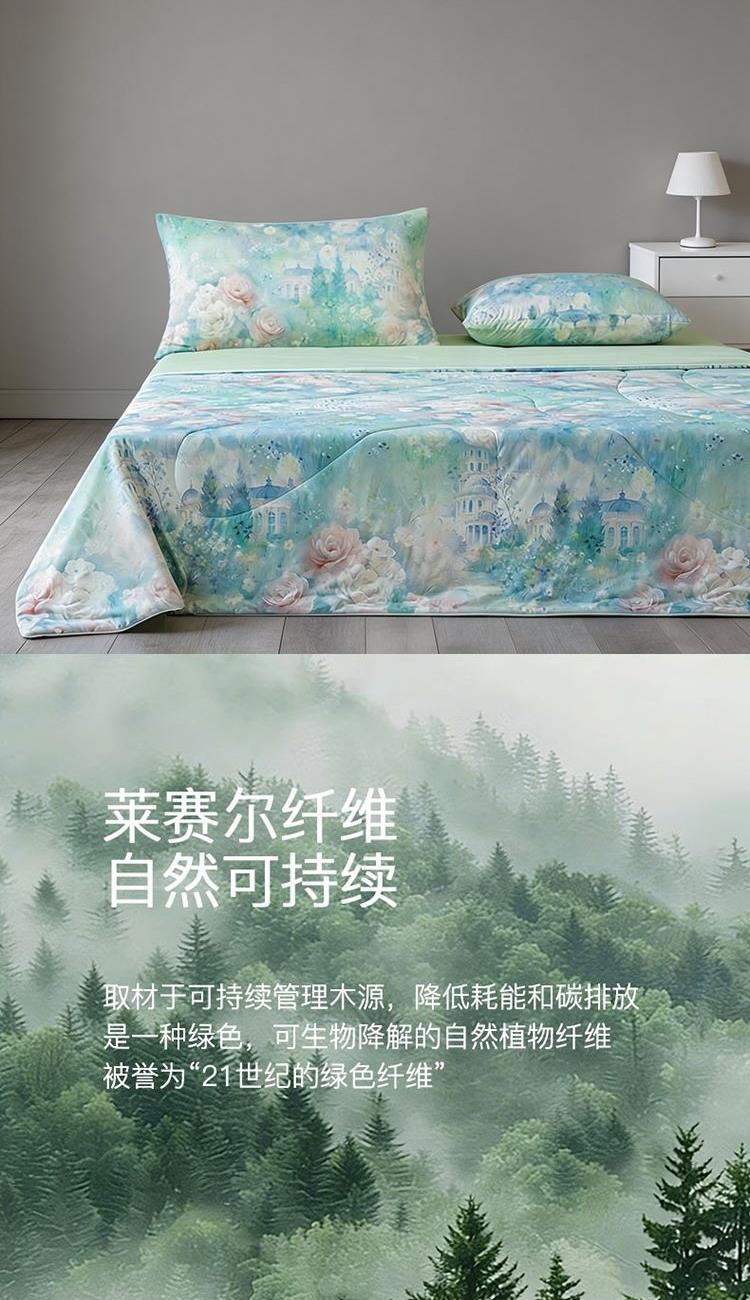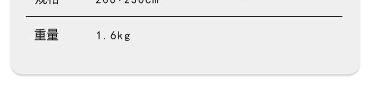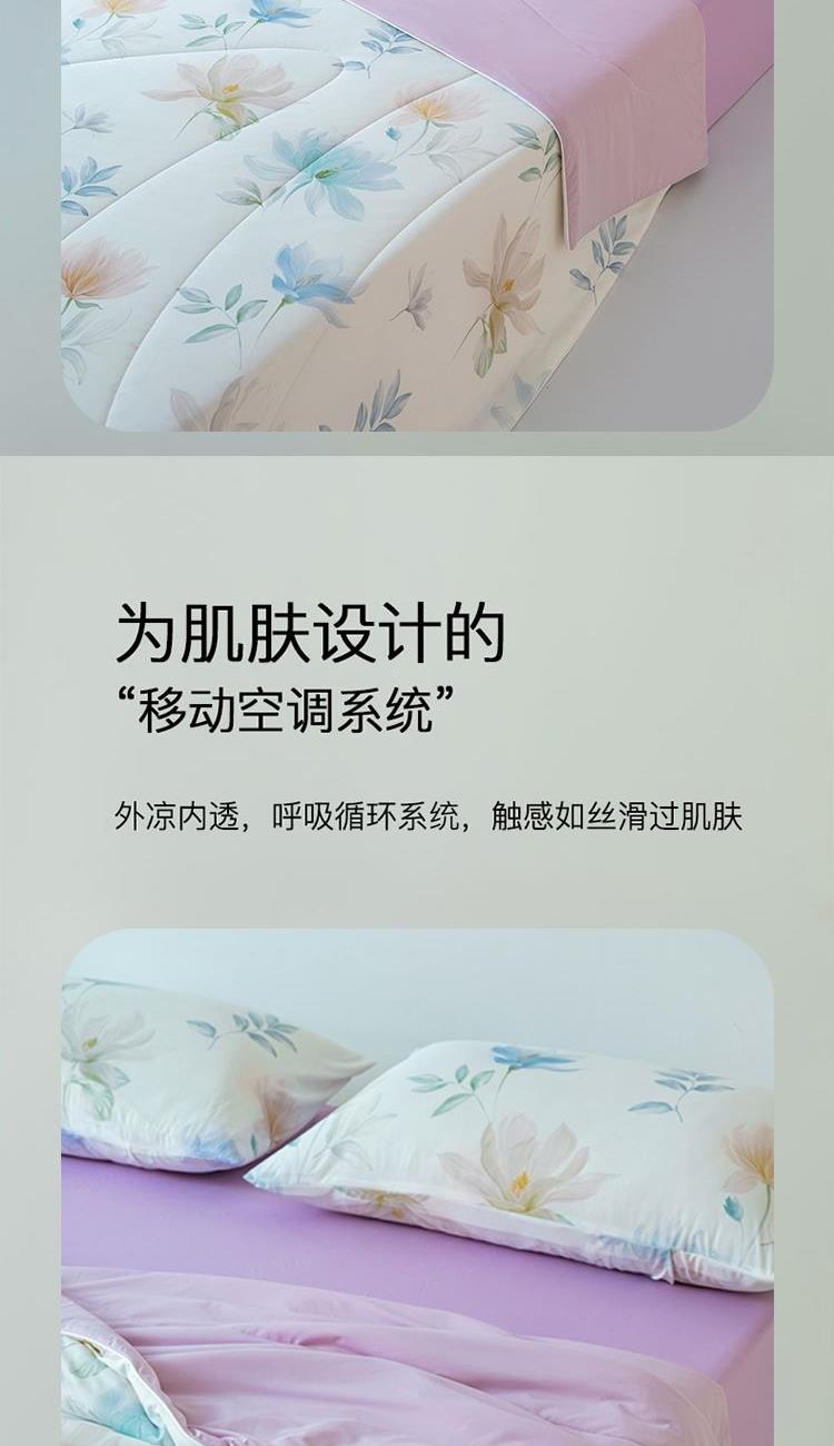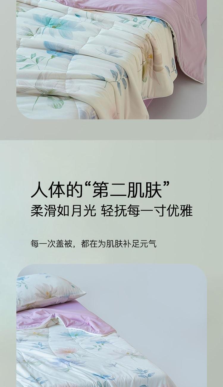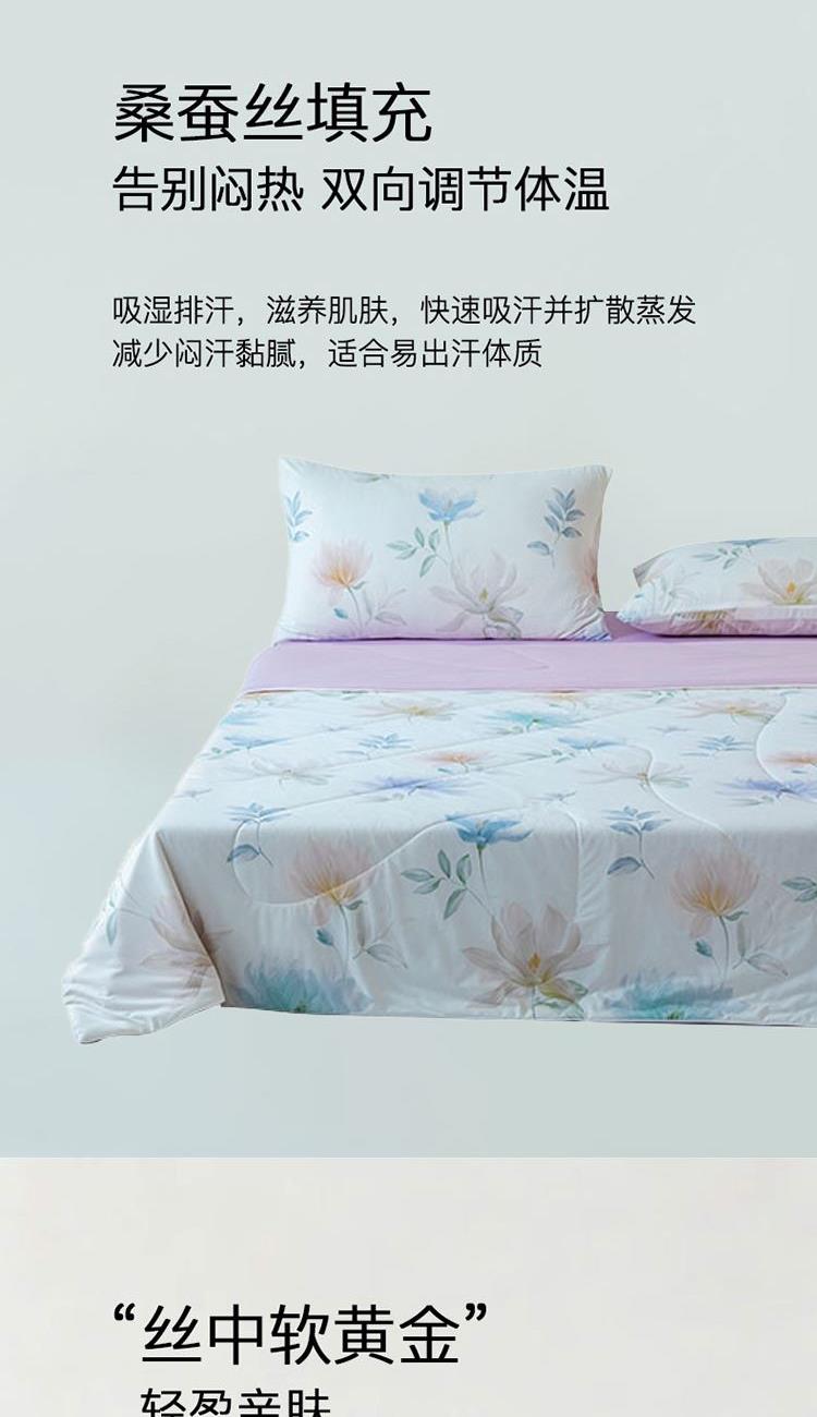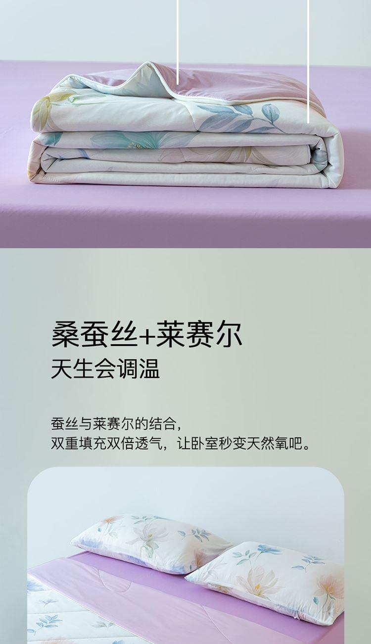 规格:200*230cm 面料:10%氨纶+90%聚酯纤维 填充:11%桑蚕丝+11%赛尔纤维+78%聚酯纤维 重量:1.6kg 卖点:1、一触即凉,裸睡级肤感,双料黑科技:莱赛尔纤维+桑蚕丝,凉感与柔润兼得 2、循环制冷系统:持续26℃舒爽,告别黏腻夏夜 3、可机洗水洗,不易变形、不易结团,懒人福音,每次使用都像新的一样。