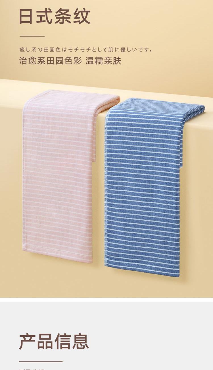 A类 · 婴幼儿可用标准,通过瑞士SGS机构检测认证 安全环保:无甲醛、无芳香胺、零添加荧光剂,PH安全温和 优选新疆长绒棉,经典条纹款式,3重色系,颜值担当,福利礼赠 双层美学艺术设计,柔纤织线,纱布亲肤,毛圈锁水 包装采用日本进口牛皮纸材质,可降解回收;环保组合,防尘塑封 日本原创设计,東川株式会社专研双生云织®巾类织造技术