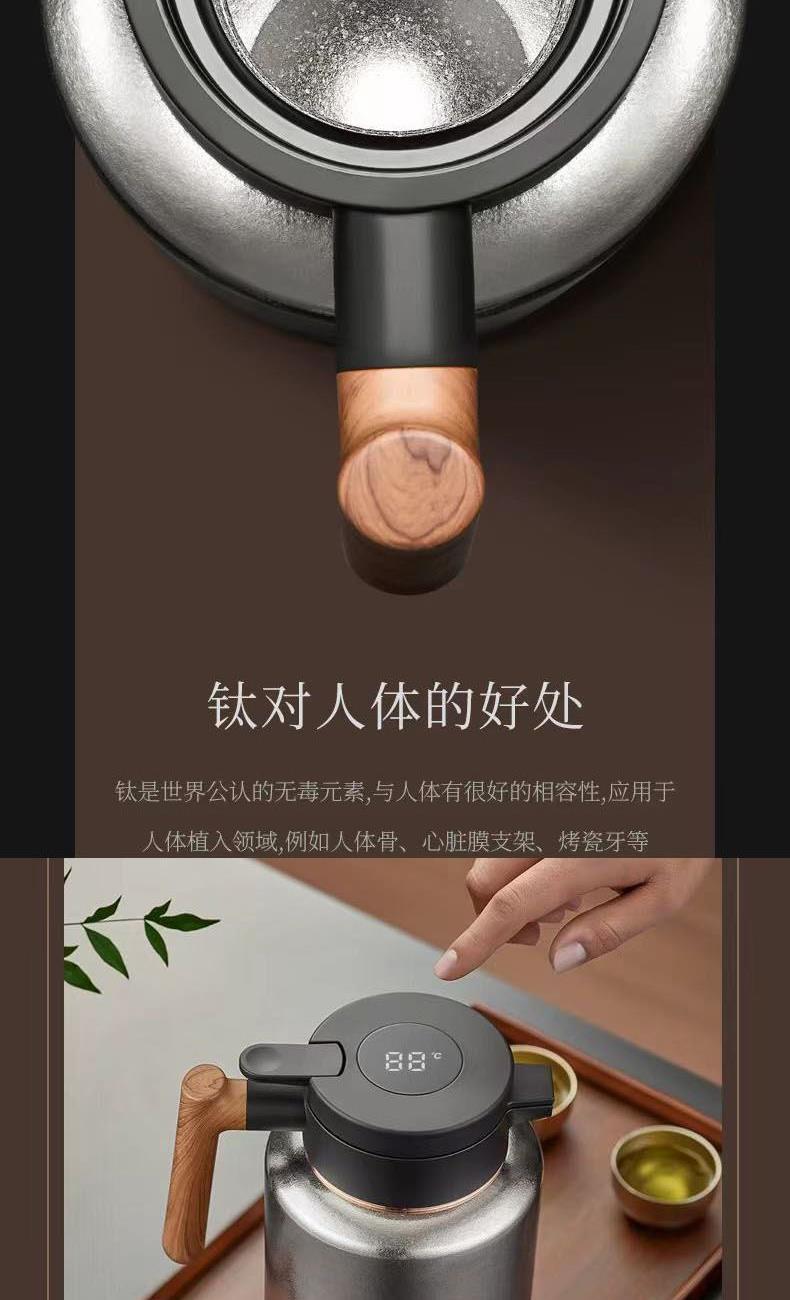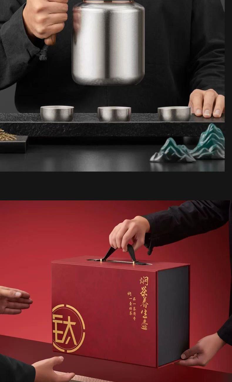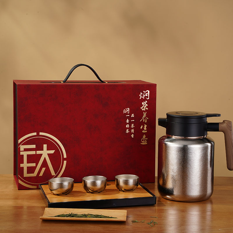 茶 壶 容 量 :1500ml 茶壶套装材质:内外纯钛 塑 料 件:PP (食品接触用) 密 封 圈:硅胶(食品接触用) 配 置:壶*1,杯子*3 彩盒尺寸:26.7*16.5*36.2CM 外箱尺寸:52*30*75CM 毛重(带礼盒):2008g 卖点: 杯体采用纯钛材质,含钛量达99.8%。 保冷保温,健康锁鲜。 材质健康安全,不与各类酸碱性饮品产生化学反应,安全无析出,放心盛放日常饮品。 表面色彩不喷漆上色,阳极氧化自然产生色彩,长期使用不掉色。