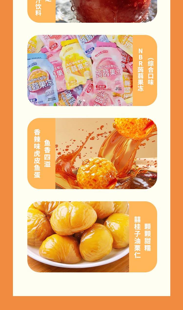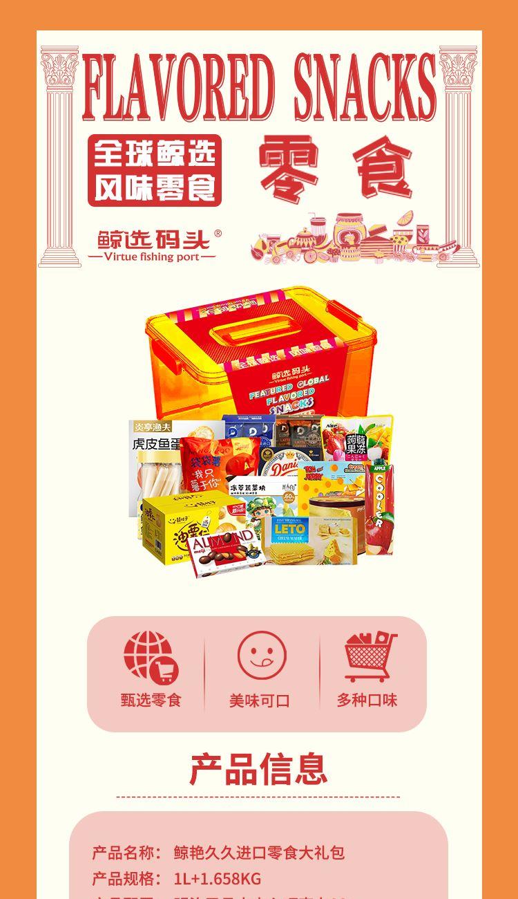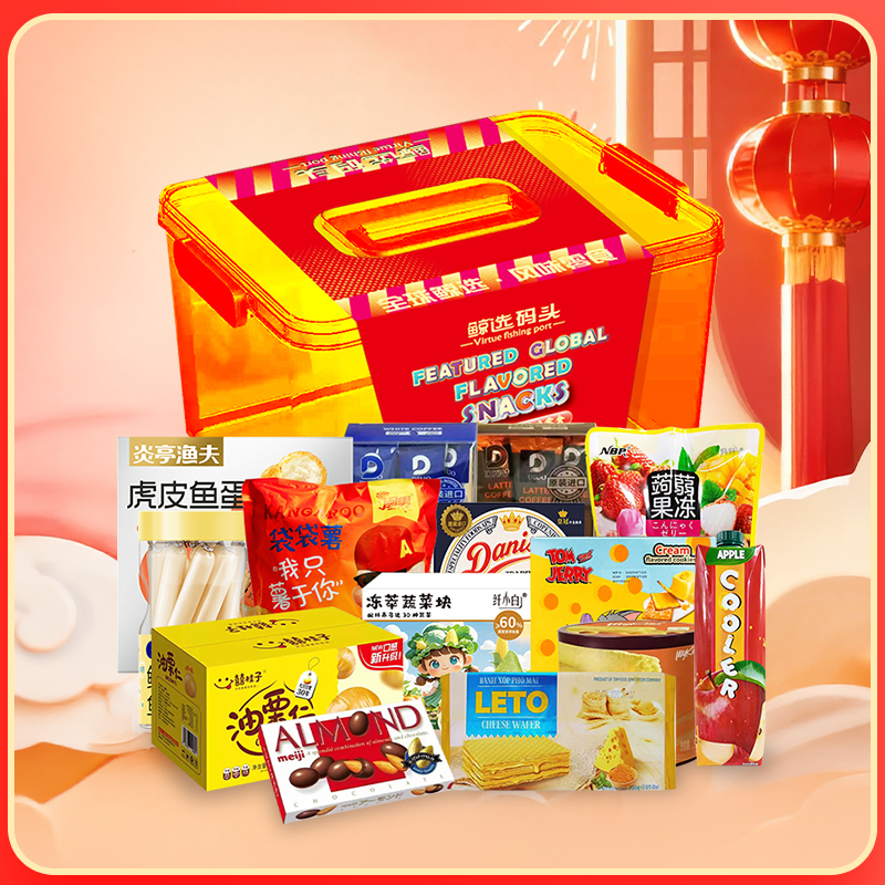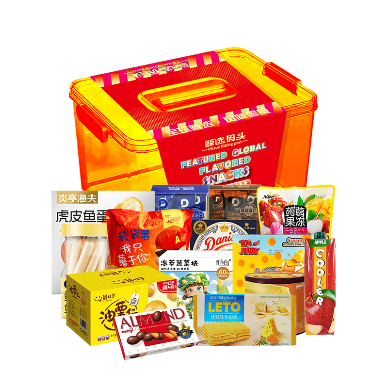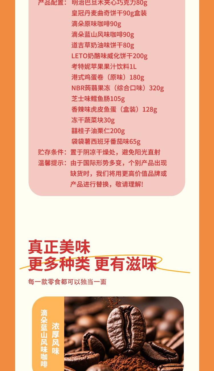 配置: 明治巴旦木夹心巧克力80g 皇冠丹麦曲奇饼干90g盒装 滴朵原味咖啡90g 滴朵蓝山风味咖啡90g 道吉草奶油味饼干80g LETO奶酪味威化饼干200g 考特妮苹果果汁饮料1L 港式鸡蛋卷(原味)180g NBR蒟蒻果冻(综合口味)320g 芝士味鳕鱼肠105g 香辣味虎皮鱼蛋(盒装)128g 冻干蔬菜块30g 囍桂子油栗仁200g 袋袋薯西班牙番茄味65g
