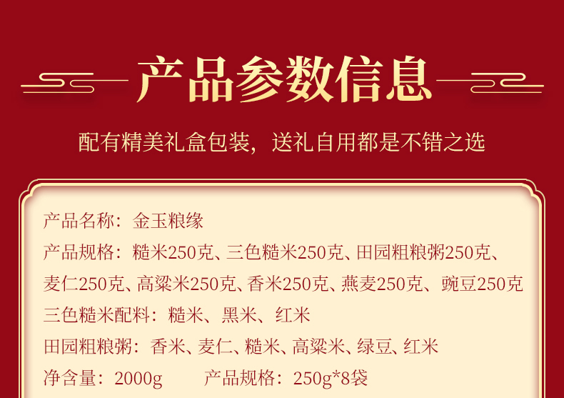 条 码:6972761600734 规 格:2kg,250g*8 包 装:真空方砖套彩盒 内 含:糙米、田园粗粮粥、豌豆、麦仁 燕麦、三色糙米、珍珠米、高粱米 礼 盒:36cm*32.5cm*4.5cm 手 袋:34cm*37.5cm*6cm 箱重量:26kg 箱尺寸:50*39*39(0.076方)