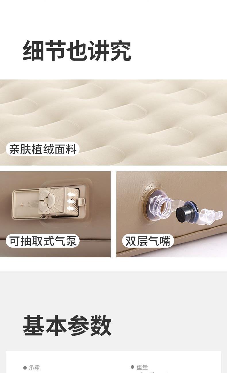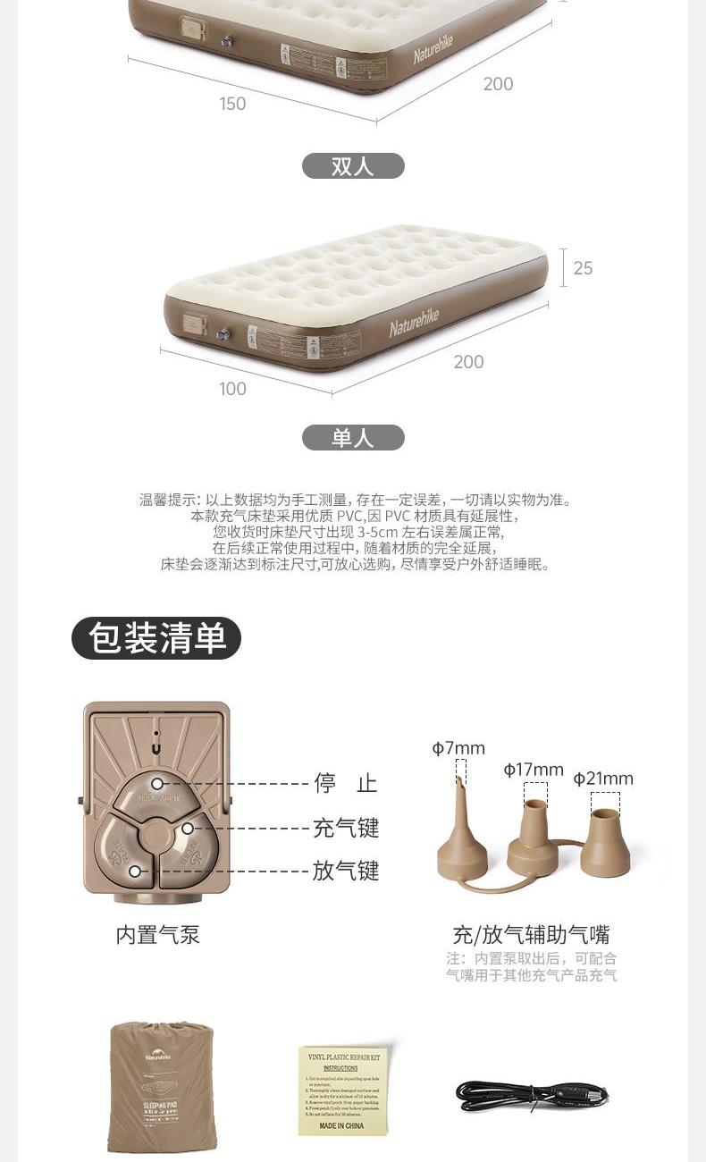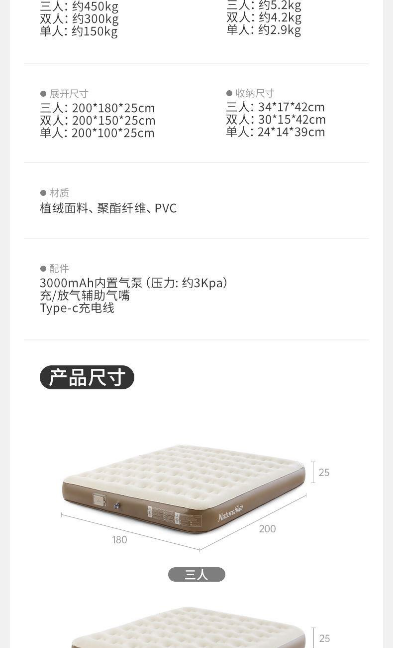 承重 三人:约450kg双人:约300kg 单人:约150kg 重量 三人:约5.2kg双人:约4.2kg单人:约2.9kg 展开尺寸三人:200x180x25cm三人:34x17x42cm双人:200x150x25cm双人:30x15x42cm单人:200x100x25cm单人:24x14x39cm 收纳尺寸 材质 植绒面料、聚酯纤维、PVC 配件 3000mAh内置气泵(压力:约3Kpa)充/放气辅助气嘴Type-c充电线