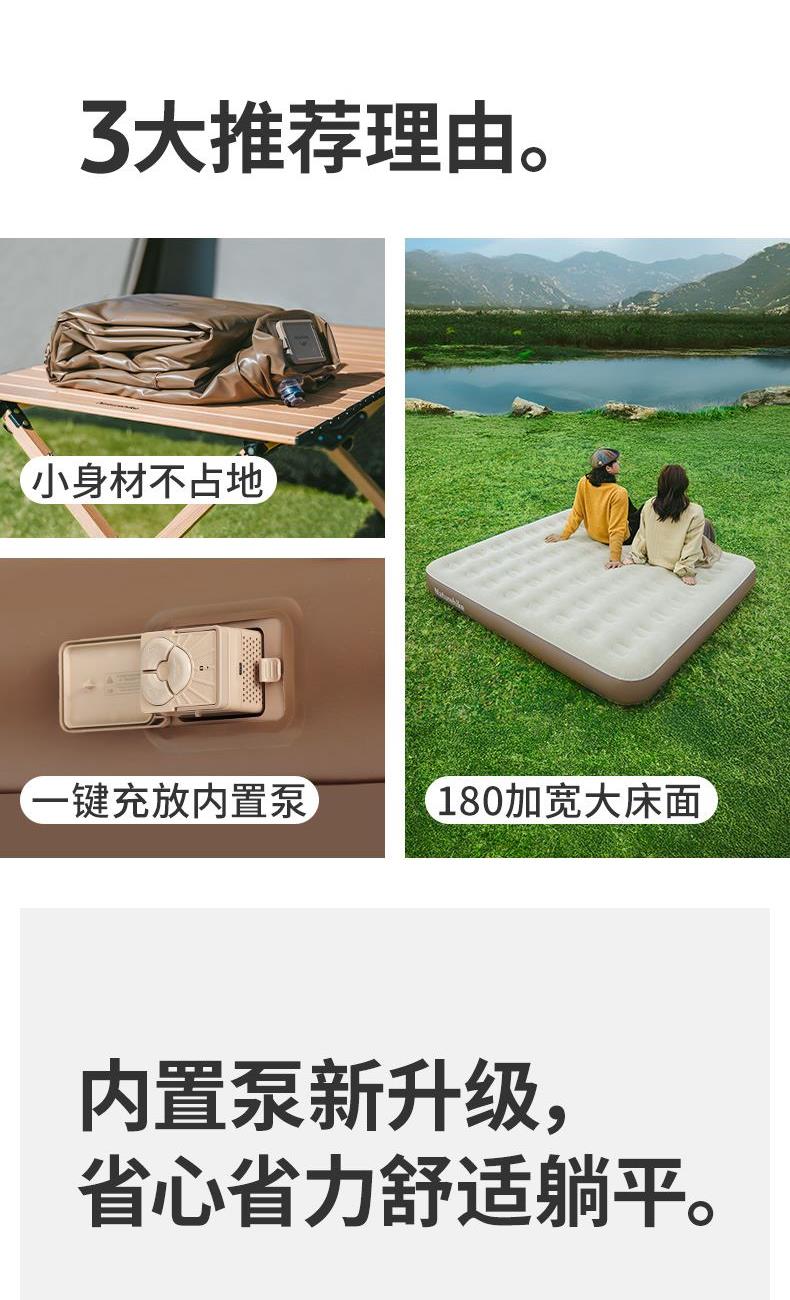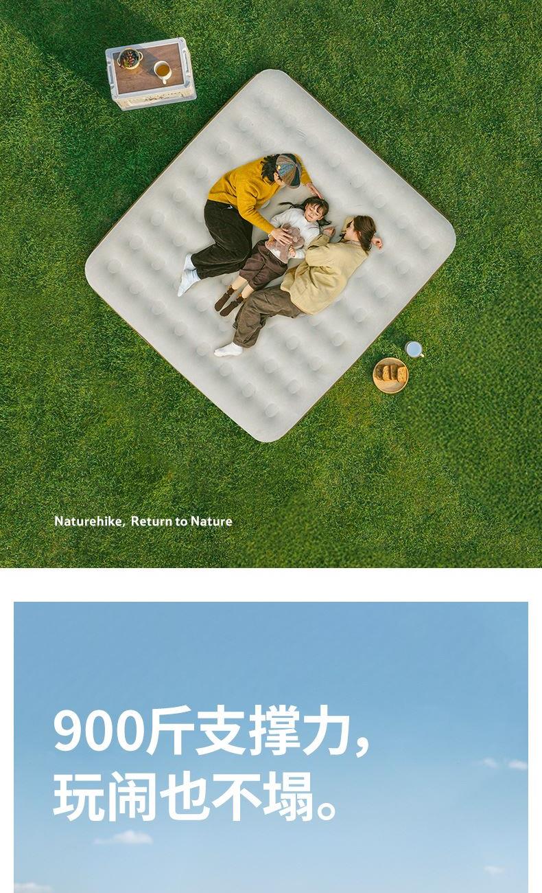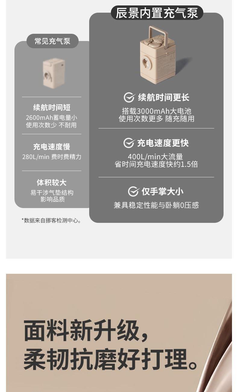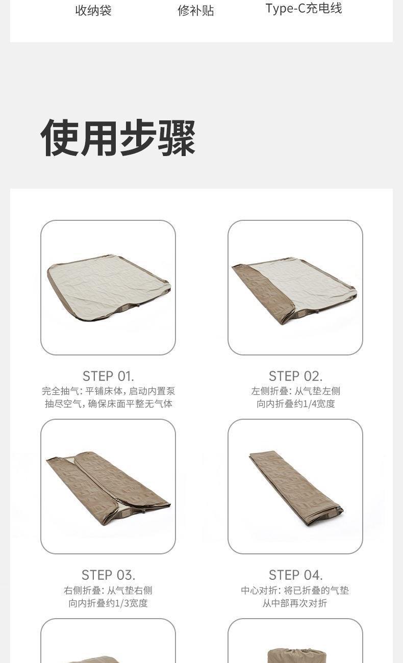 承重 三人:约450kg双人:约300kg 单人:约150kg 重量 三人:约5.2kg双人:约4.2kg单人:约2.9kg 展开尺寸三人:200x180x25cm三人:34x17x42cm双人:200x150x25cm双人:30x15x42cm单人:200x100x25cm单人:24x14x39cm 收纳尺寸 材质 植绒面料、聚酯纤维、PVC 配件 3000mAh内置气泵(压力:约3Kpa)充/放气辅助气嘴Type-c充电线