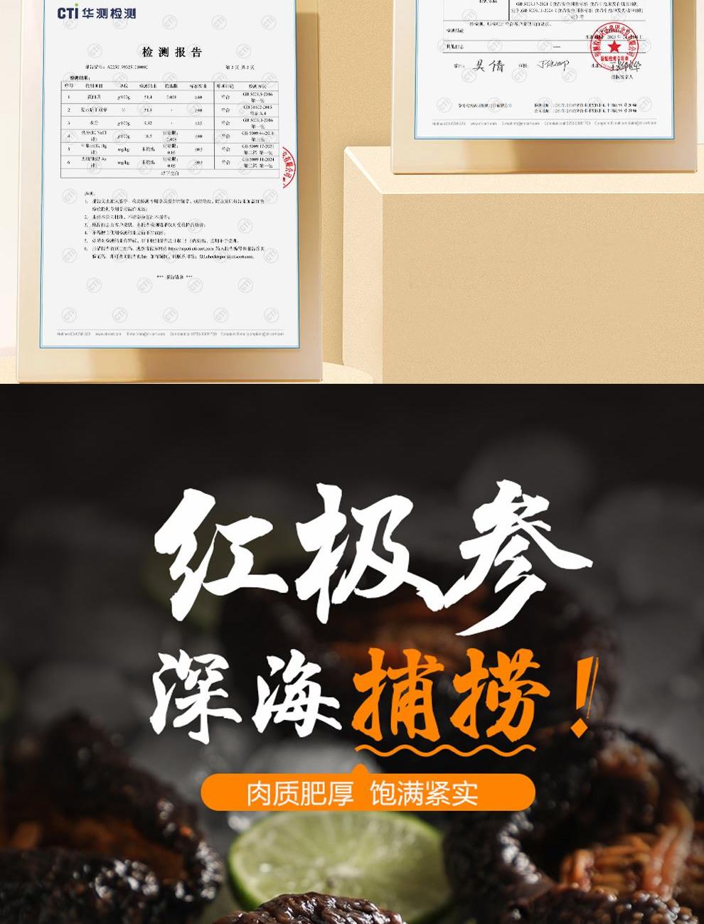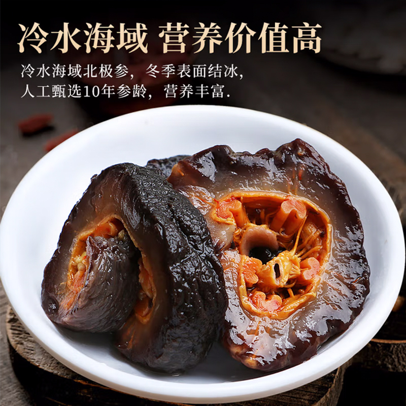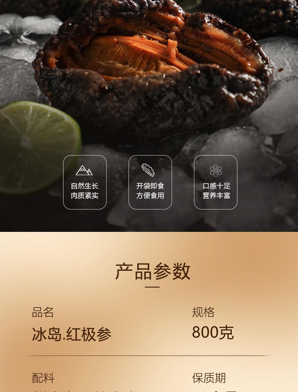 规格:红极参800克(200克*4袋) 卖点: 京润堂红极参选自生长于靠近北极圈的冰岛深海水域,冬季水面结冰,人迹罕至,且周围无任何工业污染,海参纯净度极高。