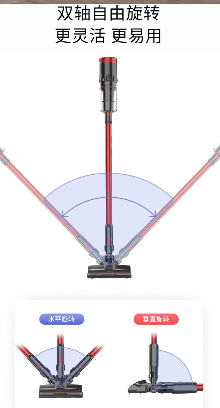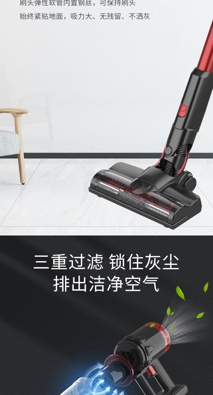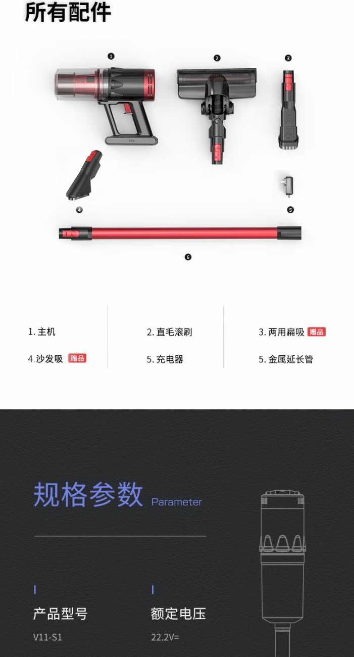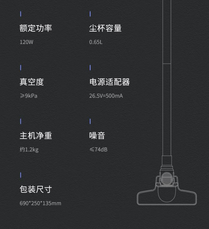 功 率:120W 噪 音:≤78dB 集 尘 容 量:0.65L 灰尘储藏方式:尘杯 电 池 容 量:2200mAh 吸 力MAX:≥9Kpa 低 档 吸 力:≥5Kpa 续航时间MAX:≥18min 低档续航时间:≥35min 简约中国红 轻量化机身 ECO/MAX模式随心调 使用时间可以达到40分钟 推杆/手持多功能 轻音低噪 强劲吸力