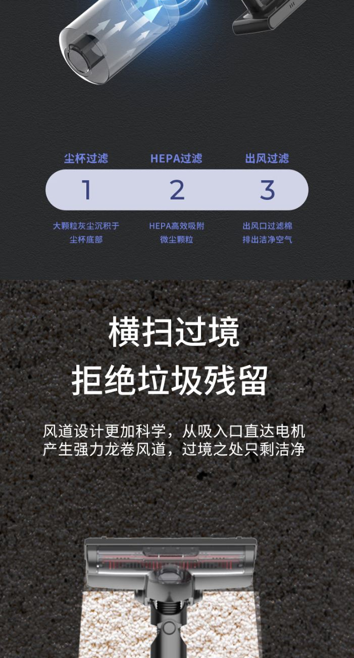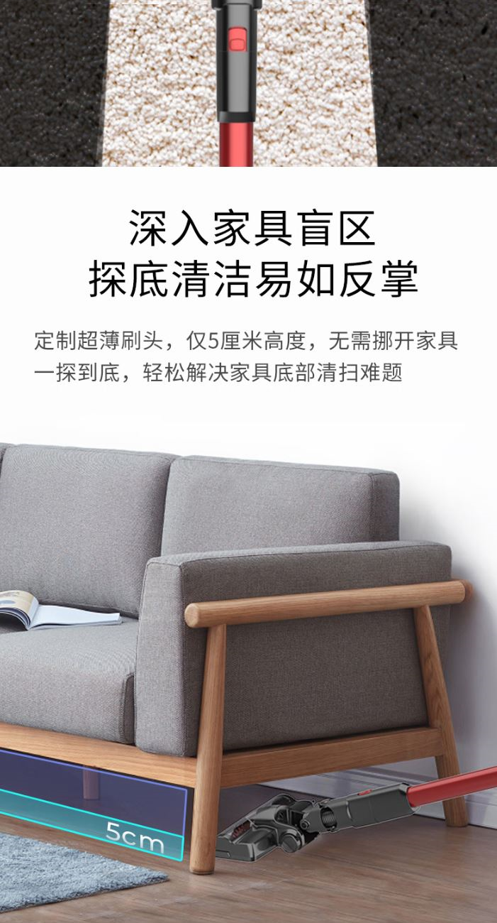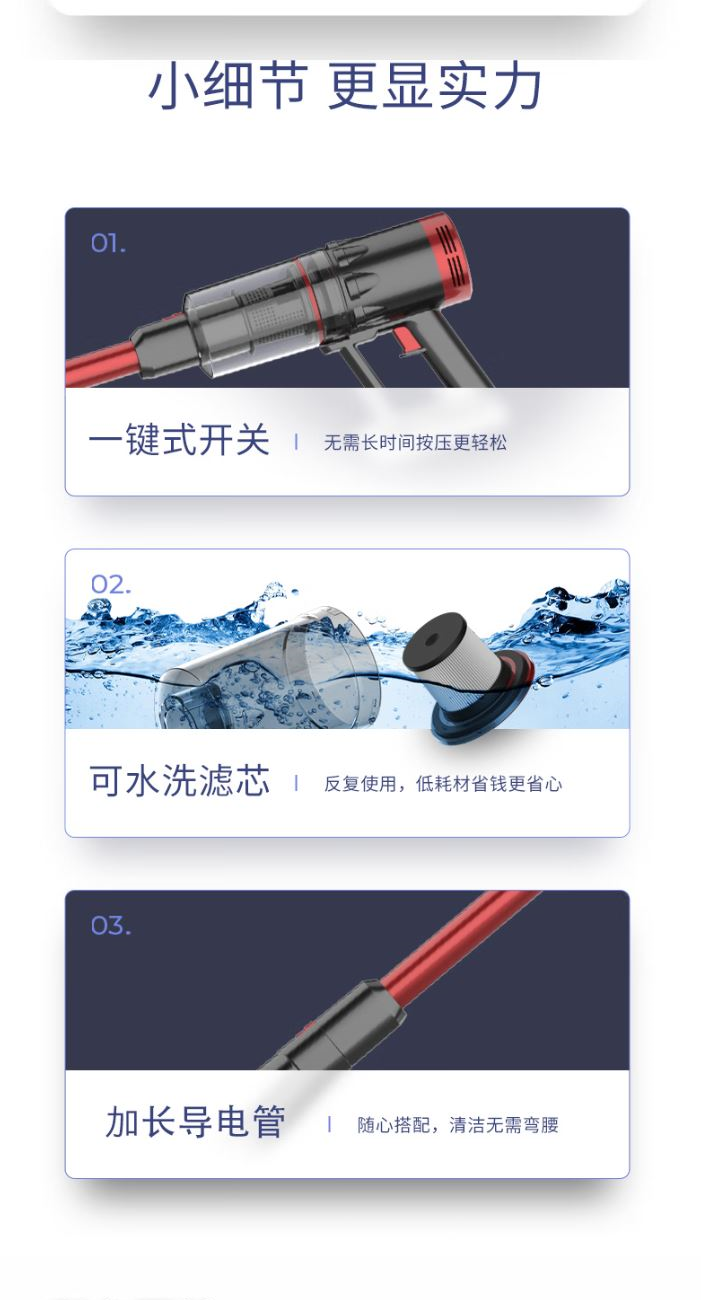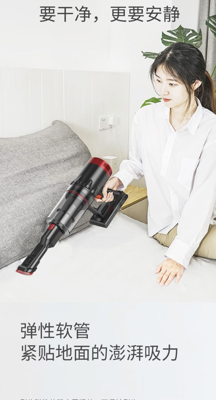 功 率:120W 噪 音:≤78dB 集 尘 容 量:0.65L 灰尘储藏方式:尘杯 电 池 容 量:2200mAh 吸 力MAX:≥9Kpa 低 档 吸 力:≥5Kpa 续航时间MAX:≥18min 低档续航时间:≥35min 简约中国红 轻量化机身 ECO/MAX模式随心调 使用时间可以达到40分钟 推杆/手持多功能 轻音低噪 强劲吸力