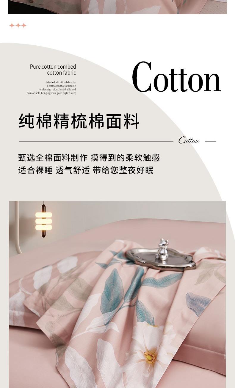 产品型号:S02025002 被 套:200*230cm 床 单:230*245cm 枕 套:48*74cm*2 面 料:棉 装 箱 数:7 纯棉精梳棉面料,活性印染,手感细腻、亲肤透气; 花型设计为百合花,与玉色相搭配,寓意美好; 天地盖礼盒包装,自用送礼两相宜