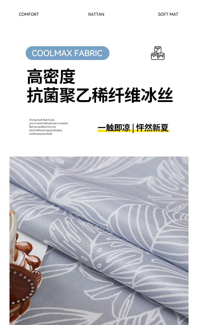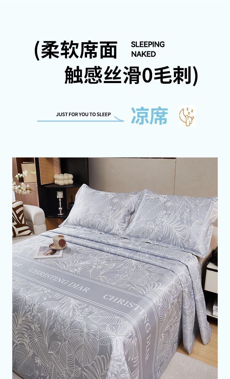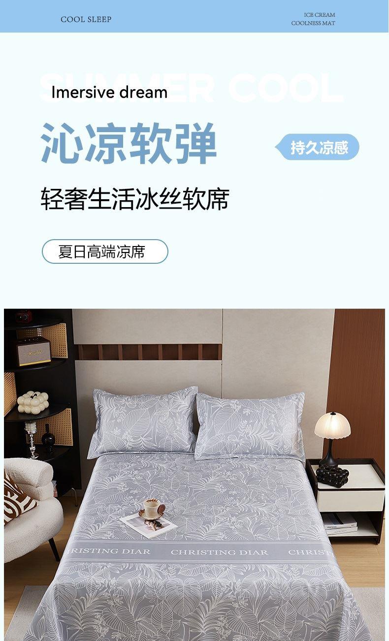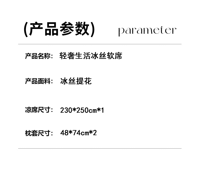 凉席:230*250cm*1 枕套:48*74cm*2 面料:冰丝提花 产品特点: 1.选用冰丝纤维,机洗折叠不变形。 2.物理凉感,凉而不冰,提花色织工艺,久用如新。 3.精美图案,健康环保。可手洗机洗不易褪色。