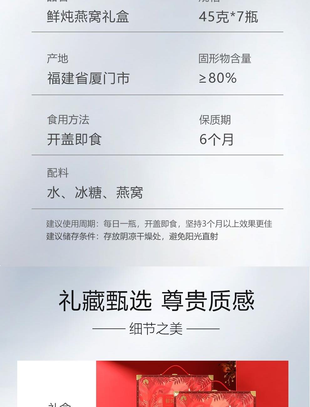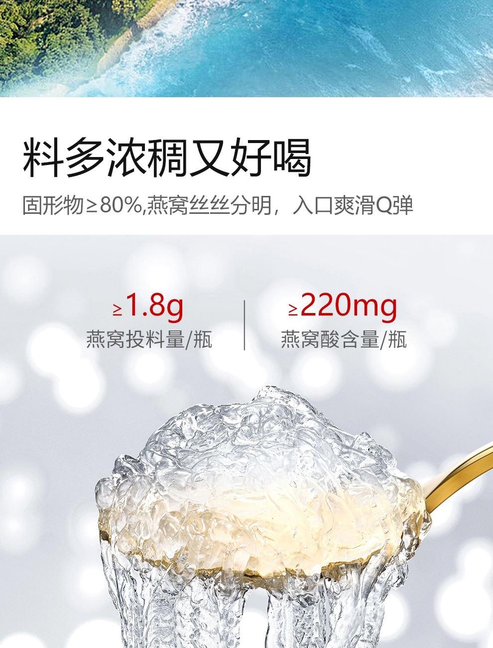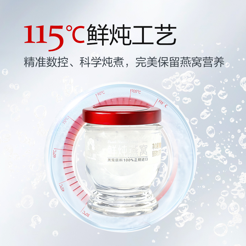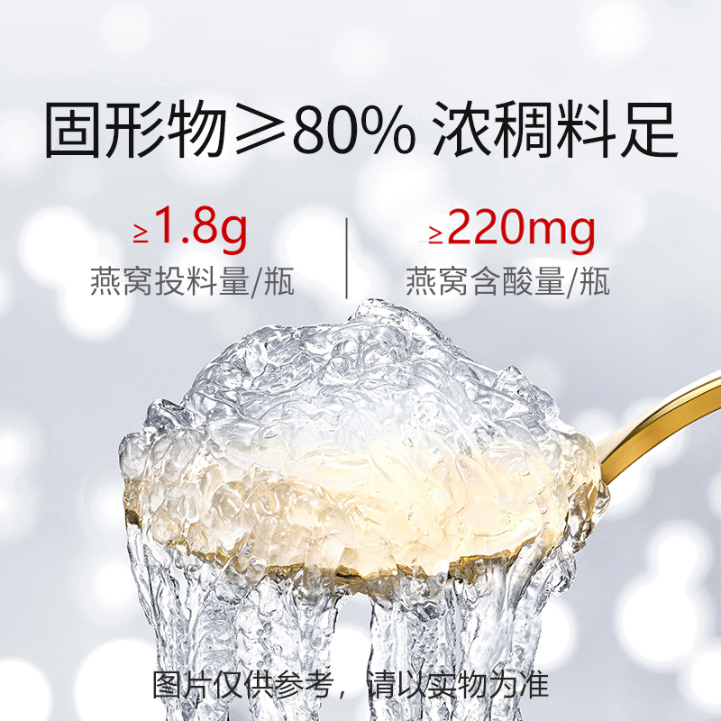 规格:315克(45克*7瓶)、燕窝固形物不低于85%、每瓶添加干燕窝:1.8克 卖点:鲜炖燕窝作为一款便捷、新鲜且保留燕窝本真营养的滋补品,凭借其独特的优势深受消费者喜爱,核心卖点:新鲜现炖,营养锁鲜“鲜” 字当头,拒绝久存:区别于传统干燕窝需自行泡发、炖煮的繁琐,鲜炖燕窝采用 “现订现炖” 或 “短保质期” 模式,以纯净水搭配燕窝隔水鲜炖,不添加防腐剂、增稠剂等成分,保留燕窝的天然营养(如燕窝酸、水溶性蛋白质)和嫩滑口感。