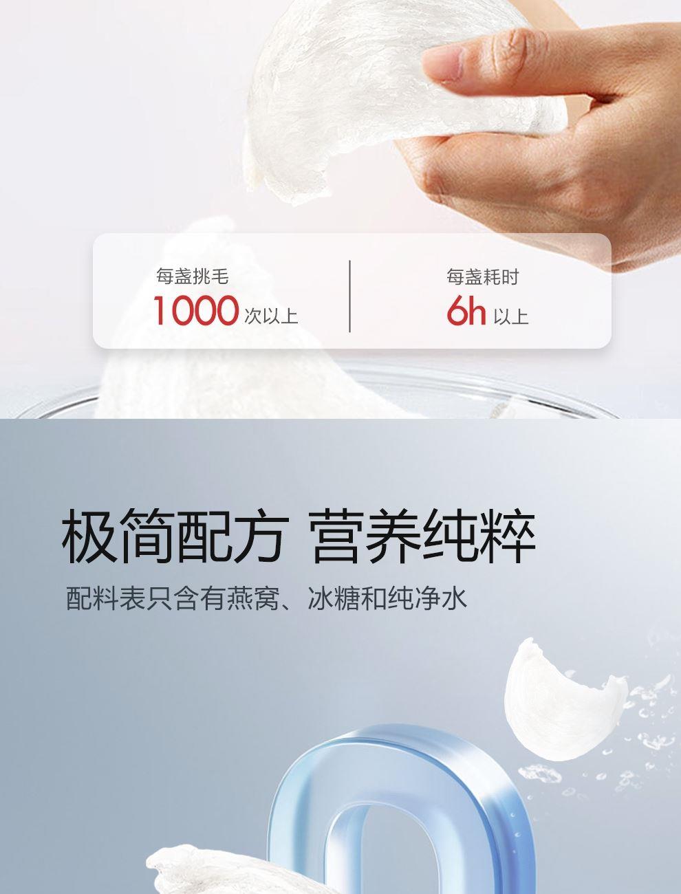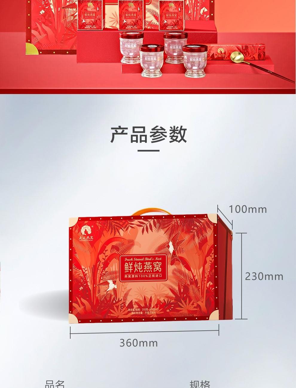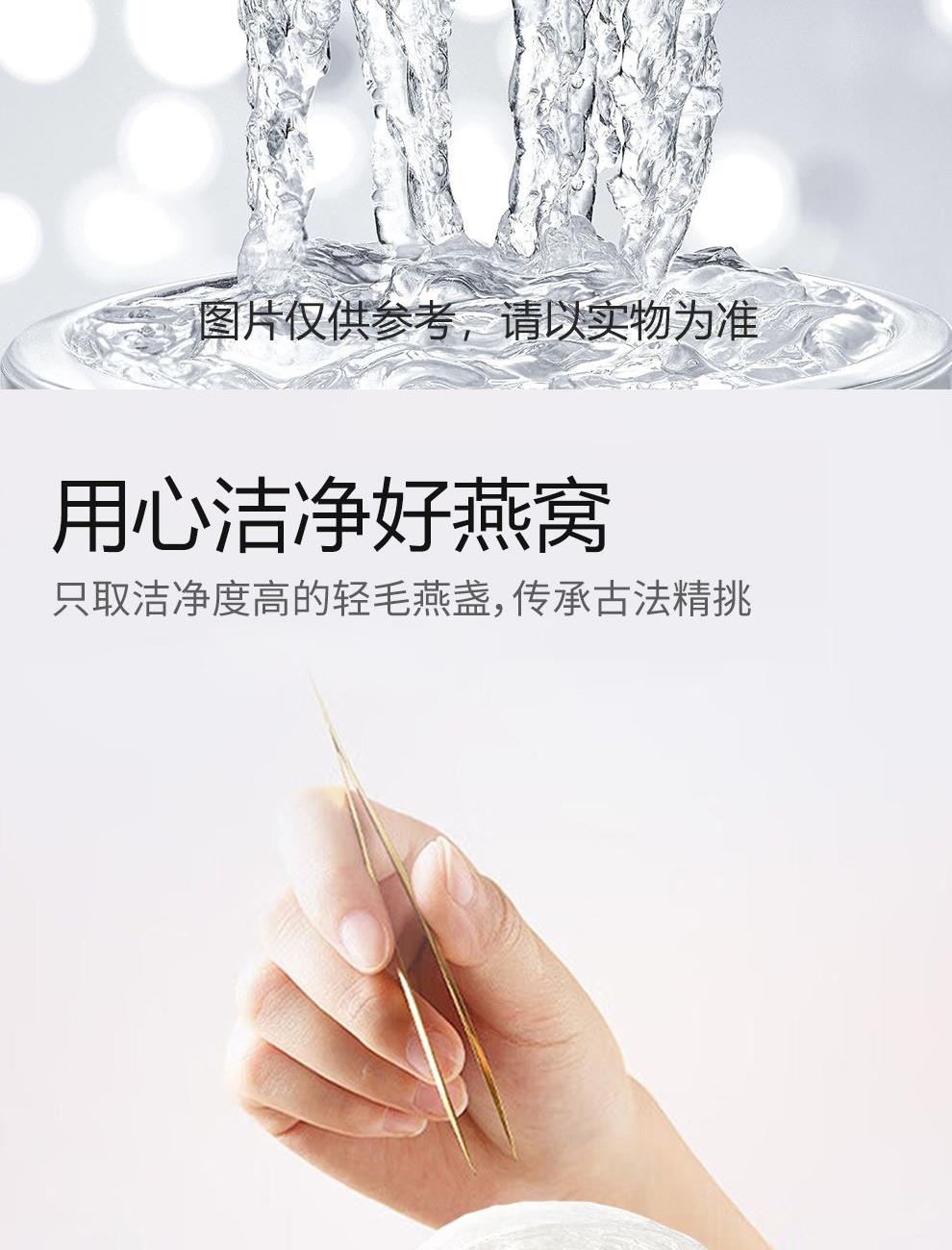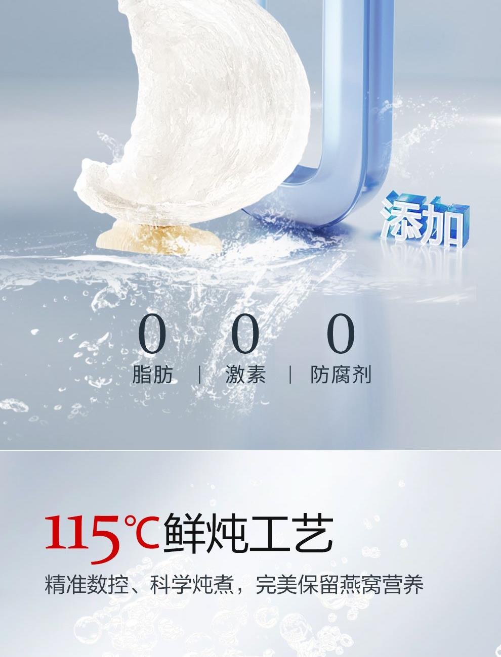 规格:315克(45克*7瓶)、燕窝固形物不低于85%、每瓶添加干燕窝:1.8克 卖点:鲜炖燕窝作为一款便捷、新鲜且保留燕窝本真营养的滋补品,凭借其独特的优势深受消费者喜爱,核心卖点:新鲜现炖,营养锁鲜“鲜” 字当头,拒绝久存:区别于传统干燕窝需自行泡发、炖煮的繁琐,鲜炖燕窝采用 “现订现炖” 或 “短保质期” 模式,以纯净水搭配燕窝隔水鲜炖,不添加防腐剂、增稠剂等成分,保留燕窝的天然营养(如燕窝酸、水溶性蛋白质)和嫩滑口感。