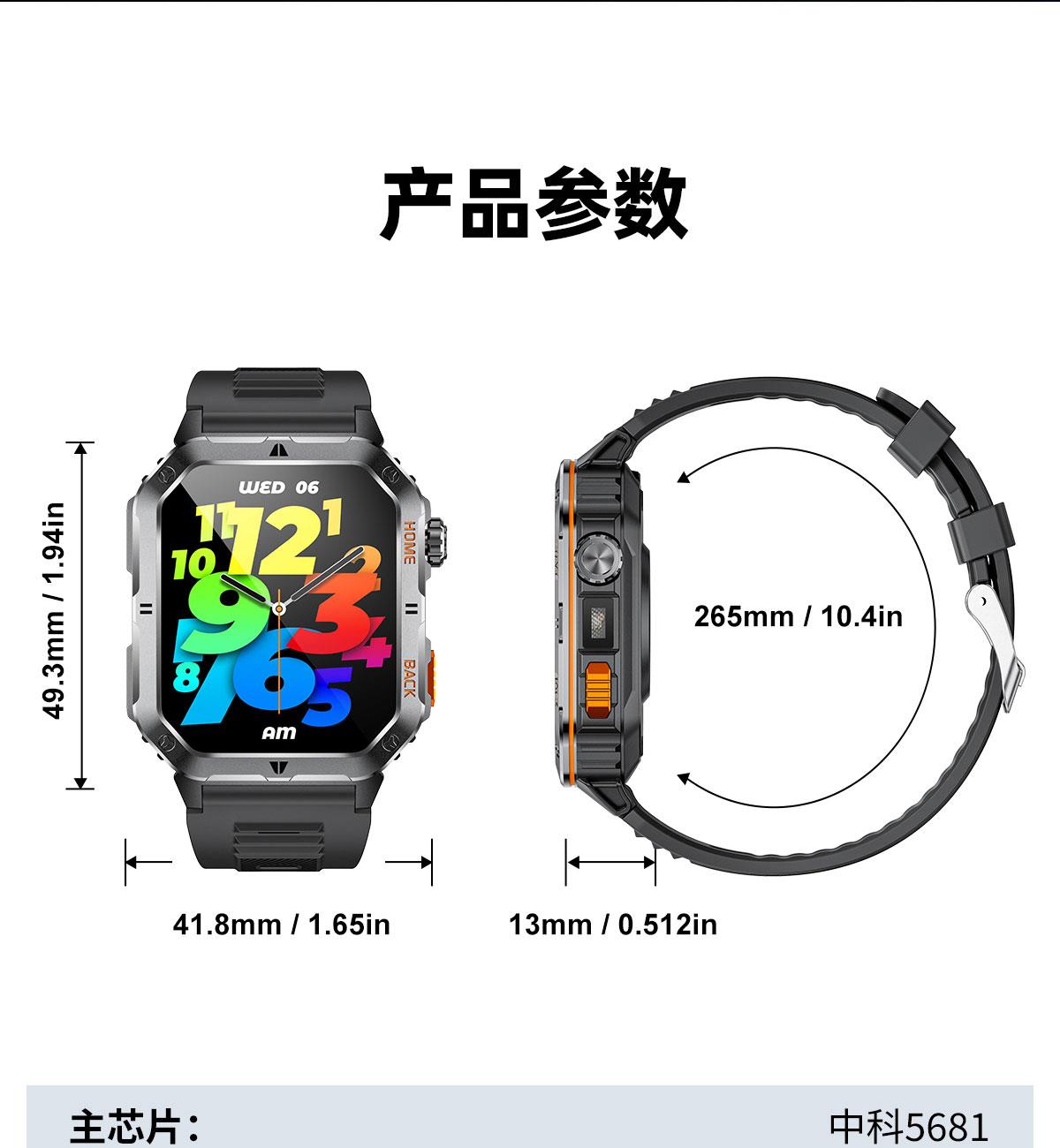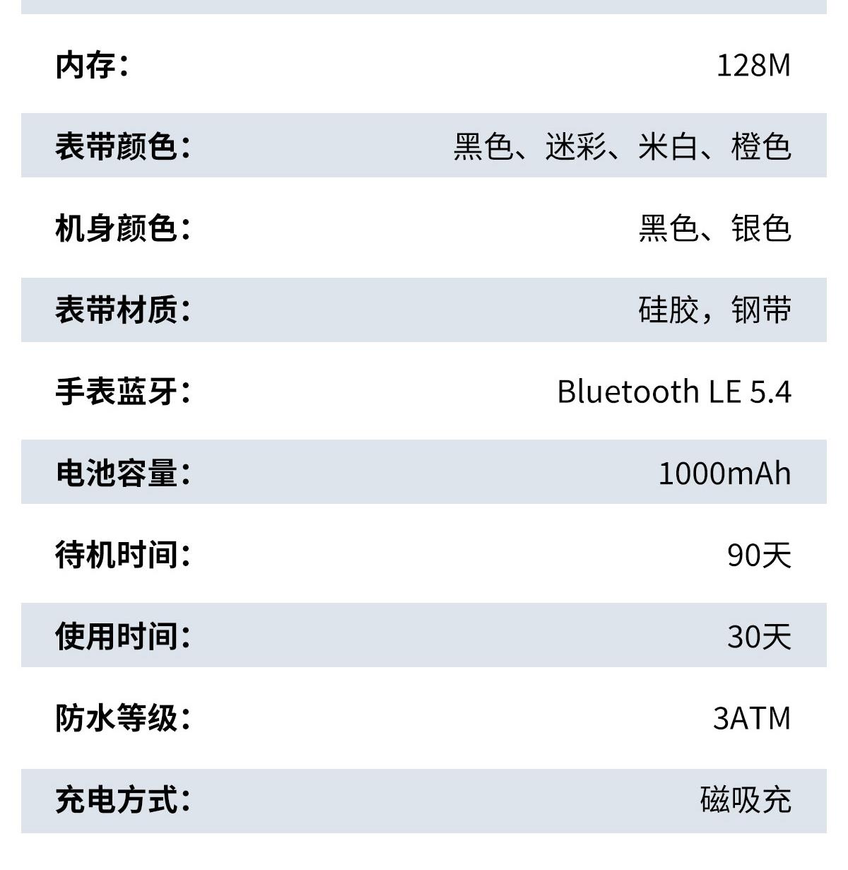 CPU:中科5681 屏幕尺寸:2.01 inch IPS彩屏、240*296 使用时间:3-5天 充电方式:磁吸式 电池容量:1000mAh 智能手表尺寸(mm):49.3*41.8*13mm,表带总长255mm,宽22mm 产品材质:锌合金+ABS防火材料 产品净重:45g 裸机 APP: FitCloudPro 防水等级:IP67 产品清单:手表+充电线+说明书+包装盒 2.01 inch IPS彩屏、240*296、表盘市场、扫码连接、多套UI菜单、语音通话、OTA升级、计步、卡路里、运动模式、抬手亮屏、睡眠监测、来电提醒、消息提醒、久坐提醒、闹钟提醒、秒表、表盘切换、3D动态表盘、音乐播放、呼吸训练、整点测量、心率、血压、血氧、计算器、自定义表盘、亮度调节、天气、独立闹钟、运动轨迹、游戏等新功能