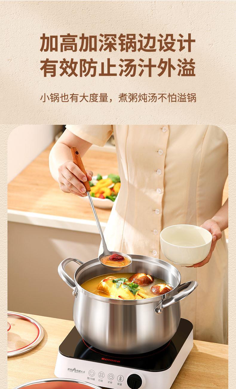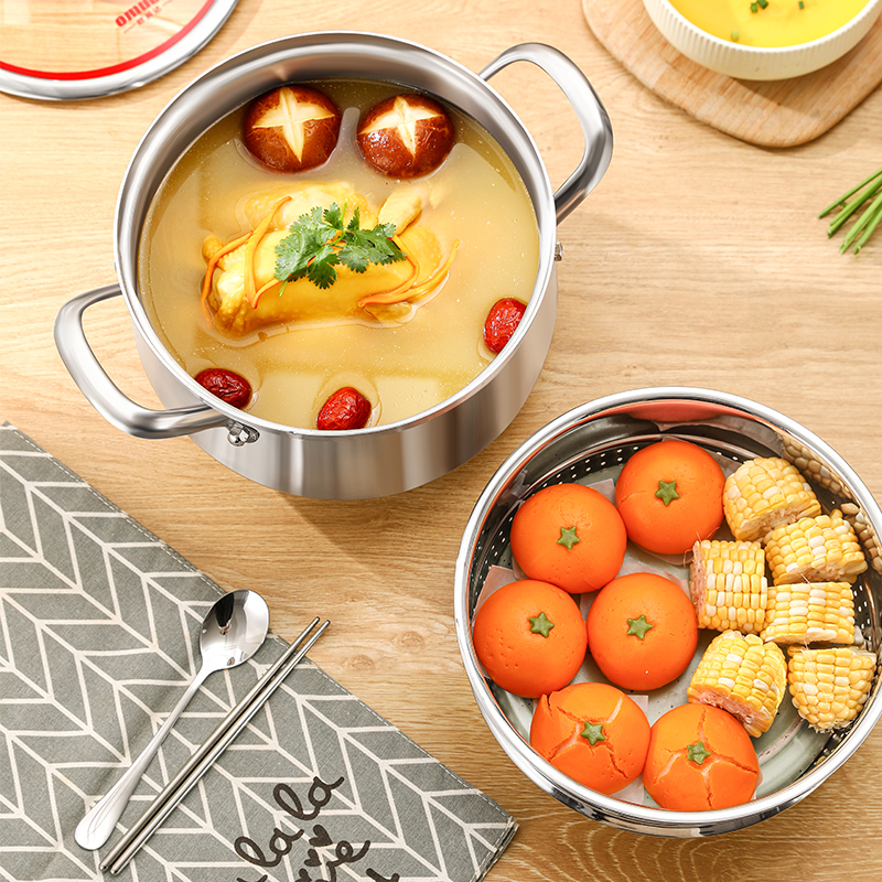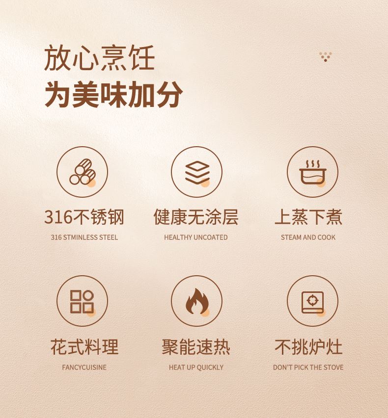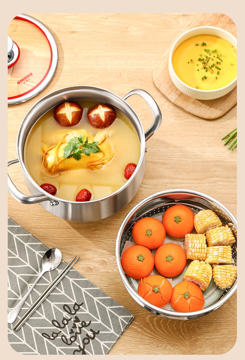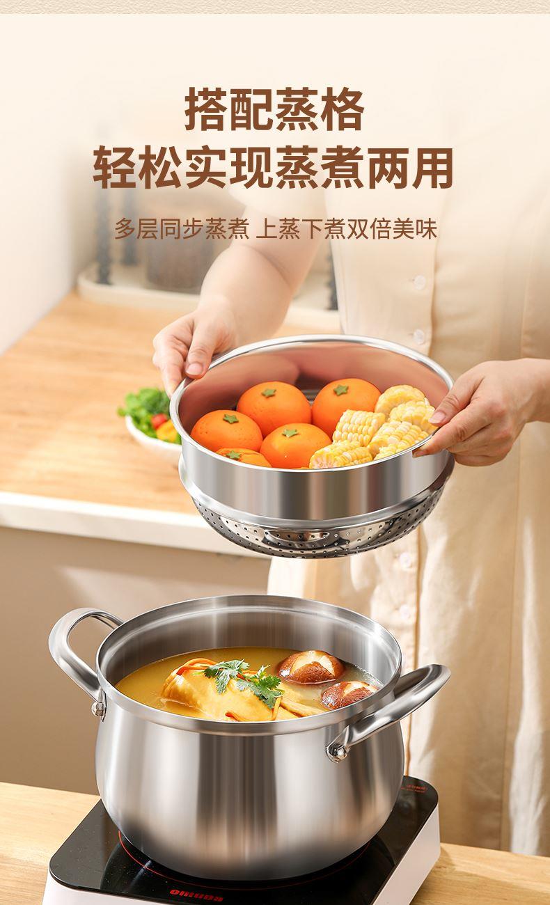 材质:316不锈钢 功能:①小巧锅身+大容量的黄金比例,轻松满足宝宝1-3餐辅食量,新手妈妈操作零负担。 ②316不锈钢,烹饪更健康更安心。 ③鼓型锅身一体冲压成型,无铆钉设计,清洗更方便 ④ 搭配蒸格,轻松实现蒸煮两用,加高加深锅边设计,有效防止汤汁外溢 ⑤电磁炉/燃气灶/电陶炉通用不挑灶具