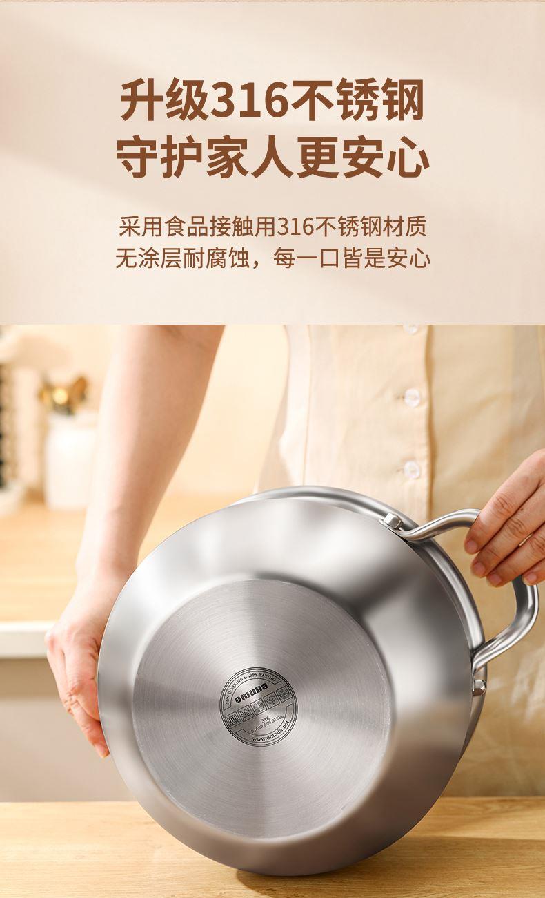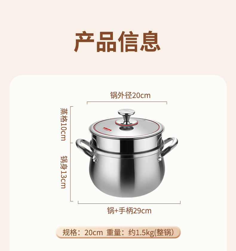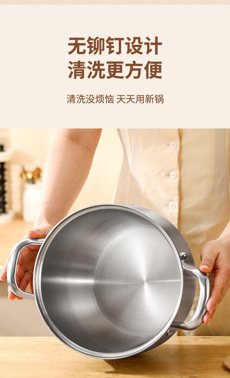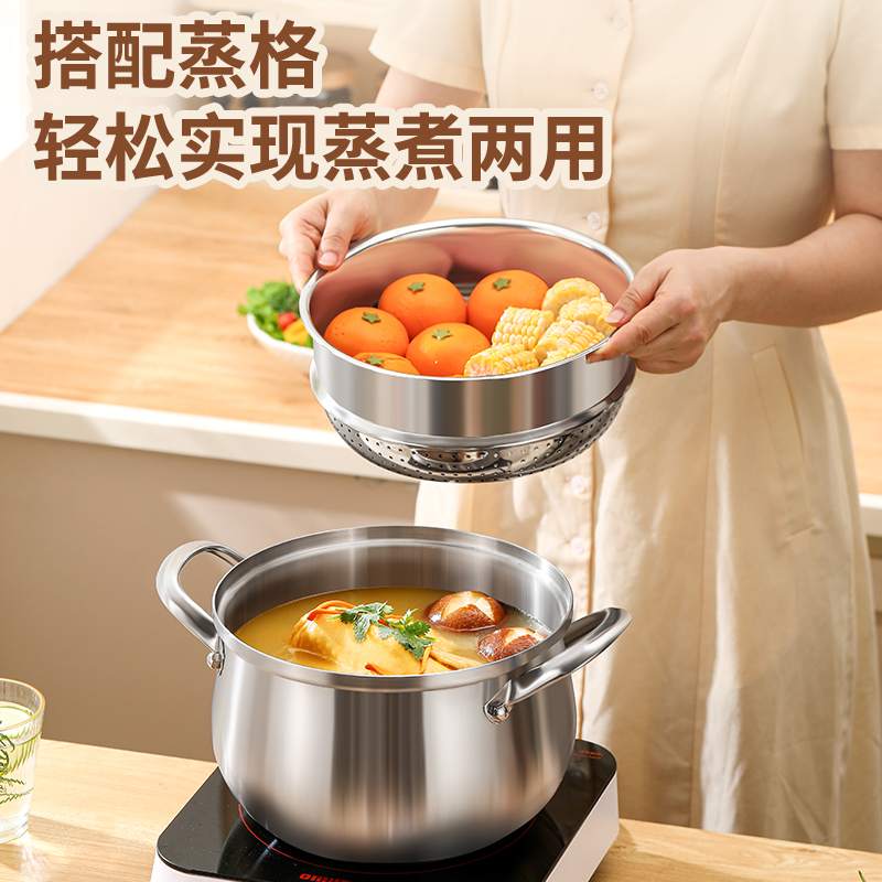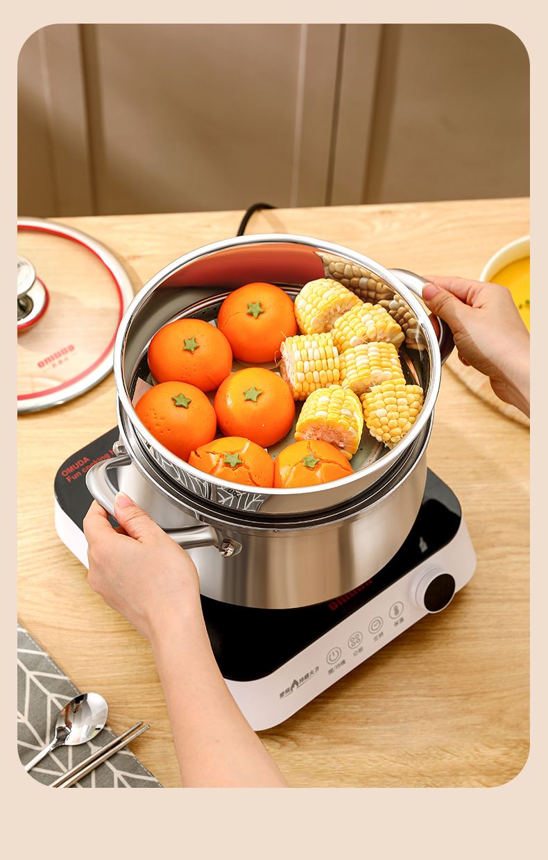 材质:316不锈钢 功能:①小巧锅身+大容量的黄金比例,轻松满足宝宝1-3餐辅食量,新手妈妈操作零负担。 ②316不锈钢,烹饪更健康更安心。 ③鼓型锅身一体冲压成型,无铆钉设计,清洗更方便 ④ 搭配蒸格,轻松实现蒸煮两用,加高加深锅边设计,有效防止汤汁外溢 ⑤电磁炉/燃气灶/电陶炉通用不挑灶具