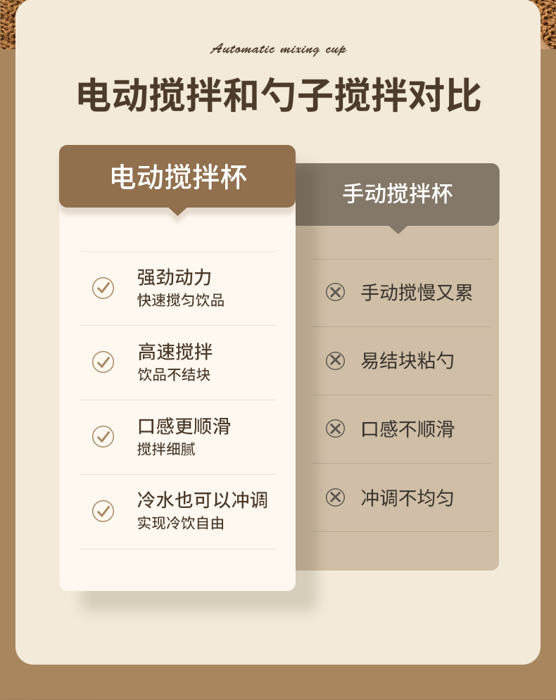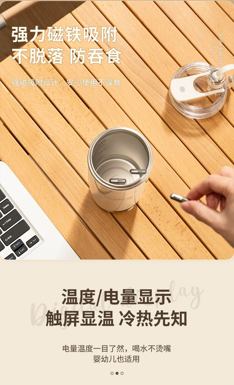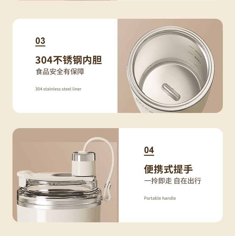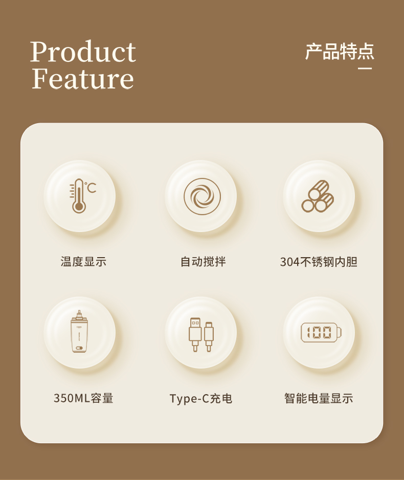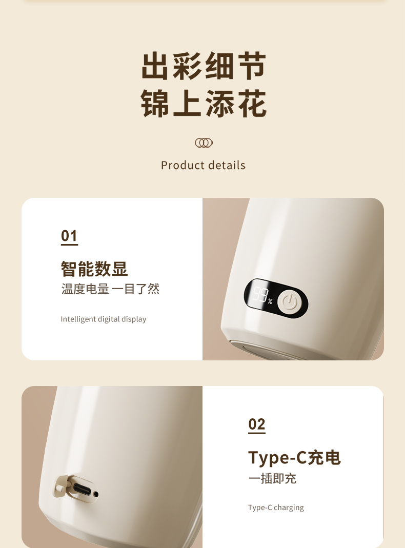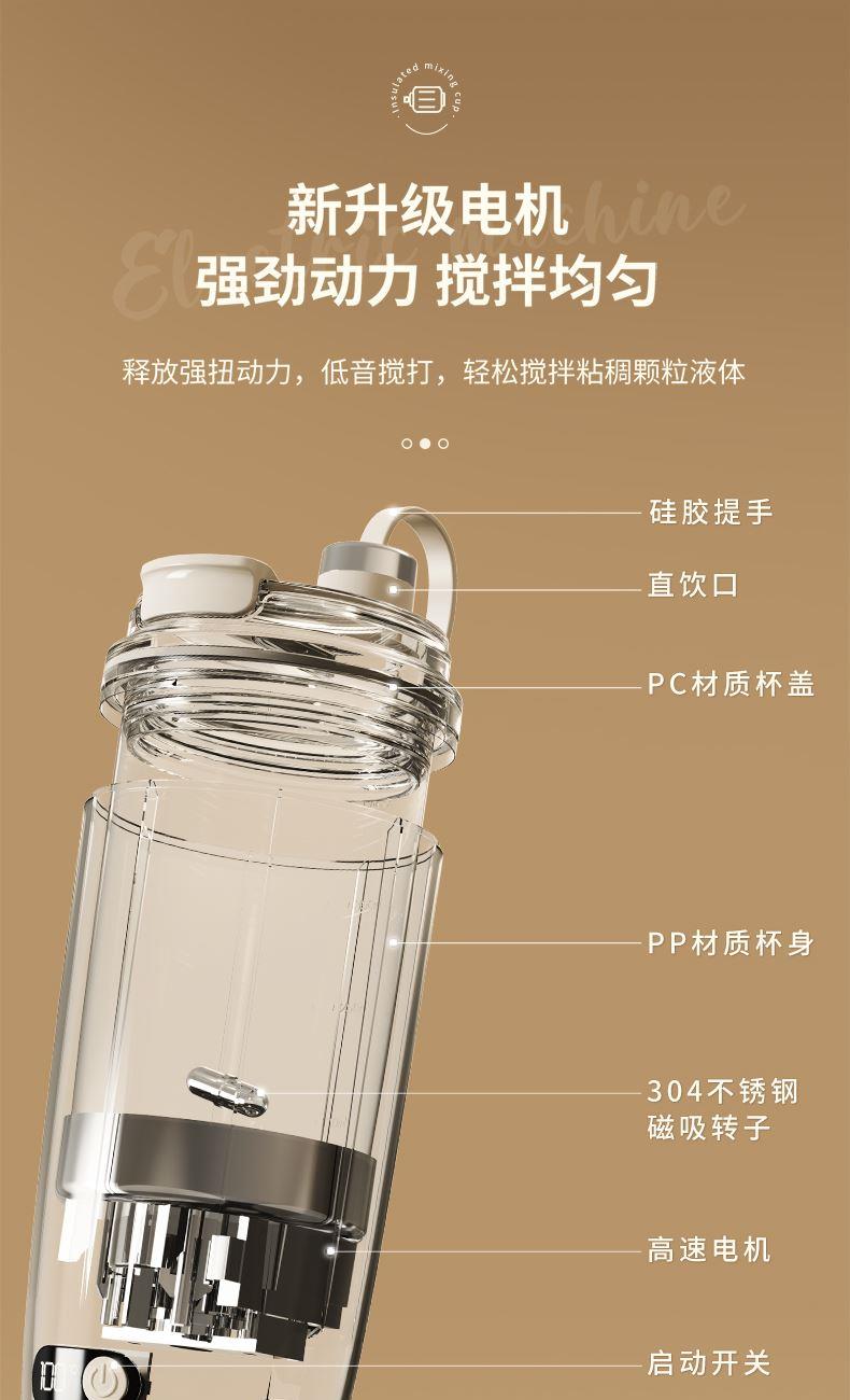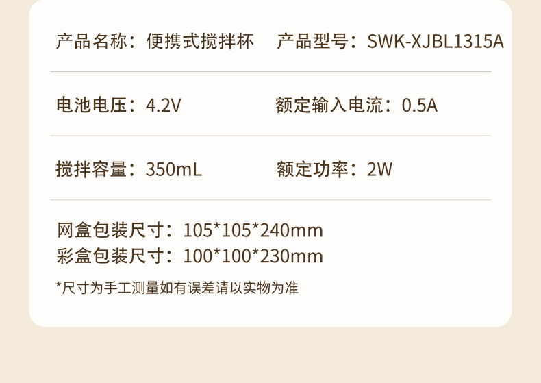 产品颜色:米白 产品材质:PP+304不锈钢 充电电压:4.2V 额定容量:350mL 额定频率:50Hz 额定功率:2W 单台净重:0.30kg 单台毛重:0.45kg 产品尺寸:84*91*207mm 内箱尺寸:100*100*230mm 外箱尺寸:435*435*485mm 产品清单:主机*1/电源线*1/说明书*1 告别手动摇晃,电动搅拌,持久续航,咖啡口感更好 304不锈钢内胆,耐腐抗氧告别异味 大口径设计,易清洗不藏污垢 Type-C充电接口,多种充电方式适用