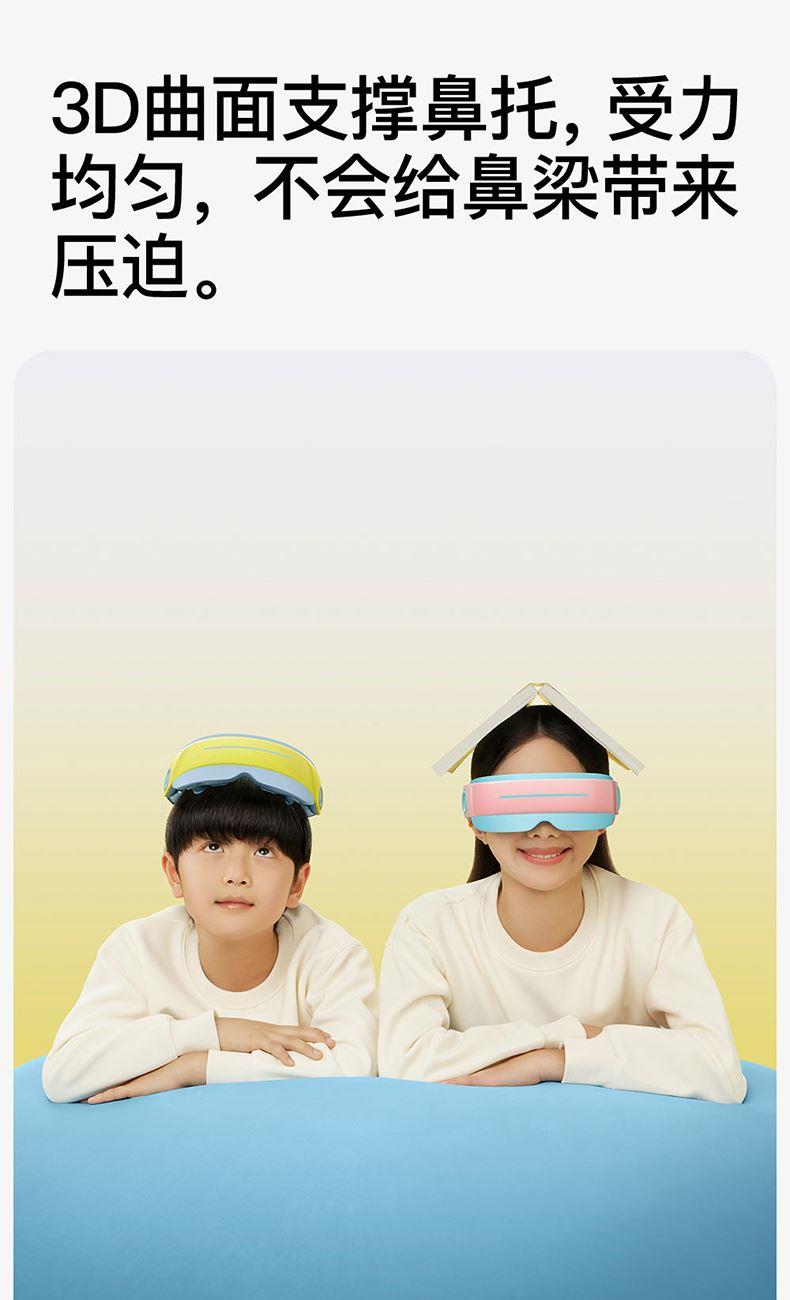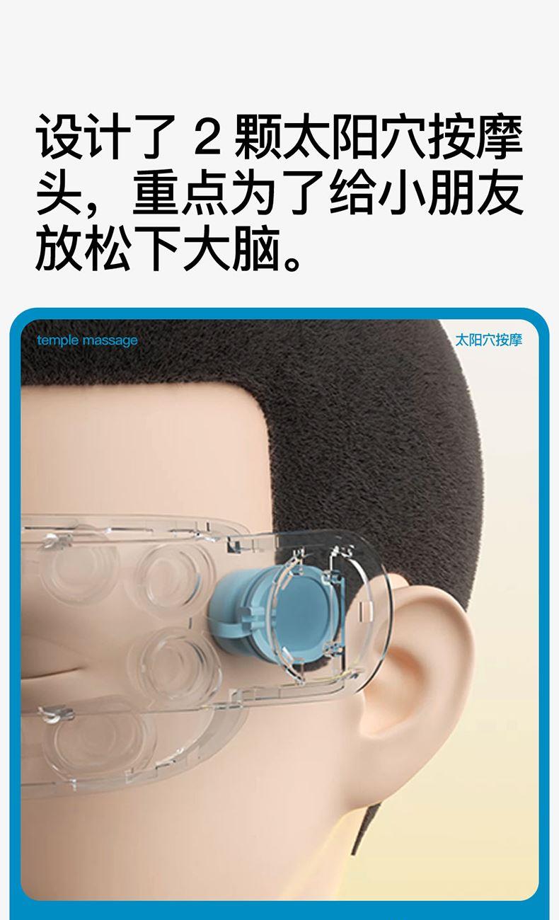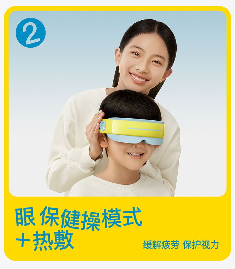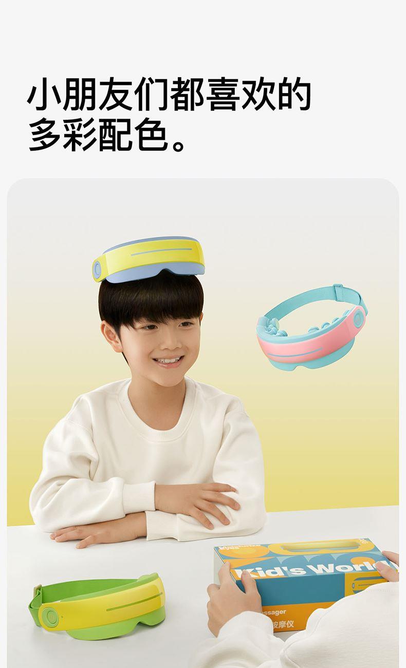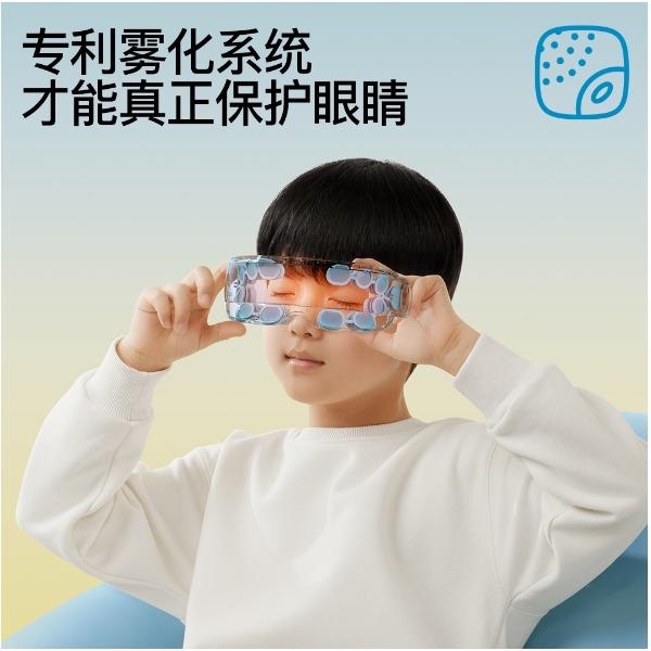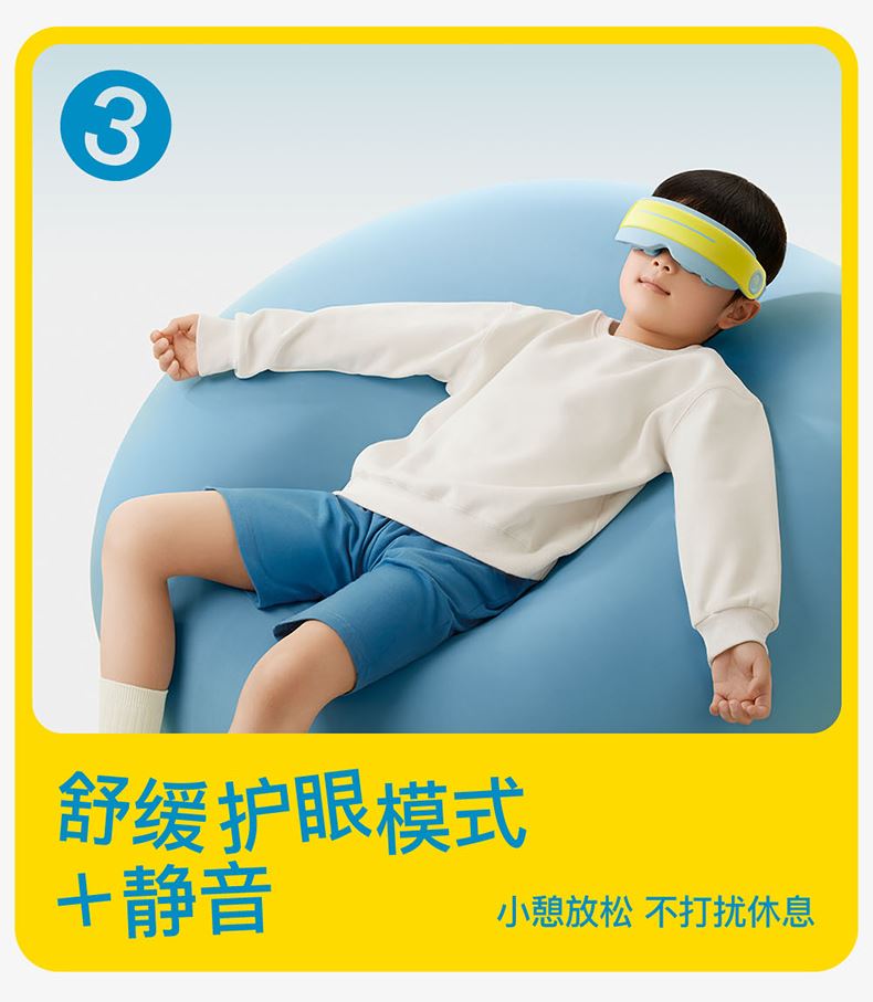 产品颜色:粉蓝色、黄绿色、黄蓝色 产品材质 ABS+硅胶+布料 产品重量 218g 电池容量 1800mAh 充电时间 3~4小时 模式调节 4种 续航时间 150分钟/小雾量+低温;80分钟/持续温化+高温 水箱容量 6.5~7ml 热敷温度 38℃/低温档;42℃/高温档 额定输入 5V/1A 产品功能 ●超声微米雾化,超大雾量滋润双眼。 ●仿生指压震动,点对点按揉眼周穴位, ●环眼式热敷,让热感随着按摩一起深入疲惫穴位,放松全眼。 ●经1000+次优化测试,设计适合的机身弧度,更贴合孩子的头型、脸型。 ●设计了 2 颗太阳穴按摩头,重点为了给小朋友放松下大脑。 ●紫外线水箱消毒>99.9%妈妈安心。水箱是可拆卸的,边边角角都可以清洗到。 ●绑带和机身都是有弹力8-15岁的孩子都好用,带久了也不会勒脑袋。 ●按摩头用的是奶嘴同款材质,肌肤敏感的小朋友也能用。 ●满电1次,续航1周,外出用也方便。 ●4个护眼方案, 适合4个不同场景:模式1:活力护眼模式+冷敷,学习思路清晰;模式2: 眼保操模式+热敷,缓解疲劳 保护视力;模式3:舒缓护眼模式+静音,小憩放松 不打扰 休息;模式4:睡眠模式+白噪音,深度放松更助眠。