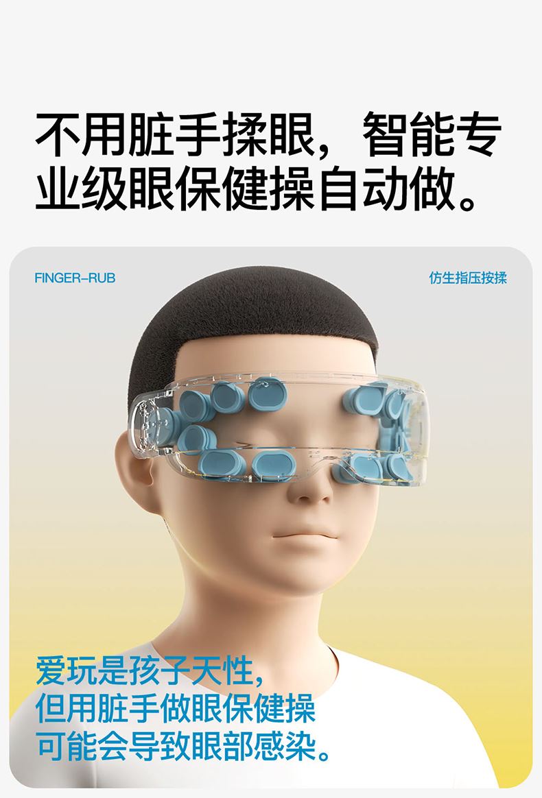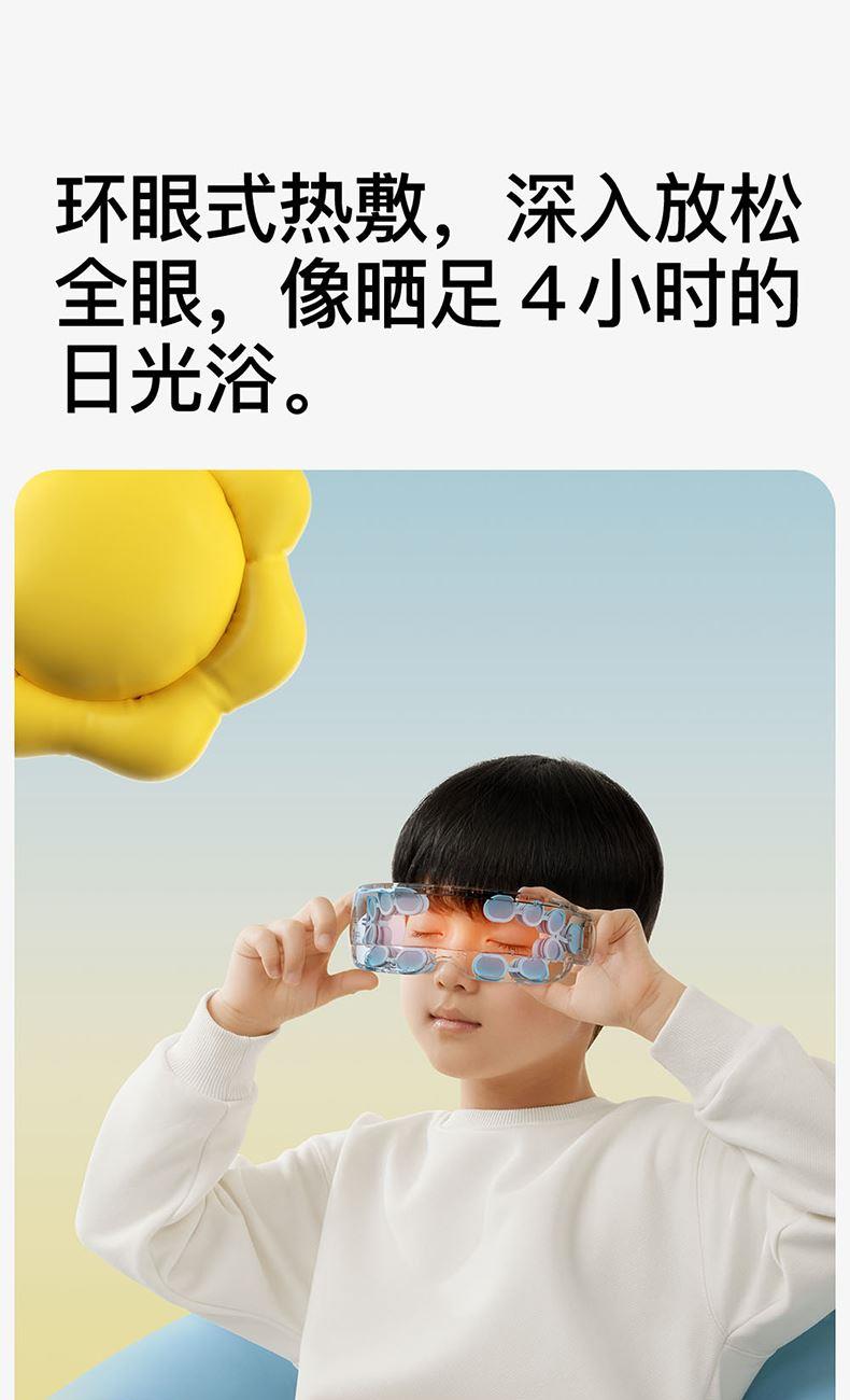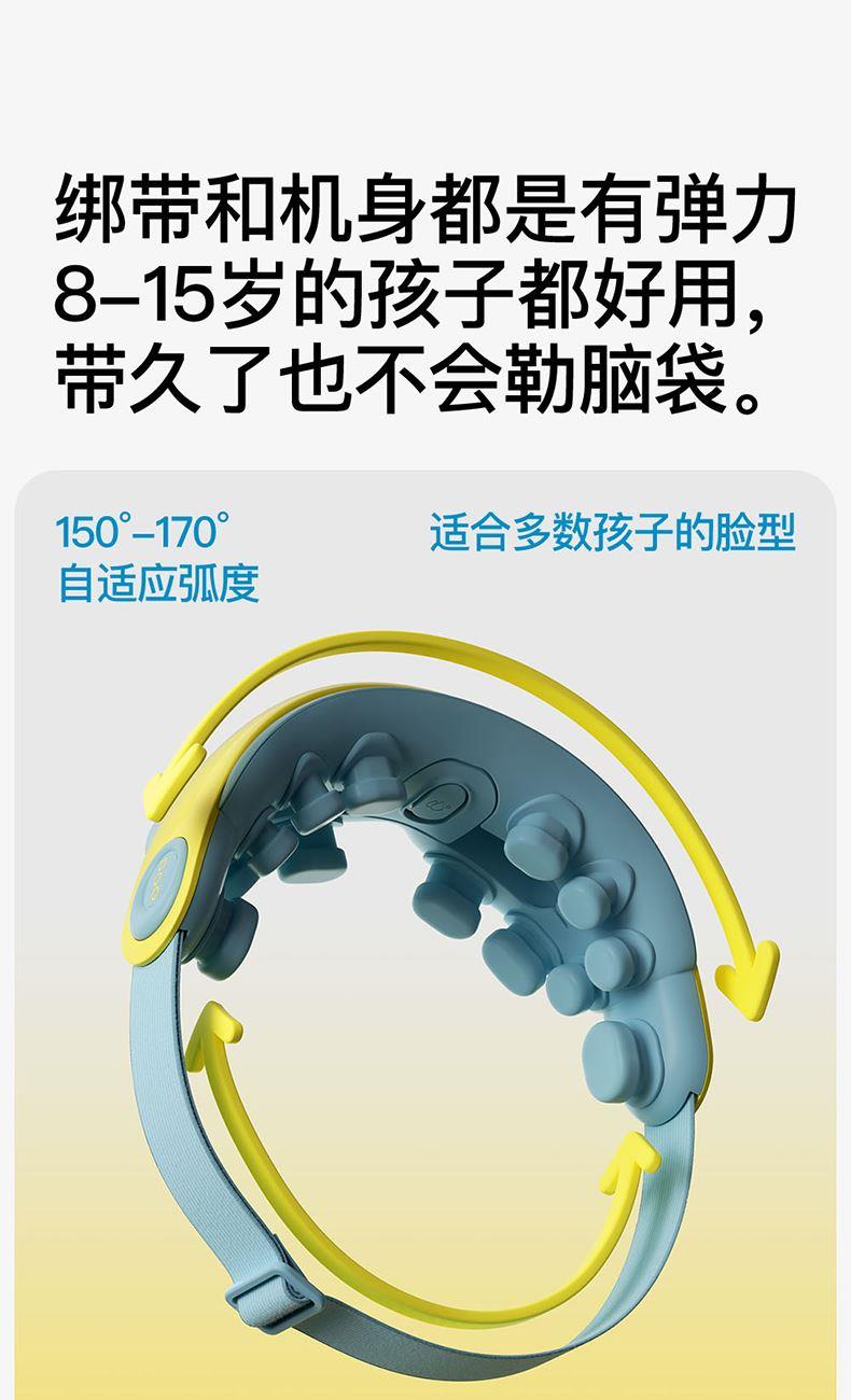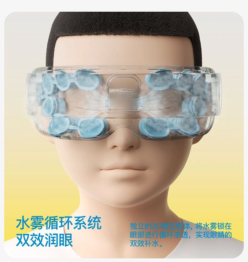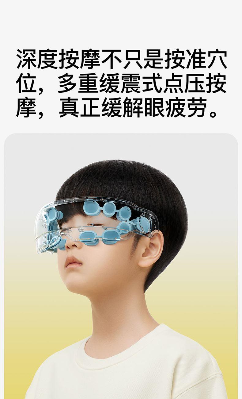产品颜色:粉蓝色、黄绿色、黄蓝色 产品材质 ABS+硅胶+布料 产品重量 218g 电池容量 1800mAh 充电时间 3~4小时 模式调节 4种 续航时间 150分钟/小雾量+低温;80分钟/持续温化+高温 水箱容量 6.5~7ml 热敷温度 38℃/低温档;42℃/高温档 额定输入 5V/1A 产品功能 ●超声微米雾化,超大雾量滋润双眼。 ●仿生指压震动,点对点按揉眼周穴位, ●环眼式热敷,让热感随着按摩一起深入疲惫穴位,放松全眼。 ●经1000+次优化测试,设计适合的机身弧度,更贴合孩子的头型、脸型。 ●设计了 2 颗太阳穴按摩头,重点为了给小朋友放松下大脑。 ●紫外线水箱消毒>99.9%妈妈安心。水箱是可拆卸的,边边角角都可以清洗到。 ●绑带和机身都是有弹力8-15岁的孩子都好用,带久了也不会勒脑袋。 ●按摩头用的是奶嘴同款材质,肌肤敏感的小朋友也能用。 ●满电1次,续航1周,外出用也方便。 ●4个护眼方案, 适合4个不同场景:模式1:活力护眼模式+冷敷,学习思路清晰;模式2: 眼保操模式+热敷,缓解疲劳 保护视力;模式3:舒缓护眼模式+静音,小憩放松 不打扰 休息;模式4:睡眠模式+白噪音,深度放松更助眠。