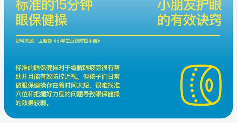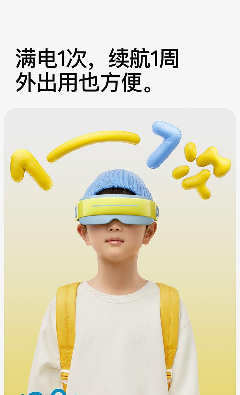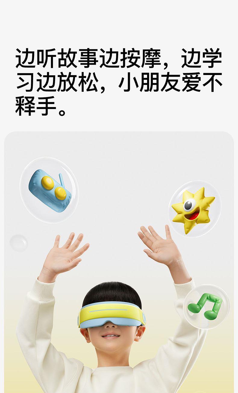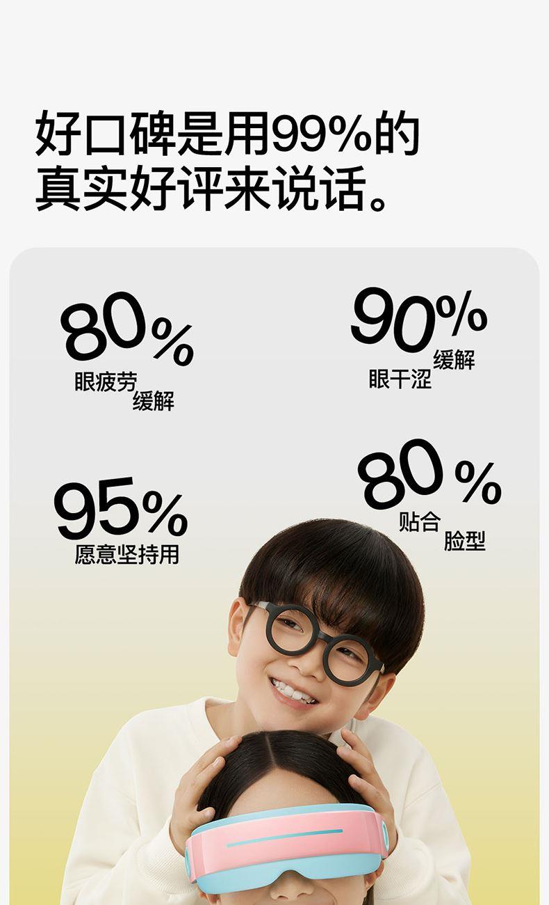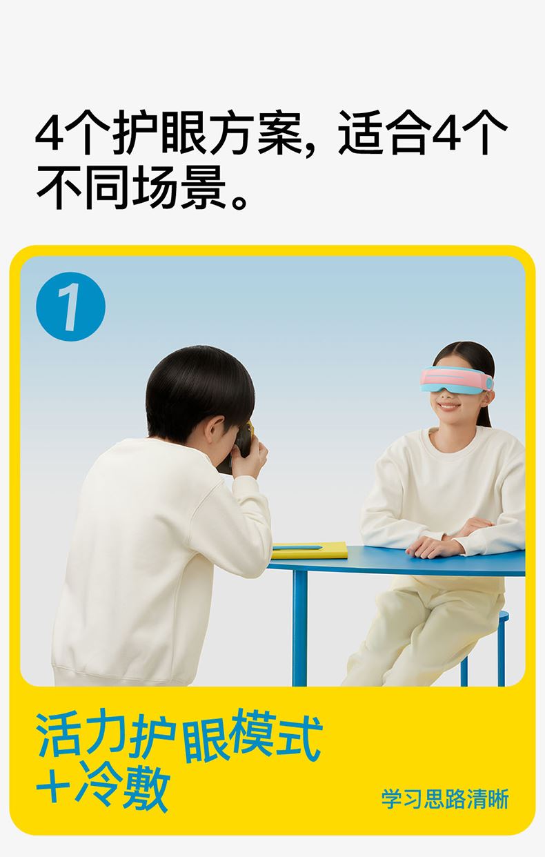 产品颜色:粉蓝色、黄绿色、黄蓝色 产品材质 ABS+硅胶+布料 产品重量 218g 电池容量 1800mAh 充电时间 3~4小时 模式调节 4种 续航时间 150分钟/小雾量+低温;80分钟/持续温化+高温 水箱容量 6.5~7ml 热敷温度 38℃/低温档;42℃/高温档 额定输入 5V/1A 产品功能 ●超声微米雾化,超大雾量滋润双眼。 ●仿生指压震动,点对点按揉眼周穴位, ●环眼式热敷,让热感随着按摩一起深入疲惫穴位,放松全眼。 ●经1000+次优化测试,设计适合的机身弧度,更贴合孩子的头型、脸型。 ●设计了 2 颗太阳穴按摩头,重点为了给小朋友放松下大脑。 ●紫外线水箱消毒>99.9%妈妈安心。水箱是可拆卸的,边边角角都可以清洗到。 ●绑带和机身都是有弹力8-15岁的孩子都好用,带久了也不会勒脑袋。 ●按摩头用的是奶嘴同款材质,肌肤敏感的小朋友也能用。 ●满电1次,续航1周,外出用也方便。 ●4个护眼方案, 适合4个不同场景:模式1:活力护眼模式+冷敷,学习思路清晰;模式2: 眼保操模式+热敷,缓解疲劳 保护视力;模式3:舒缓护眼模式+静音,小憩放松 不打扰 休息;模式4:睡眠模式+白噪音,深度放松更助眠。