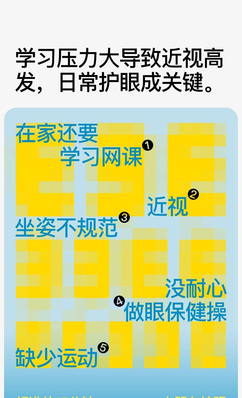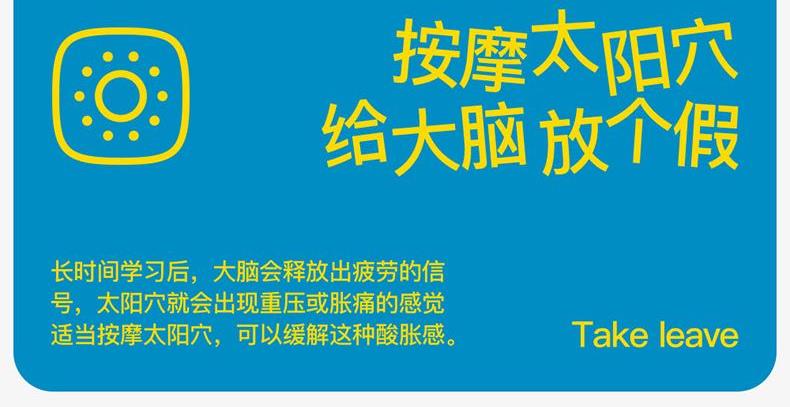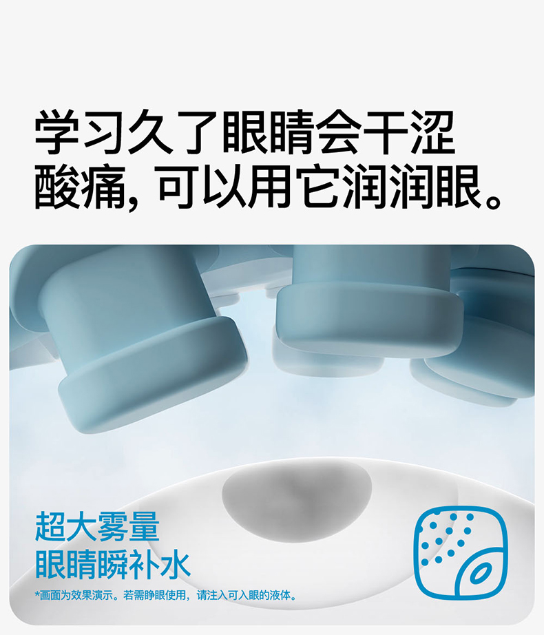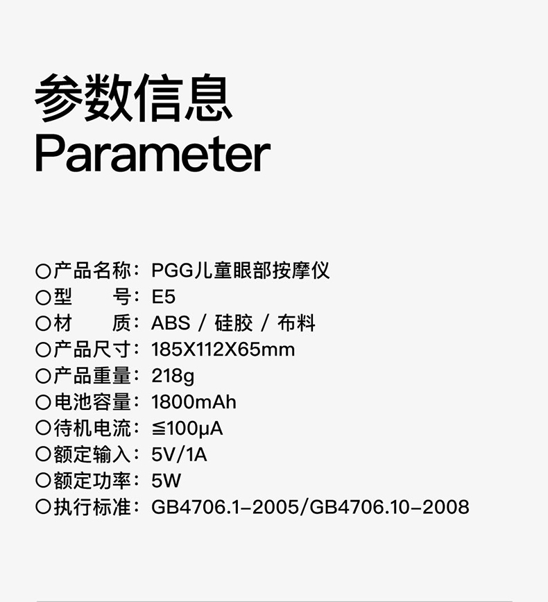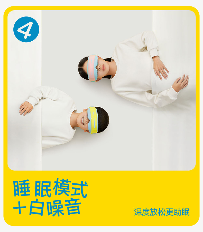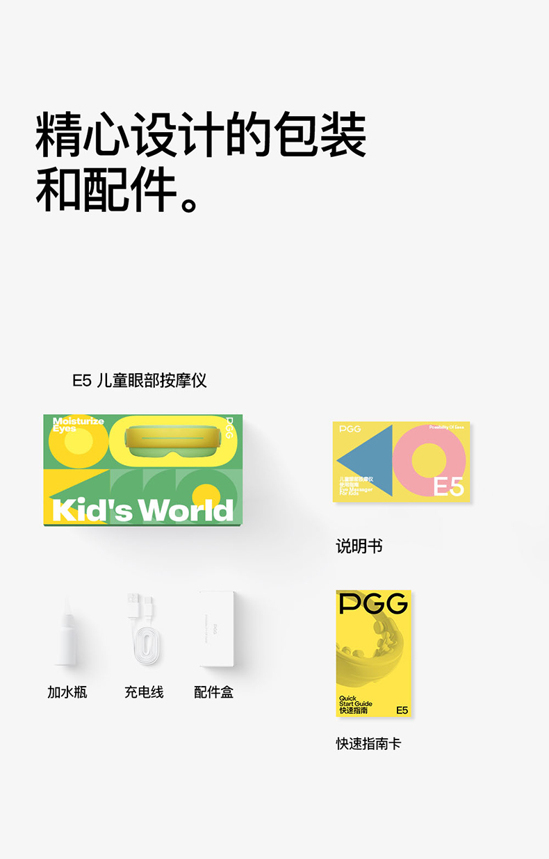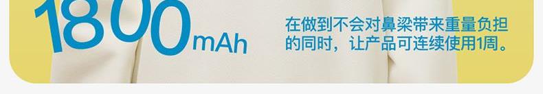 产品颜色:粉蓝色、黄绿色、黄蓝色 产品材质 ABS+硅胶+布料 产品重量 218g 电池容量 1800mAh 充电时间 3~4小时 模式调节 4种 续航时间 150分钟/小雾量+低温;80分钟/持续温化+高温 水箱容量 6.5~7ml 热敷温度 38℃/低温档;42℃/高温档 额定输入 5V/1A 产品功能 ●超声微米雾化,超大雾量滋润双眼。 ●仿生指压震动,点对点按揉眼周穴位, ●环眼式热敷,让热感随着按摩一起深入疲惫穴位,放松全眼。 ●经1000+次优化测试,设计适合的机身弧度,更贴合孩子的头型、脸型。 ●设计了 2 颗太阳穴按摩头,重点为了给小朋友放松下大脑。 ●紫外线水箱消毒>99.9%妈妈安心。水箱是可拆卸的,边边角角都可以清洗到。 ●绑带和机身都是有弹力8-15岁的孩子都好用,带久了也不会勒脑袋。 ●按摩头用的是奶嘴同款材质,肌肤敏感的小朋友也能用。 ●满电1次,续航1周,外出用也方便。 ●4个护眼方案, 适合4个不同场景:模式1:活力护眼模式+冷敷,学习思路清晰;模式2: 眼保操模式+热敷,缓解疲劳 保护视力;模式3:舒缓护眼模式+静音,小憩放松 不打扰 休息;模式4:睡眠模式+白噪音,深度放松更助眠。