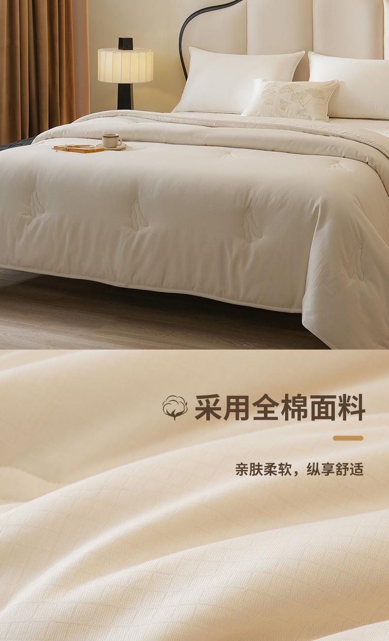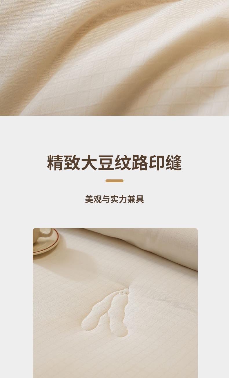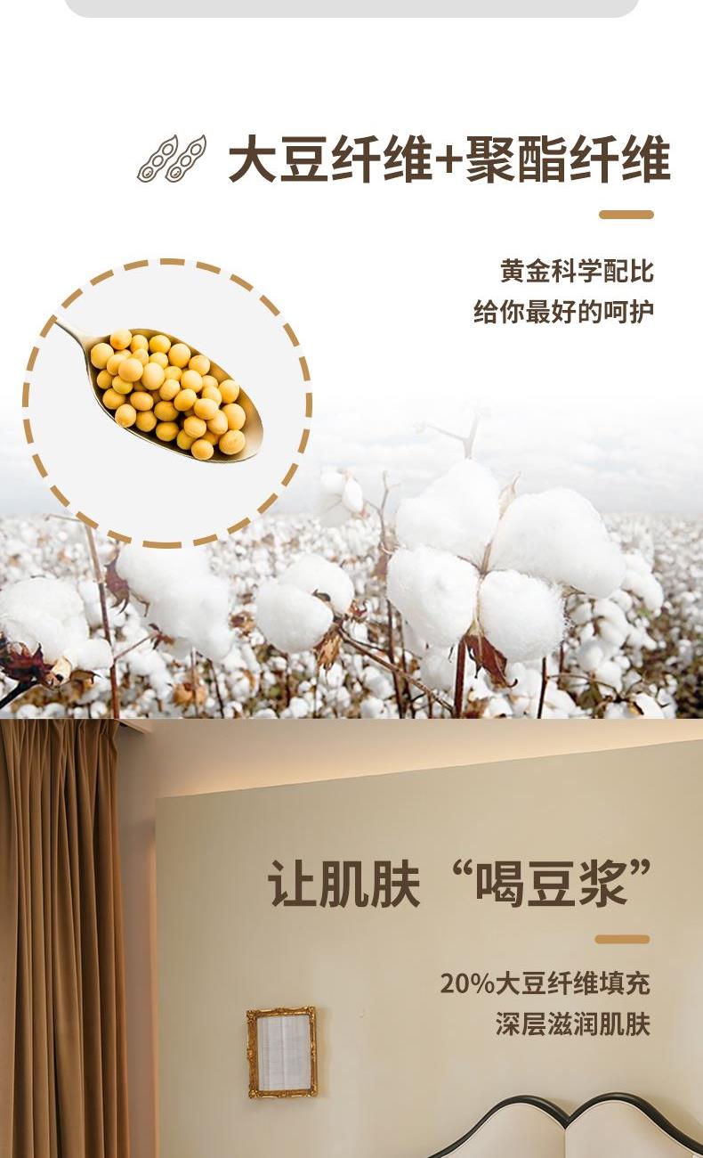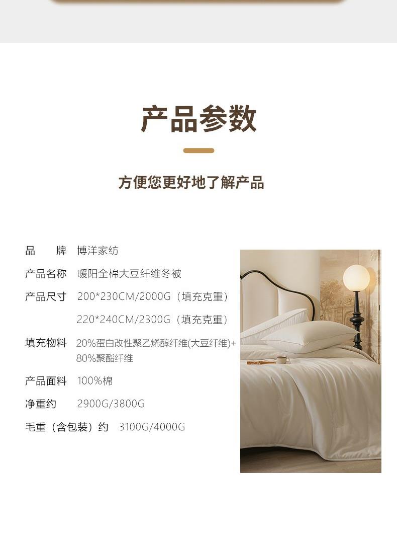 产品规格:200*230cm/2000g(填充克重) 产品材质: 面料:全棉 填充:80%聚酯纤维+20%蛋白改性聚乙烯醇纤维(大豆纤维) 1、大豆纤维与聚酯纤维合理配比,具有羊绒般柔软受昂,棉的舒适性和蚕丝般的亲肤性,含有人体必须的多种氨基酸,体验云感舒适。 2、优选纯棉面料,高支高密,手感细腻柔软,摸上去柔软舒适且富有光泽。定点绗缝工艺,阵脚细密工整,不易结团更耐用。