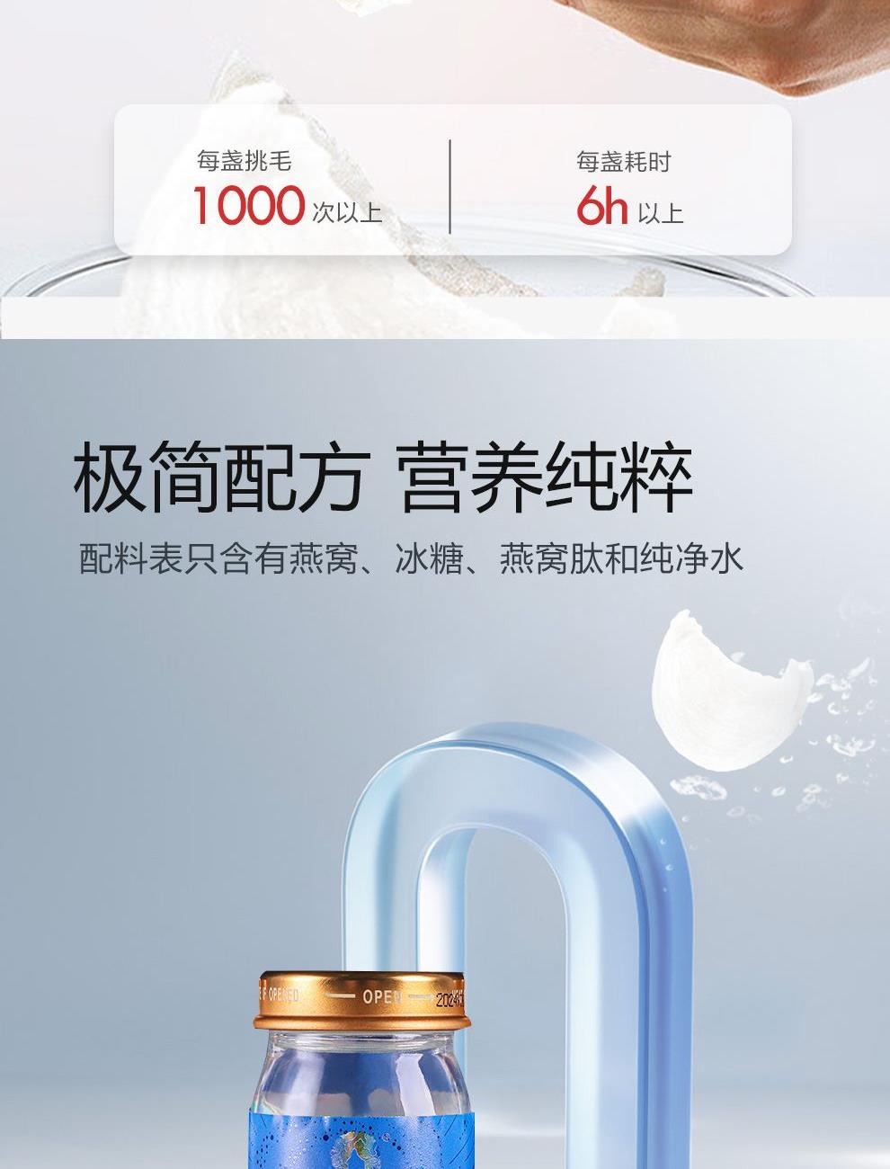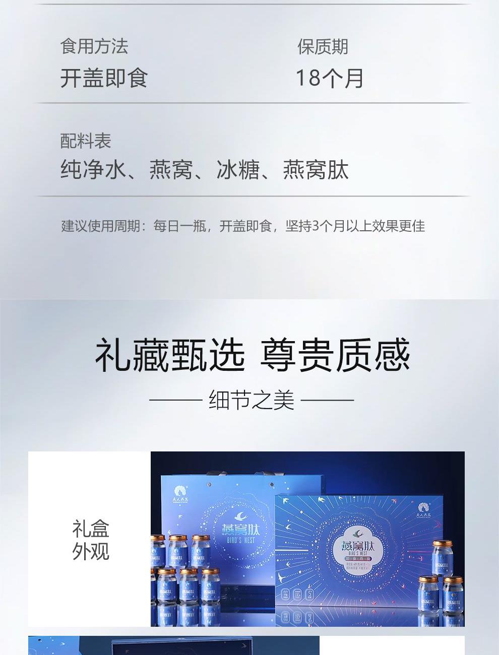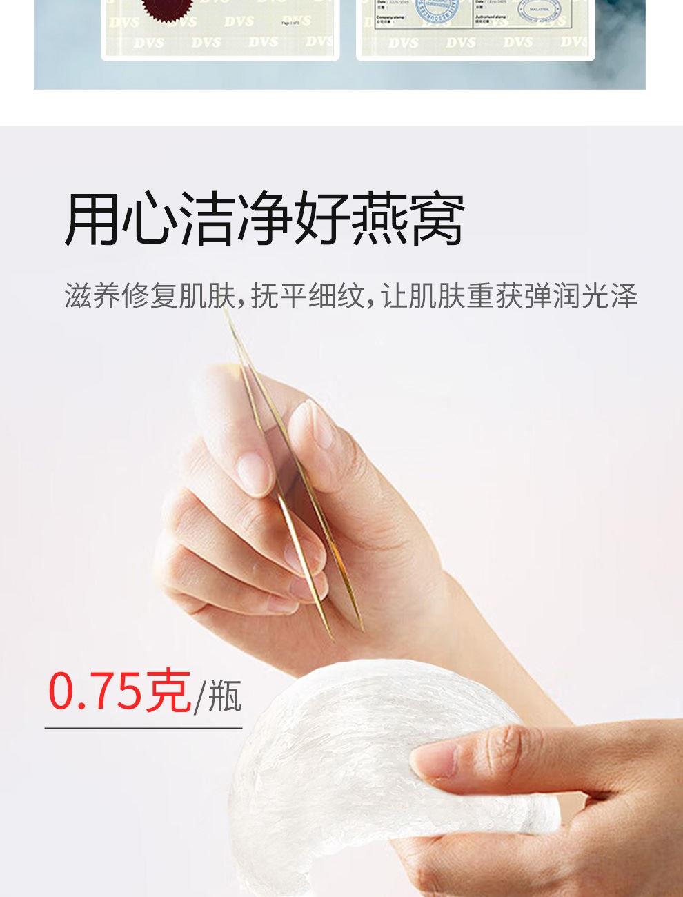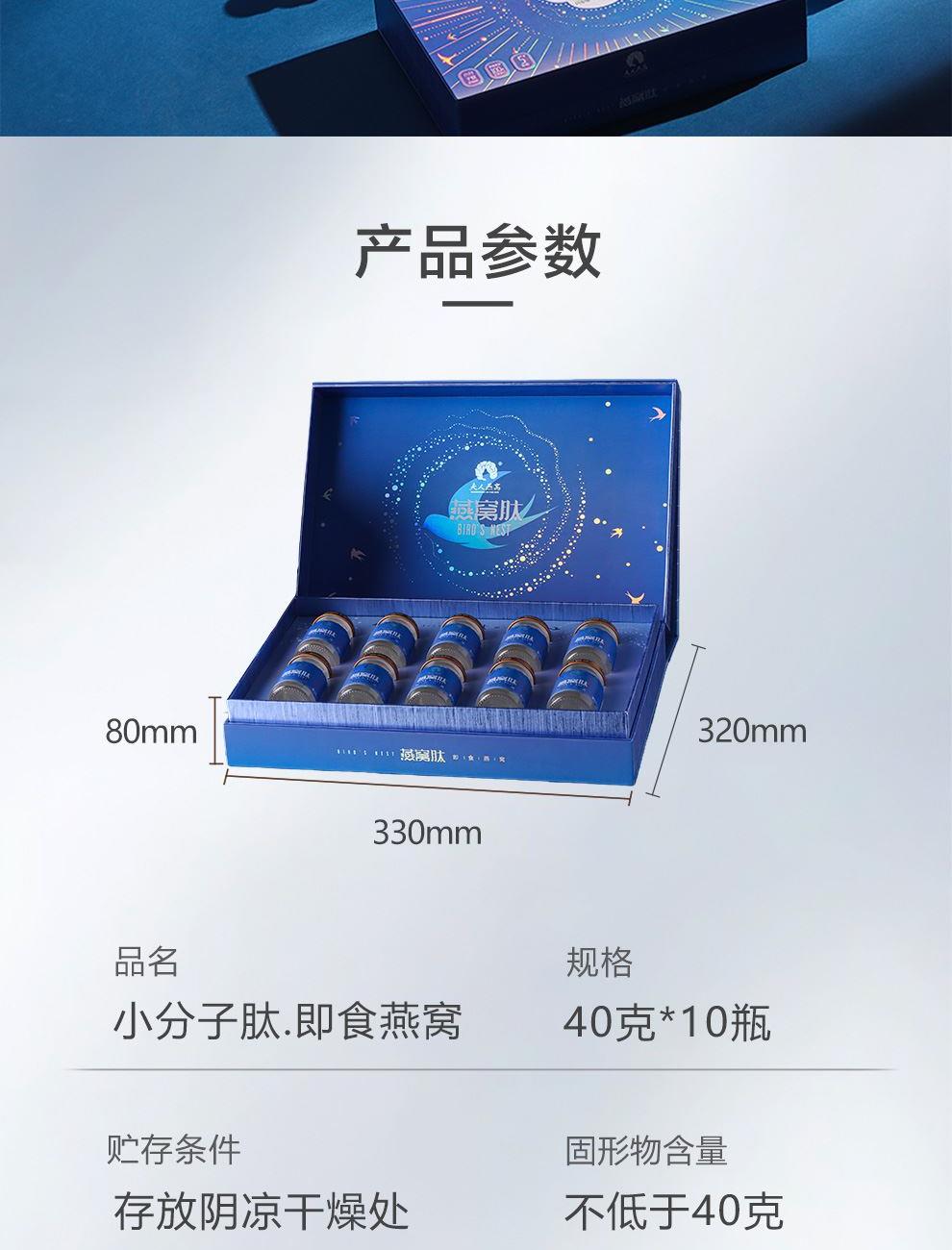 规格:400克(40克*10瓶)、燕窝固形物不低于30% 卖点: 燕窝原料精选马来西亚、印尼森林雨季燕盏,洁净度更高,泡发率更好。121℃,1140秒数控,科学炖煮,保留燕窝营养,口感细腻爽滑。坚持 0添加 0色素 0防腐剂,孕妈和宝宝也可以放心享用。一瓶一码可溯源,开盖即食,开启滋补。
