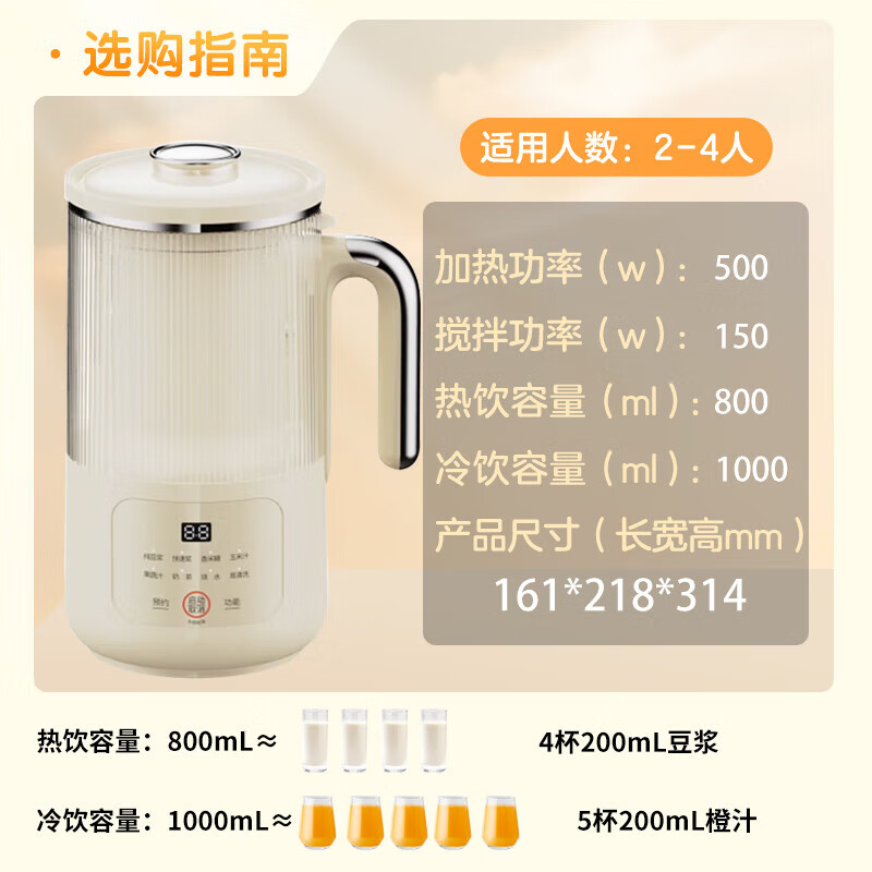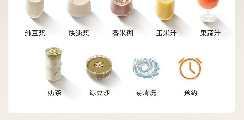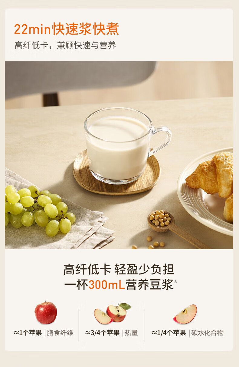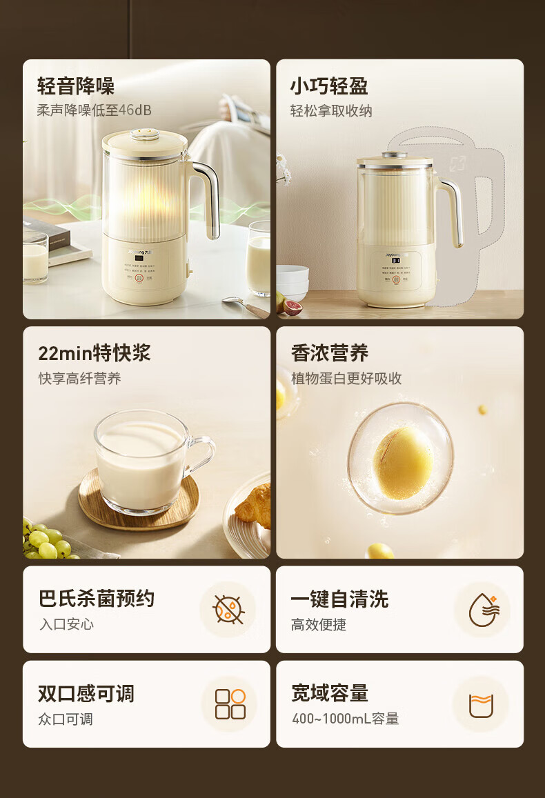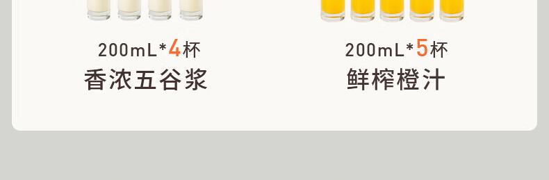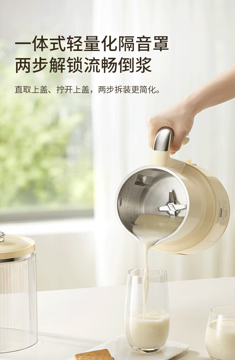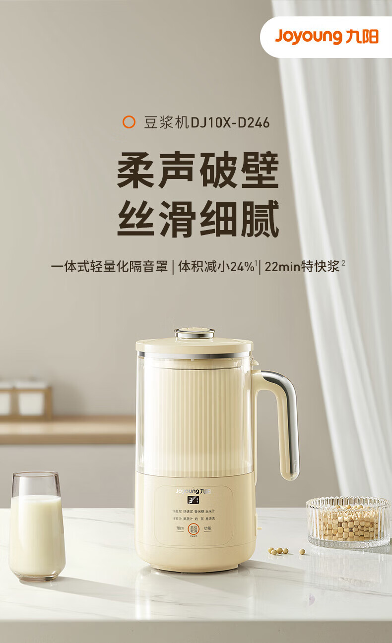 噪音低至45dB; 小巧不占地,简易好拆装; 22min特快浆; 细腻免滤,营养香浓; 双口感可调 容量:1000mL 单台包装尺寸:245L*245W*400Hmm