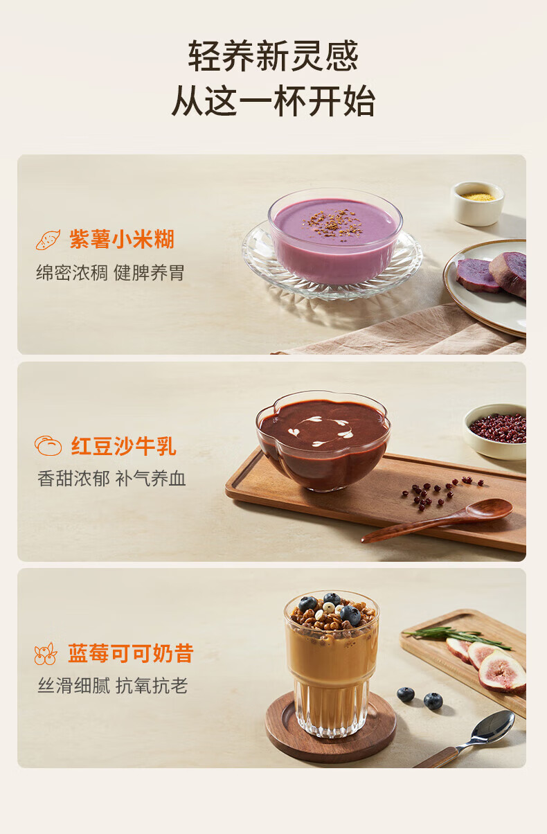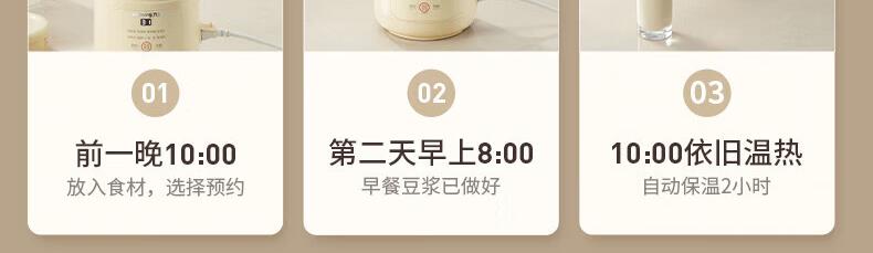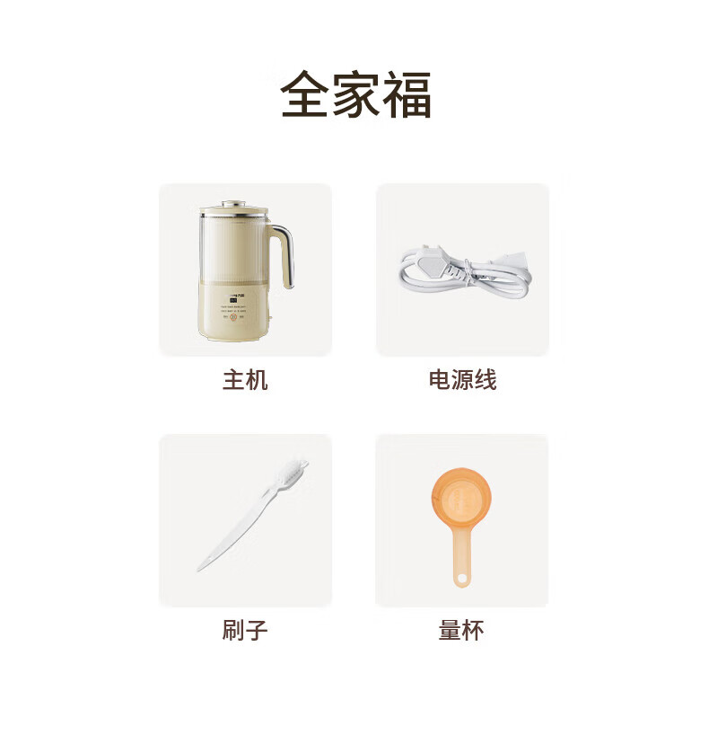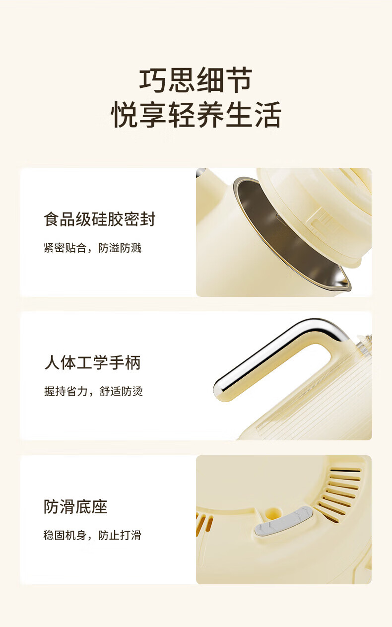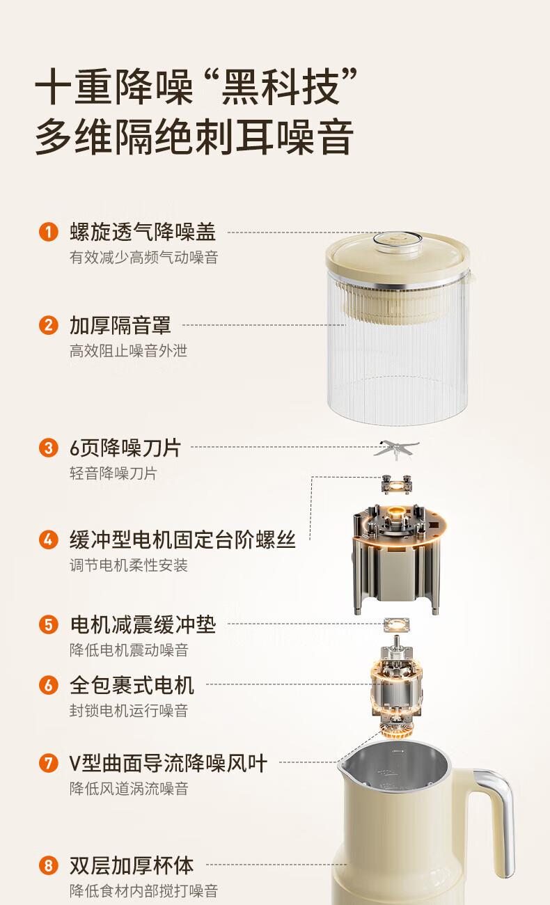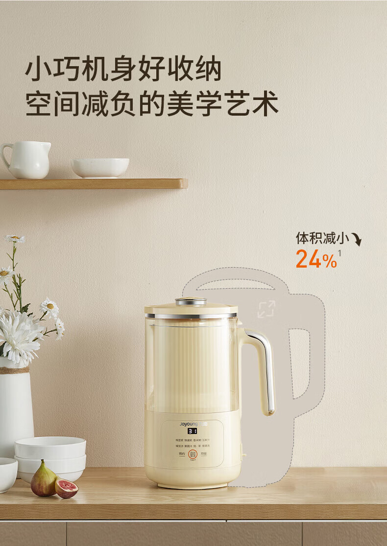 噪音低至45dB; 小巧不占地,简易好拆装; 22min特快浆; 细腻免滤,营养香浓; 双口感可调 容量:1000mL 单台包装尺寸:245L*245W*400Hmm