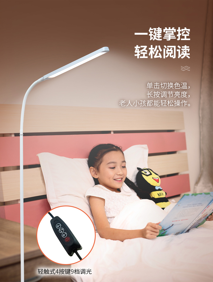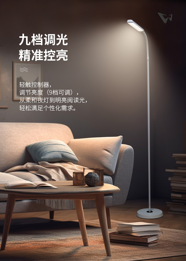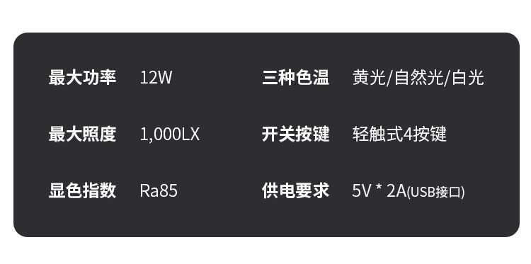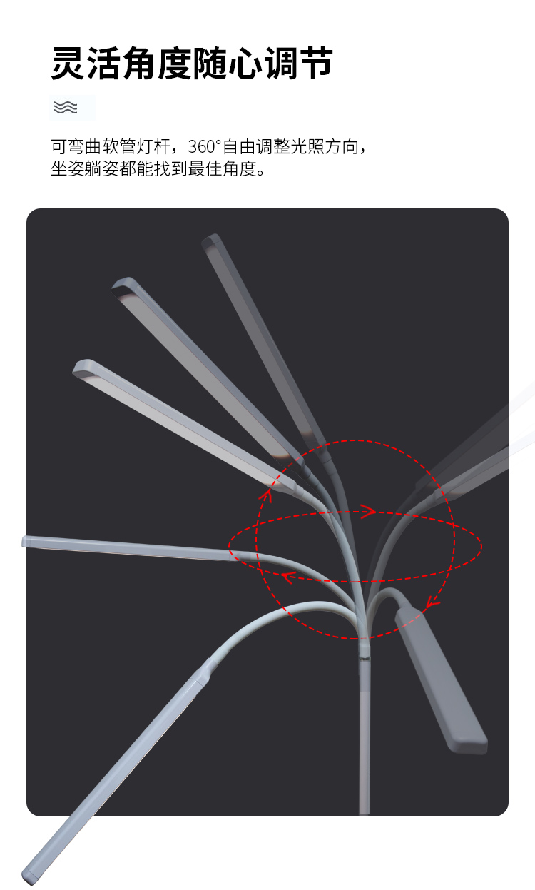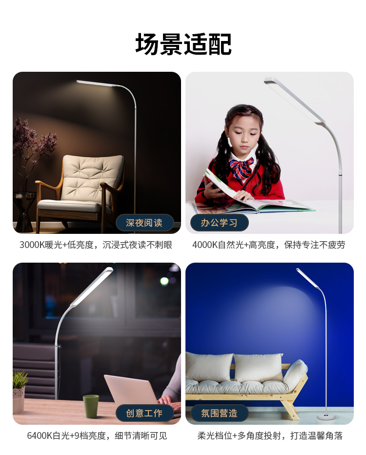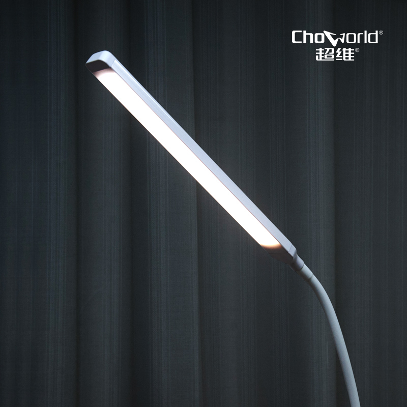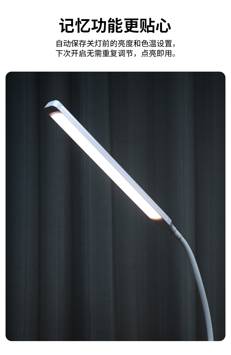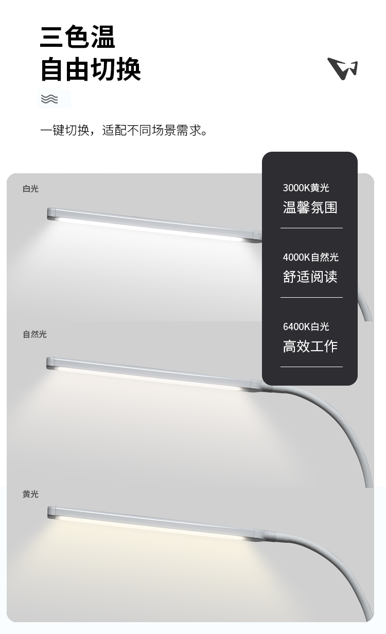 【型号】CW3502 【功率】12W 【色温】3,000k~6,400k 【显色指数】≥ 85Ra 【控制方式】触控; 【材质】 ABS塑料+铝合金; 【功能卖点】 1、线控开/关灯、调亮度、调色温; 2、无频闪 无蓝光 护眼灯光; 3、灯杆软管设计,多角度多方位可调节; 4、黄光 自然光 白光 三色温,九档调节。