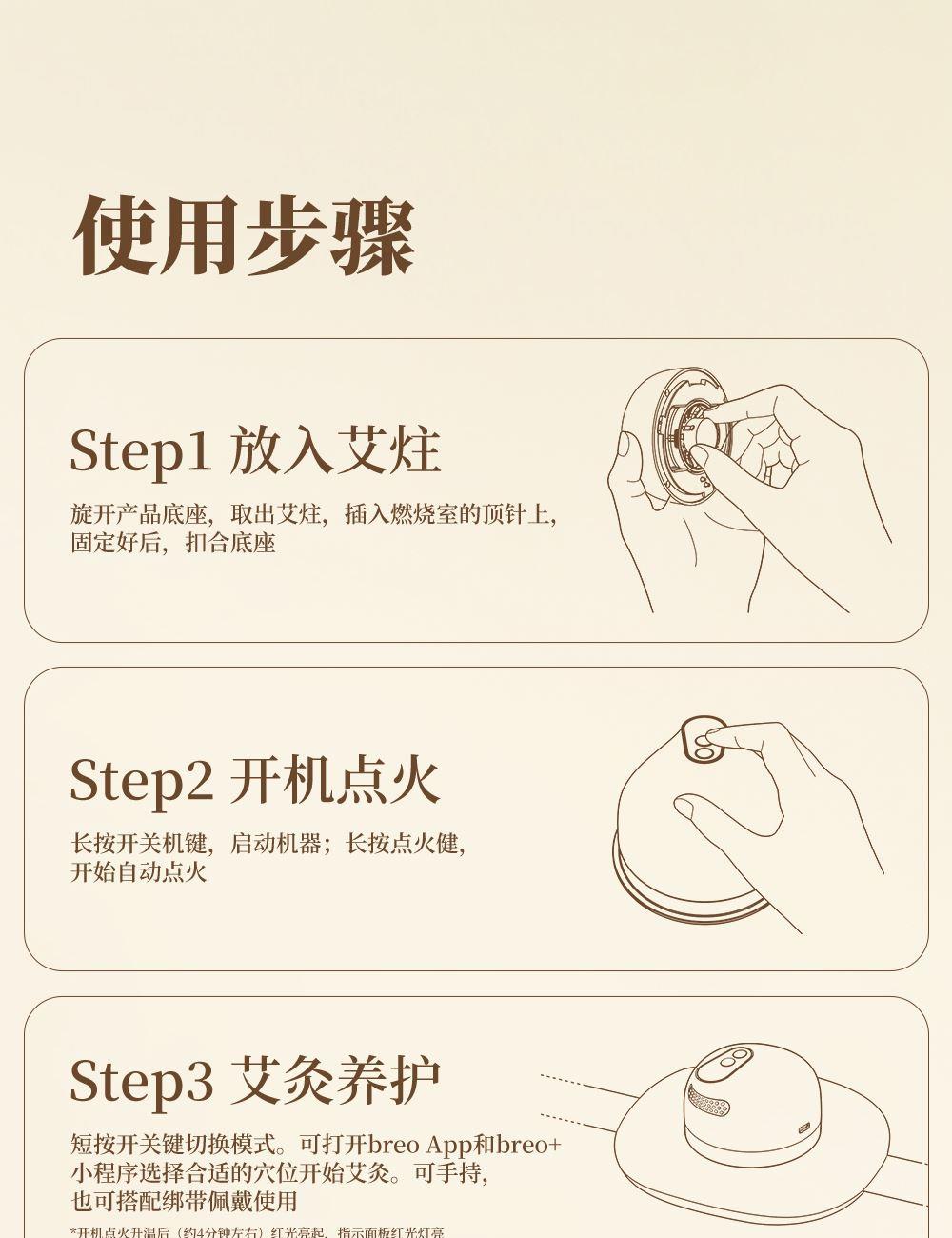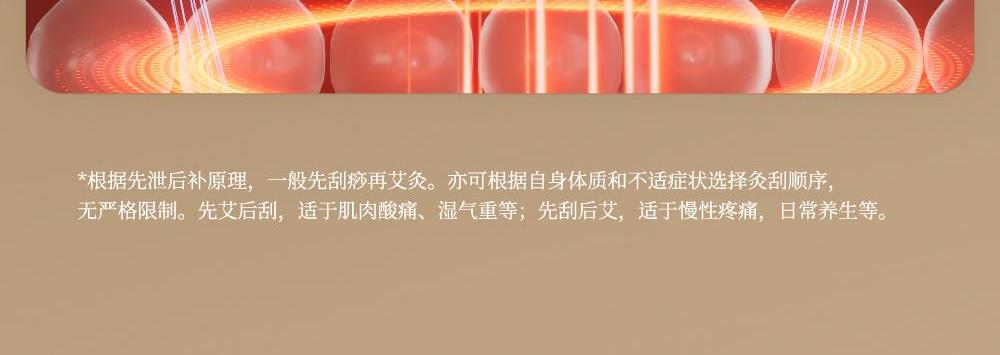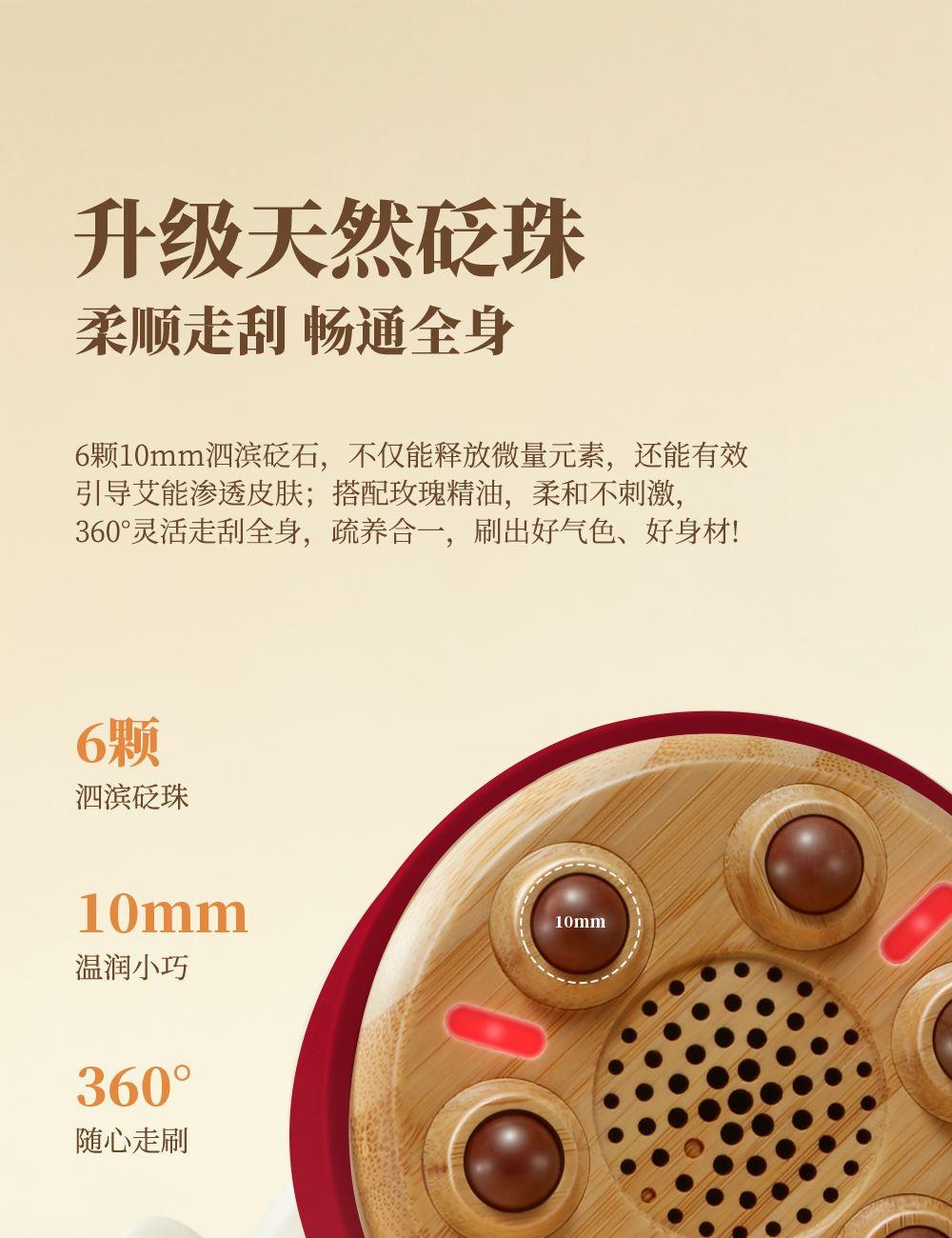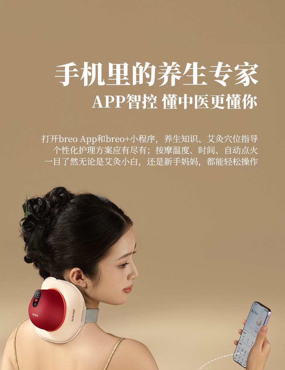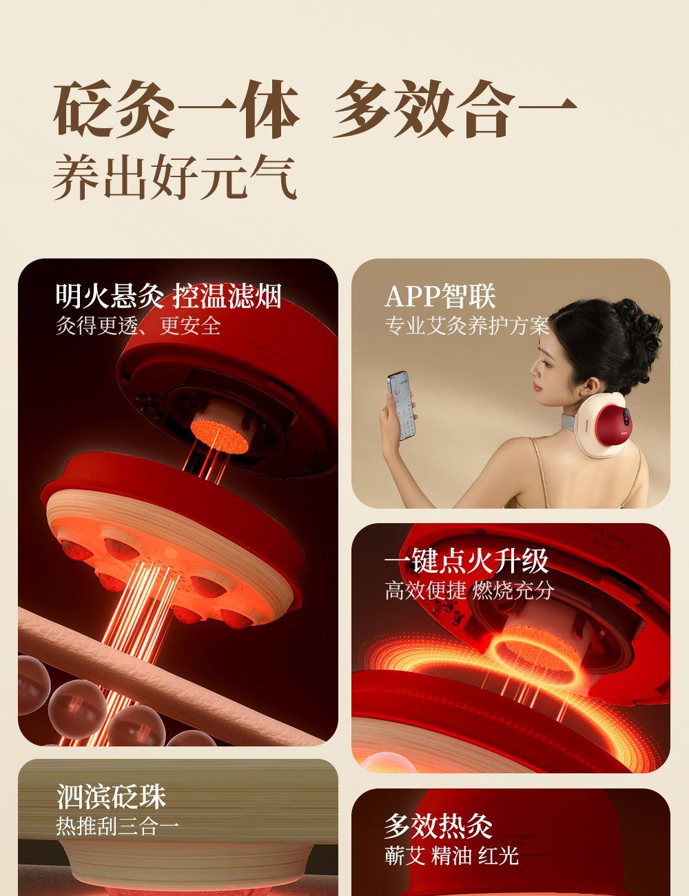 砭灸一体多效合一 养出好元气; 明火热灸深层驱寒,砭石滚珠刷出元气,一刷一灸,双效合一,拒绝身体虚堵湿,让身体更清爽、更轻松! 6颗10mm泗滨砭石,不仅能释放微量元素,还能有效引导艾能渗透皮肤;搭配玫瑰精油,柔和不刺激,360°灵活走刮全身,疏养合一,刷出好气色、好身材! 打开breoApp和breo+小程序,养生知识、艾灸穴位指导个性化护理方案应有尽有;按摩温度、时间、自动点火一目了然无论是艾灸小白,还是新手妈妈,都能轻松操作; 专研配方的蕲春陈艾,自然草本能量直达深层玫瑰精油搭配刮刷,温润不刺激;红光热疗,暖透肌肤三效合一,全家元气满满。