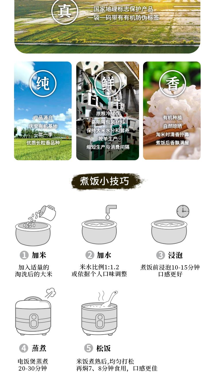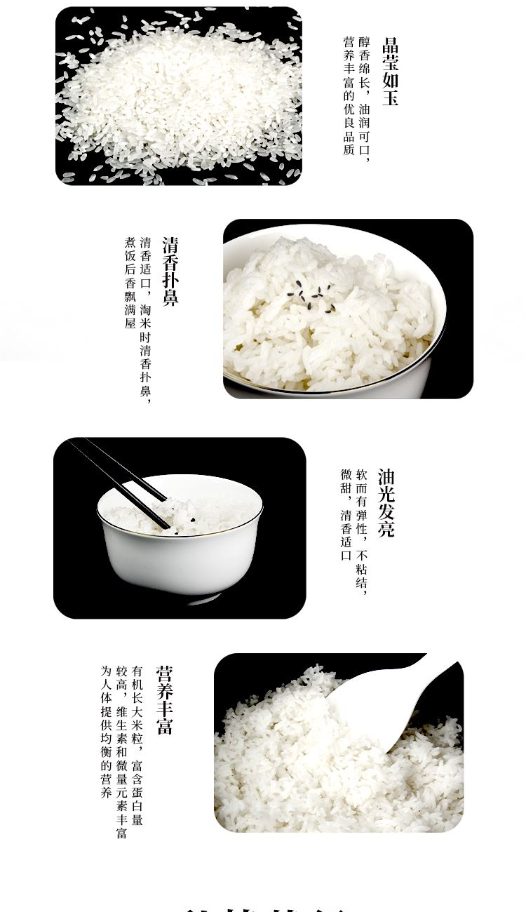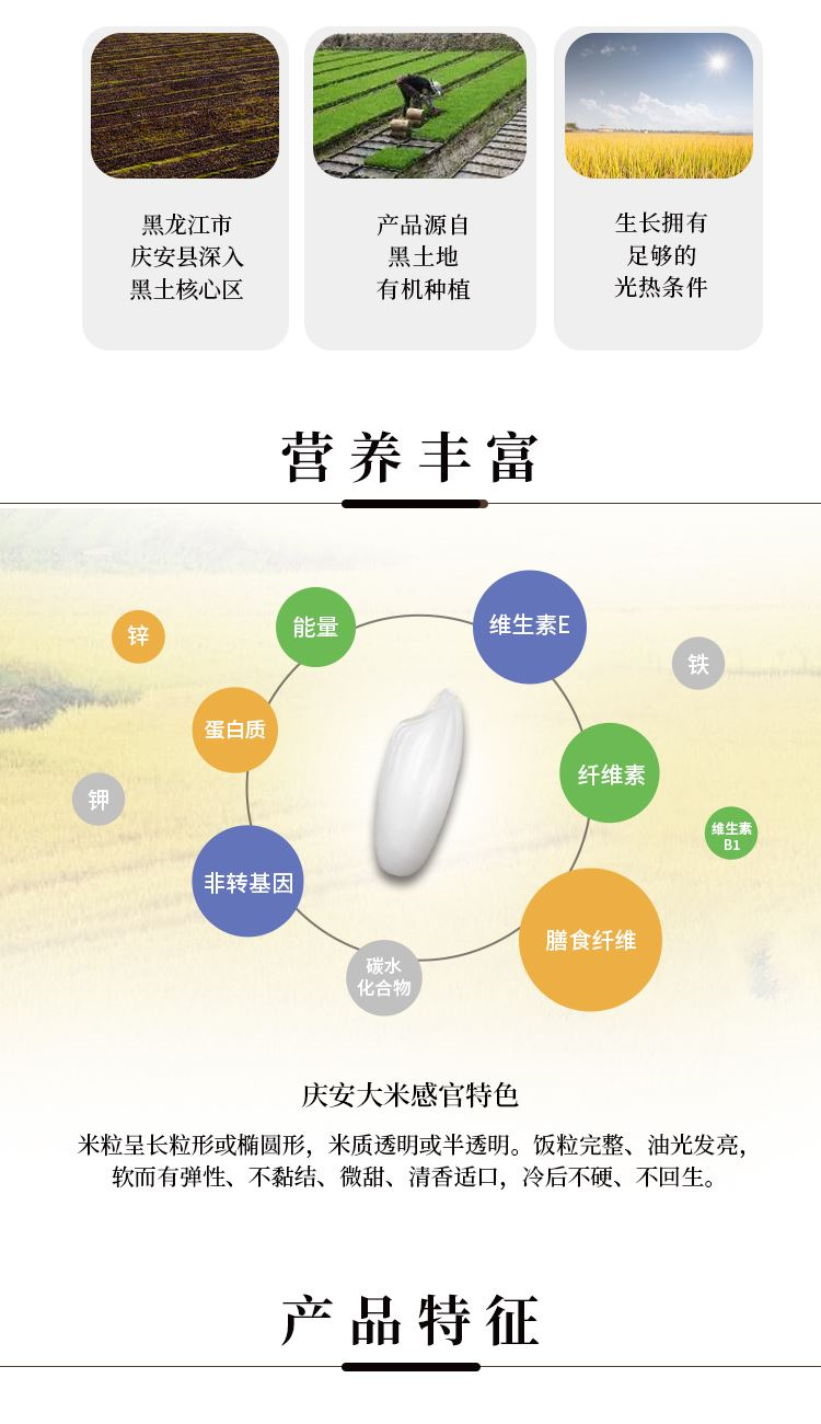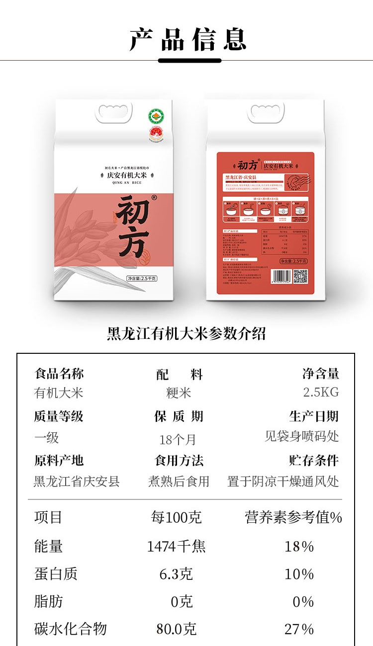 ①产地:庆安 ②包装规格: 2.5kg六面 ③保质期:18个月 ④贮存条件:常温保存 ⑤产品指标:蛋白质6.3g/100g; ⑥产自庆安寒地黑土核心区域有机种植 大米洁白修长、米质透明,饭粒完整,油光发亮,饱满如玉 口感软而有弹性、不黏结,微甜,米香淡雅 营养丰富,富含蛋白质量、维生素和微量元素,为人体提供均衡的营养。
