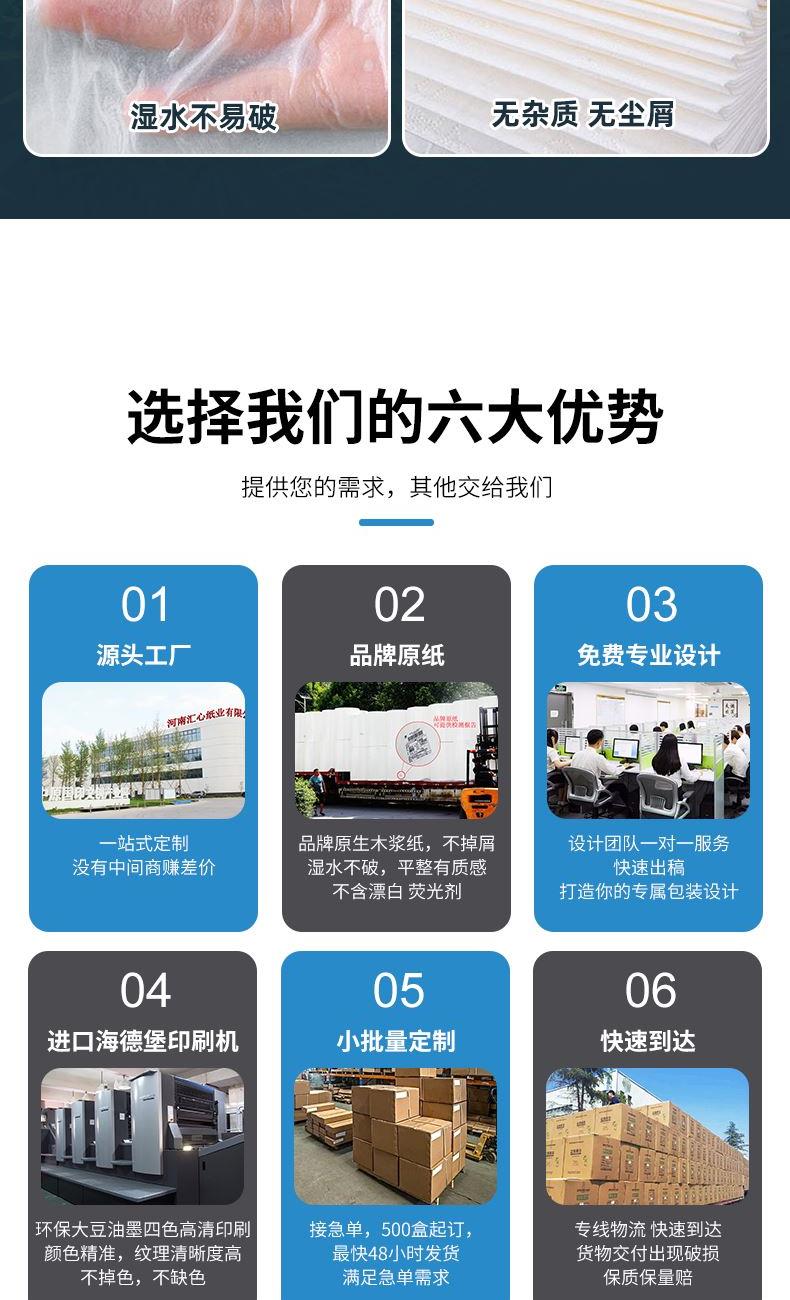 产品尺寸:145*68mm 内纸尺寸:126*180mm 净含量:2层50抽 外箱尺寸:64*50*65cm 主要成分:原生木浆 执行标准:GBT20808 卫生标准:GB15979 卫生许可证:(豫)卫消证字(2024)第0063号 产品等级:合格
