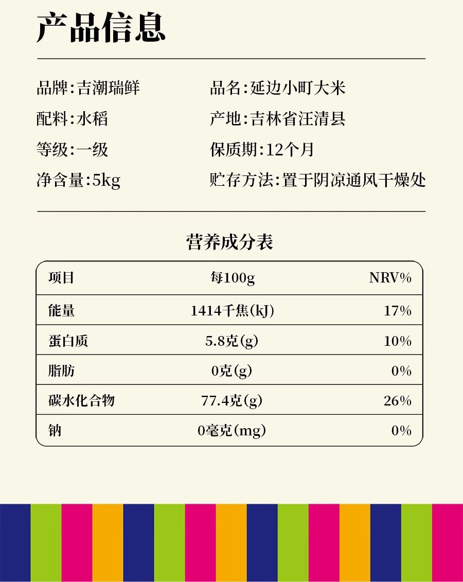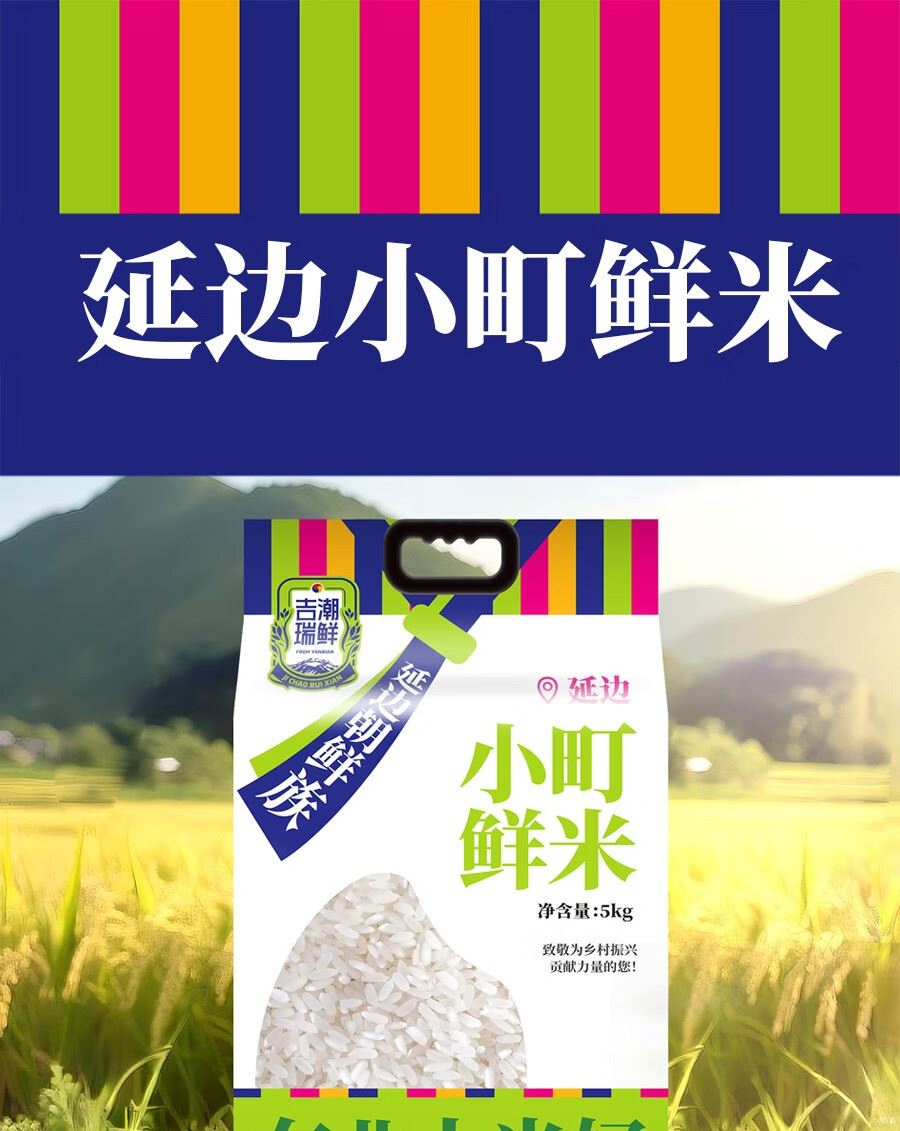 吉潮瑞鲜延边小町鲜米5公斤真空 配料:水稻 等级:一级 净含量:5kg 产地:吉林省汪清县 保质期:12个月 贮存方法:置于阴凉通风干燥处