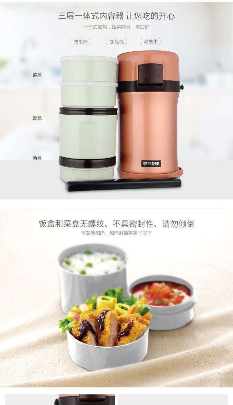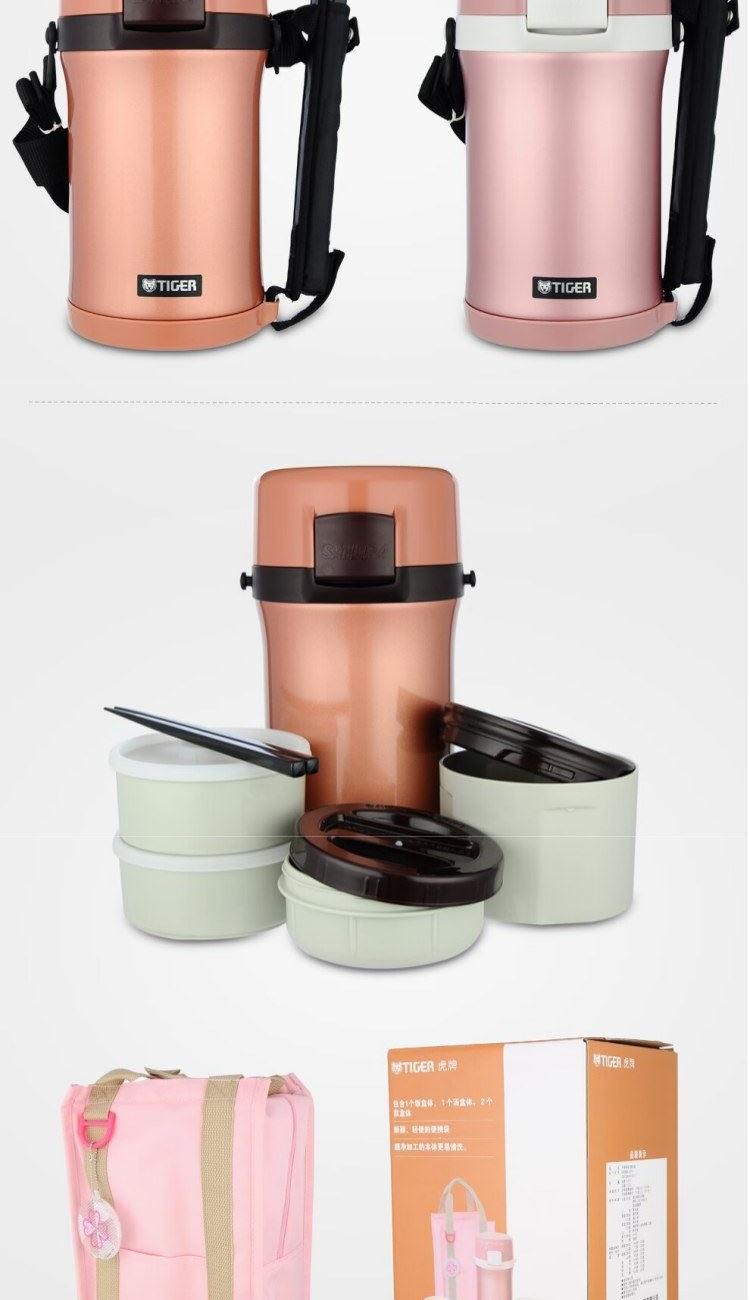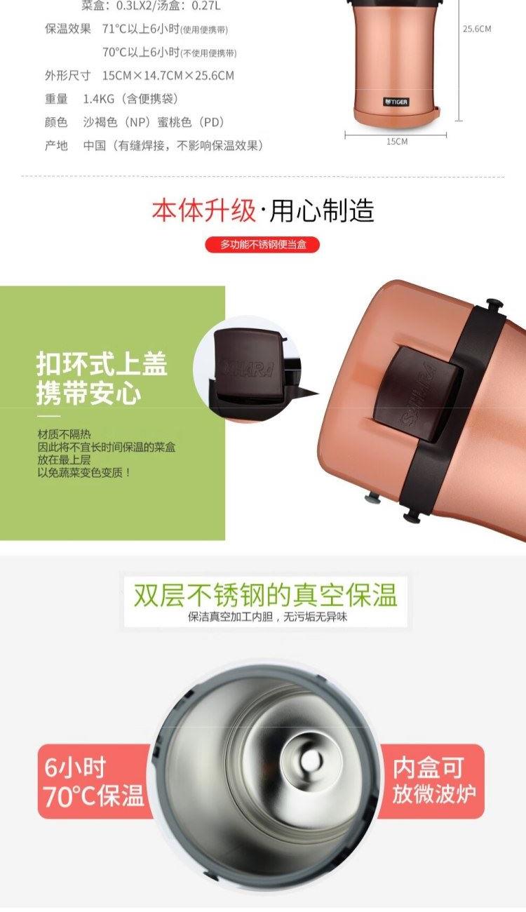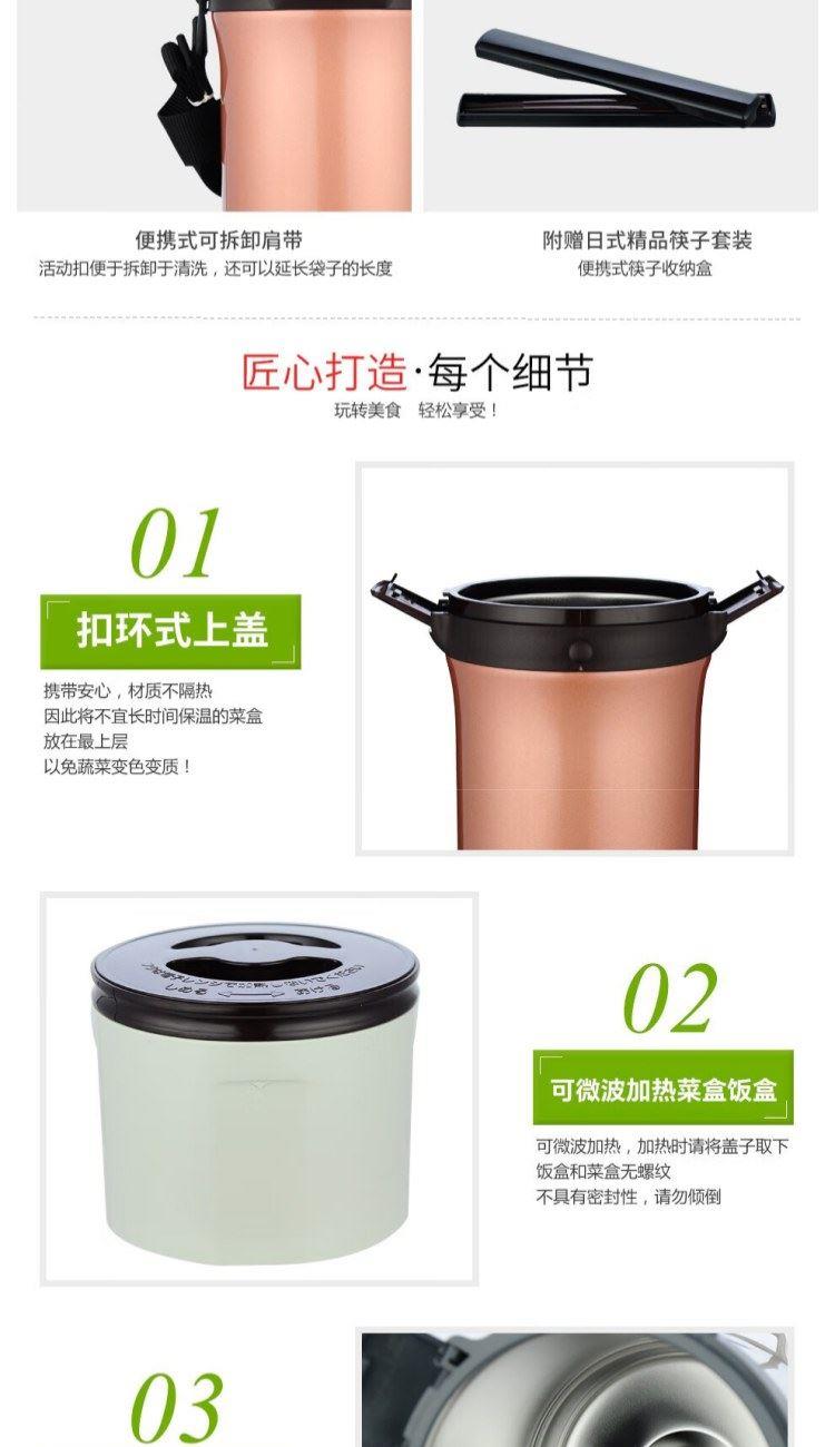 容量饭盒:0.61L/菜盒:0.3LX2/汤盒:0.27L 保温效果:71℃以上6小时(使用便携带) 70°C以上6小时(不使用便携带) 外形尺寸:15CMX14.7CMX25.6CM 重量:1.4KG(含便携袋) 颜色:沙褐色(NP)蜜桃色(PD) 产地:中国(有缝焊接,不影响保温效果) 双层不锈钢的真空保温保洁真空加工内胆 无污垢无异味 三层一体式内容器让您吃的开心 一体式加热,饭菜鲜香,胃口好 饭盒和菜盒无螺纹、不具密封性、请勿倾倒 可微波加热,加热时请将盖子取下,便携式可拆卸肩带 附赠日式精品筷子套装 活动扣便于拆卸于清洗 还可以延长袋子的长度