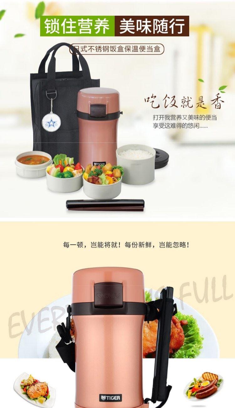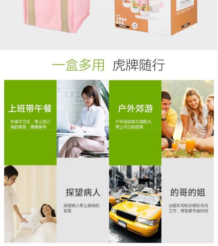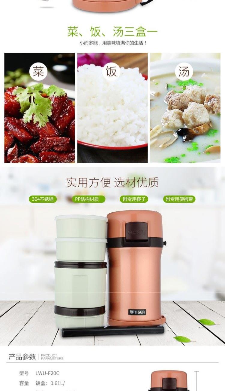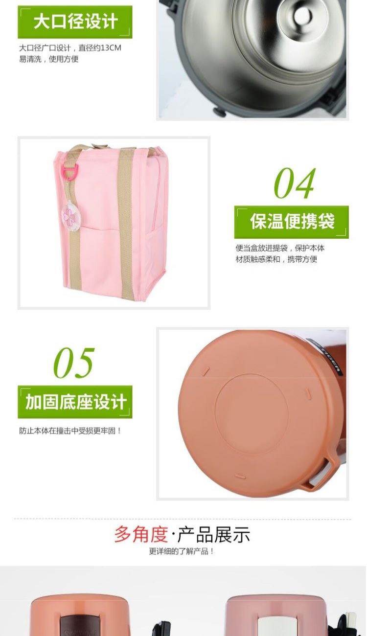 容量饭盒:0.61L/菜盒:0.3LX2/汤盒:0.27L 保温效果:71℃以上6小时(使用便携带) 70°C以上6小时(不使用便携带) 外形尺寸:15CMX14.7CMX25.6CM 重量:1.4KG(含便携袋) 颜色:沙褐色(NP)蜜桃色(PD) 产地:中国(有缝焊接,不影响保温效果) 双层不锈钢的真空保温保洁真空加工内胆 无污垢无异味 三层一体式内容器让您吃的开心 一体式加热,饭菜鲜香,胃口好 饭盒和菜盒无螺纹、不具密封性、请勿倾倒 可微波加热,加热时请将盖子取下,便携式可拆卸肩带 附赠日式精品筷子套装 活动扣便于拆卸于清洗 还可以延长袋子的长度