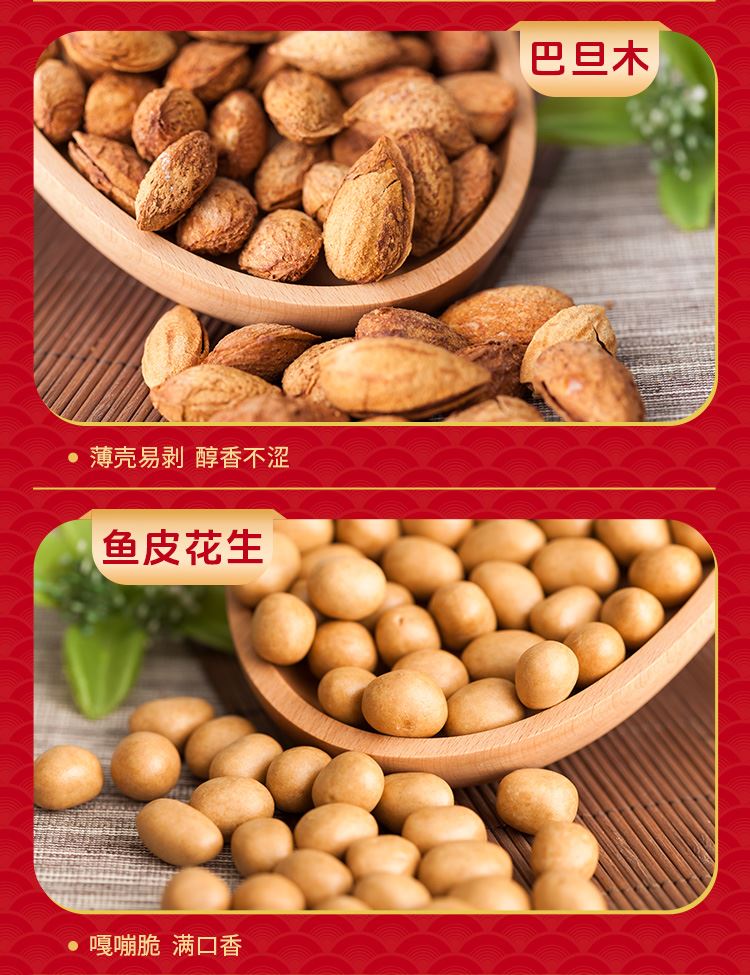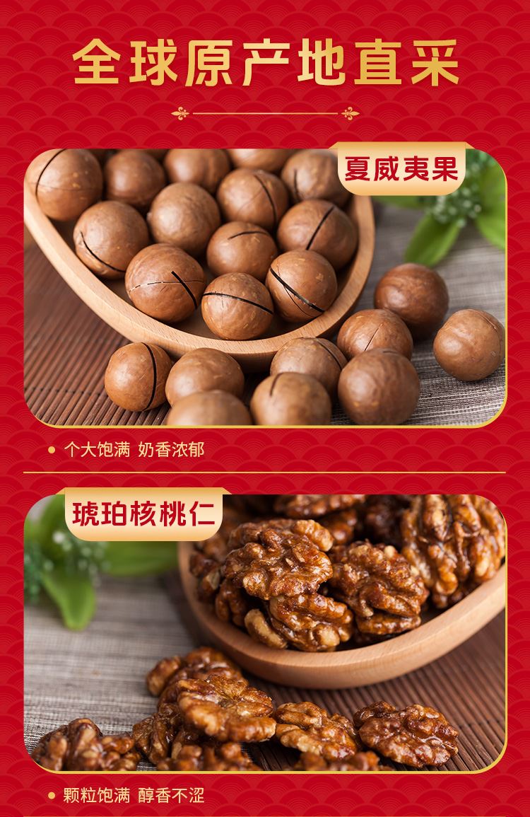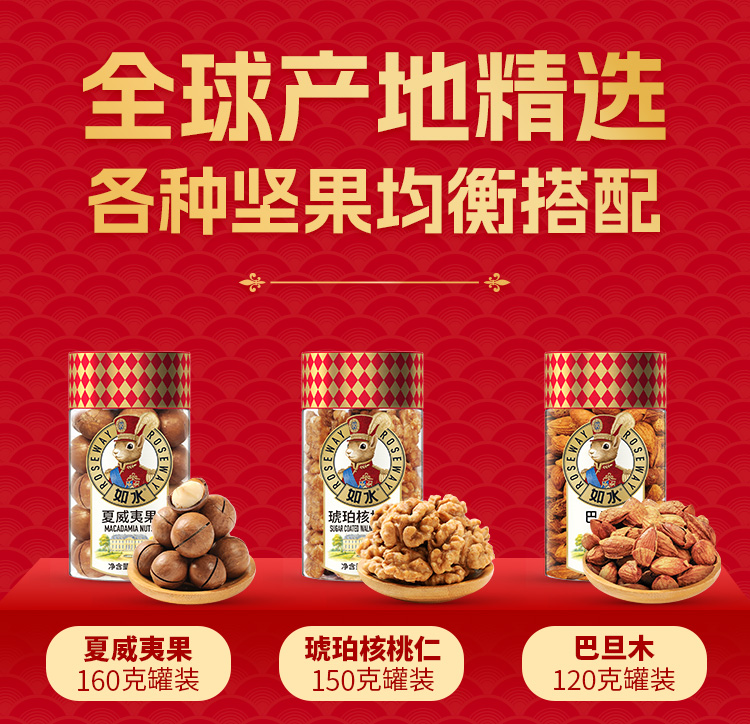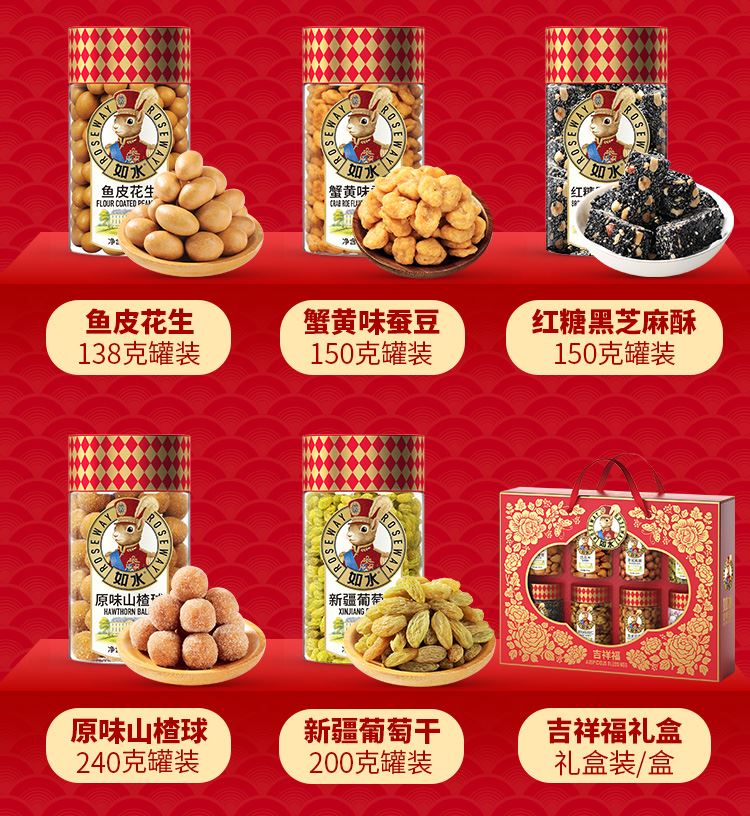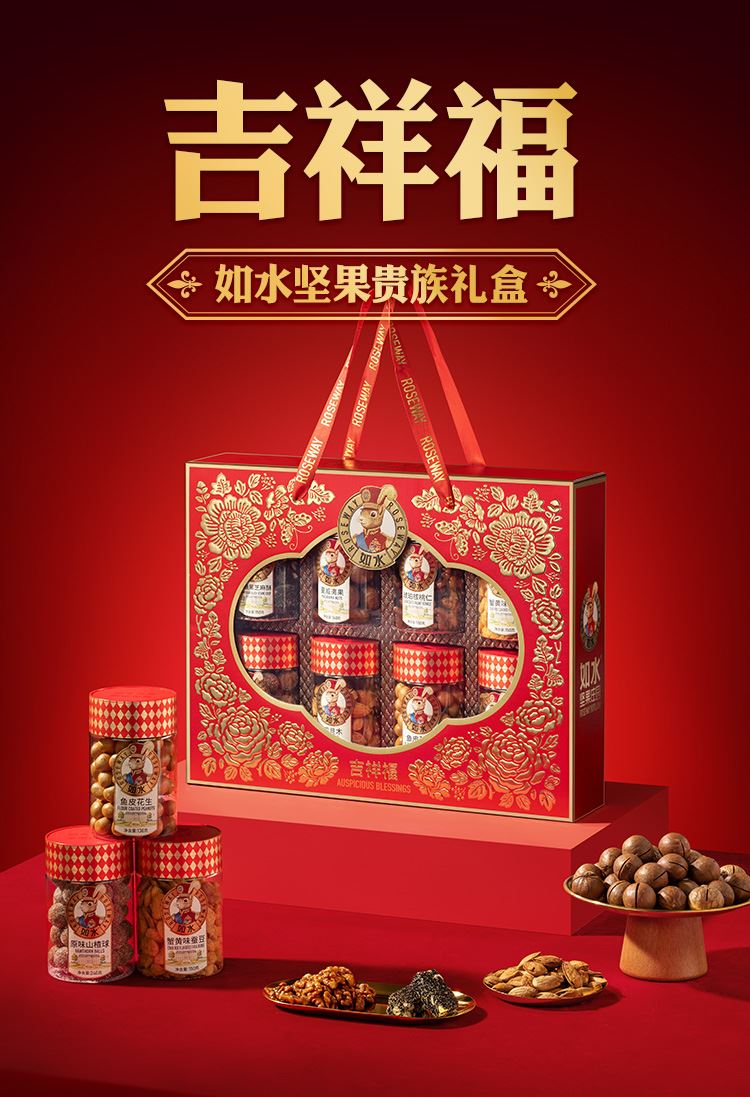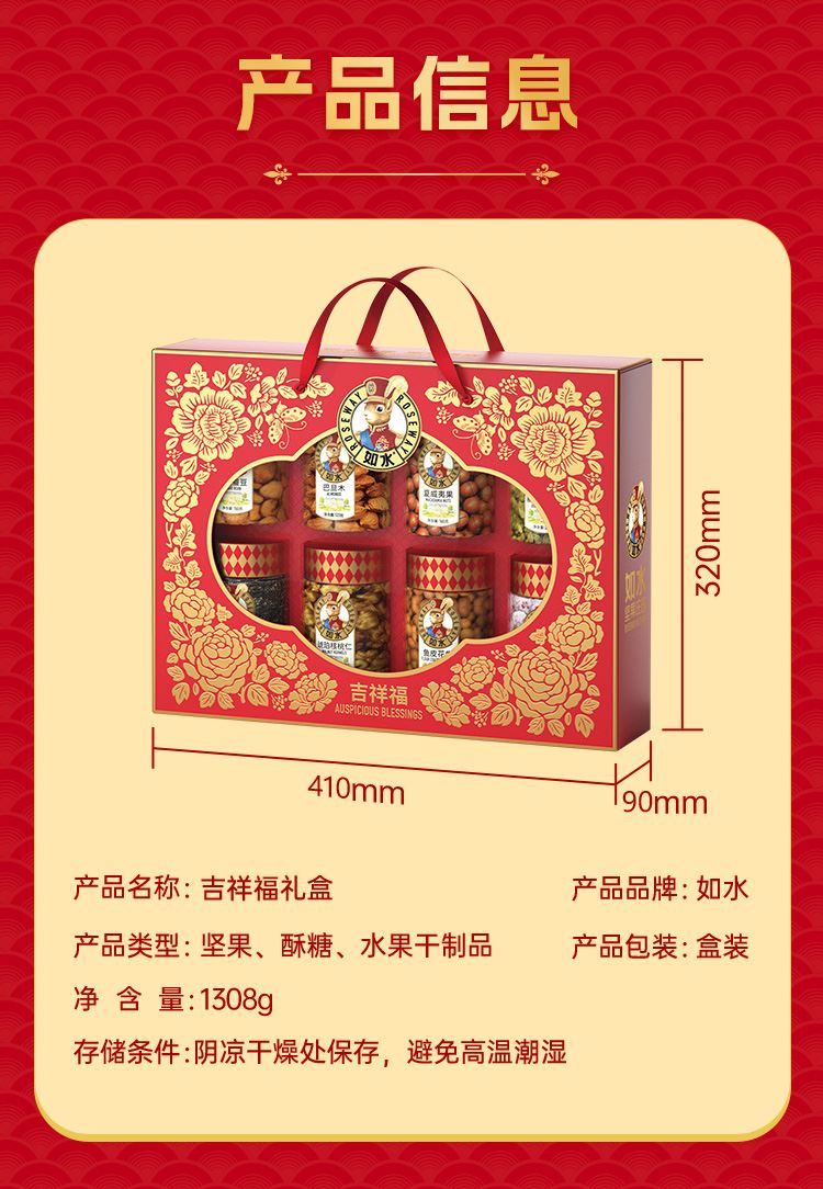 如水吉祥福礼盒| 净含量:1308g 如水夏威夷果160g 如水琥珀核桃仁150g 如水巴旦木120g 如水鱼皮花生138g 如水蟹黄味蚕豆150g 如水红糖黑芝麻酥150g 如水原味山楂球240g 如水新疆葡萄干200g