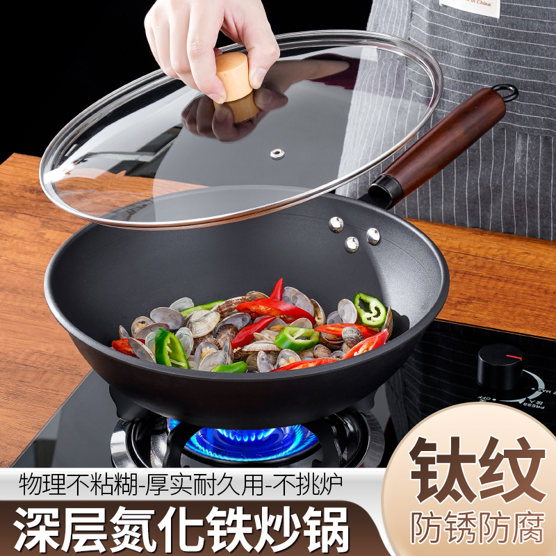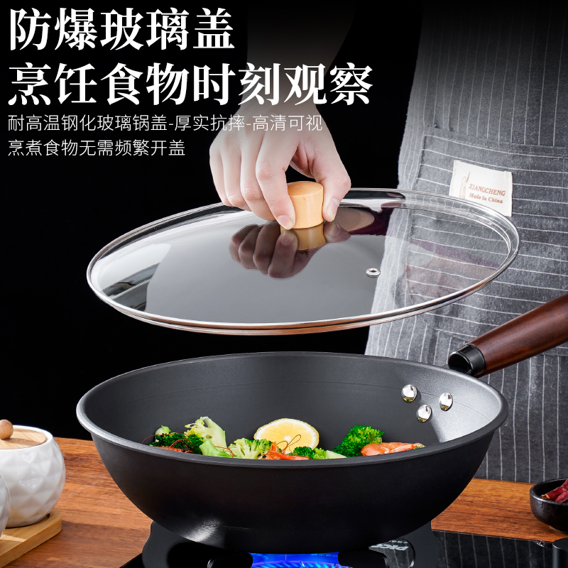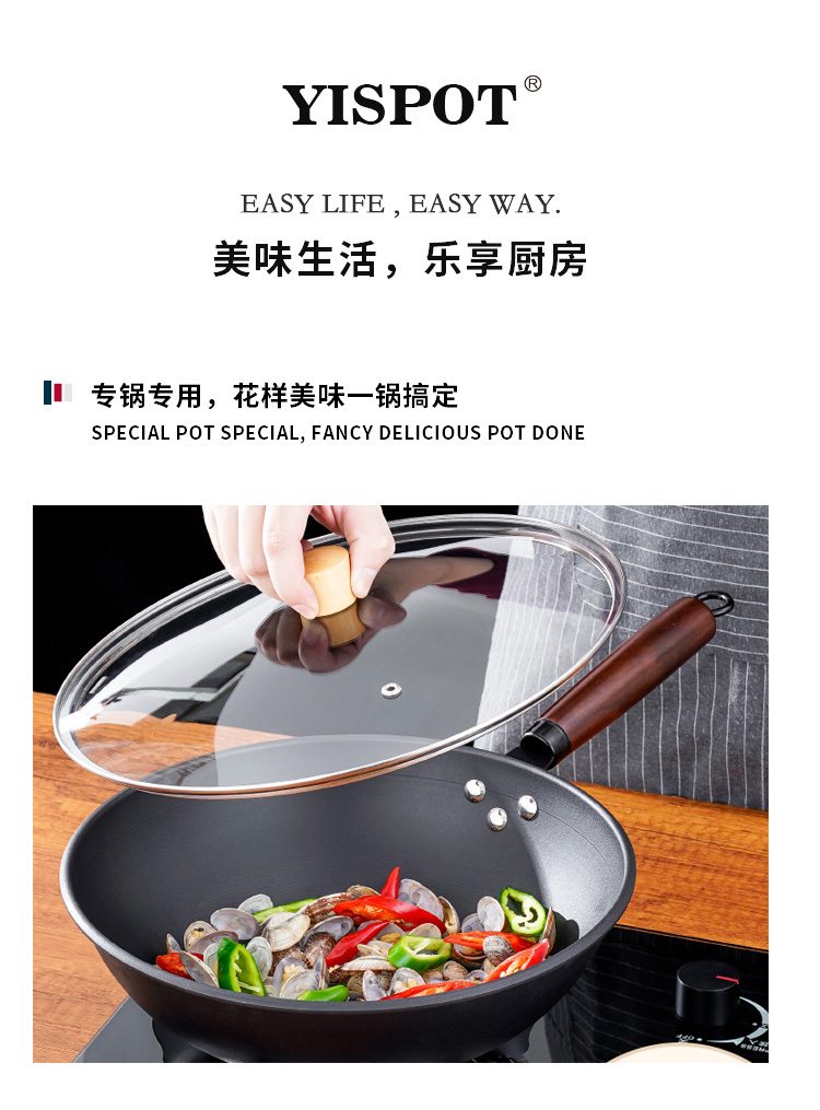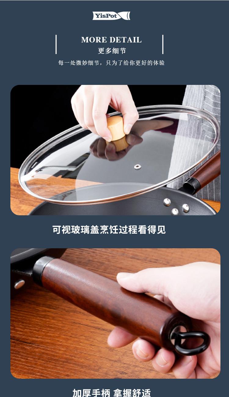 规格:32CM 型号:YP-2038 材质:精铁 箱数:8套/件 产品介绍:防烫木质手柄,可拆卸 立体圈纹,防滑稳固 深层氮化无涂层不粘工艺 可视锅盖,掌握烹饪节奏