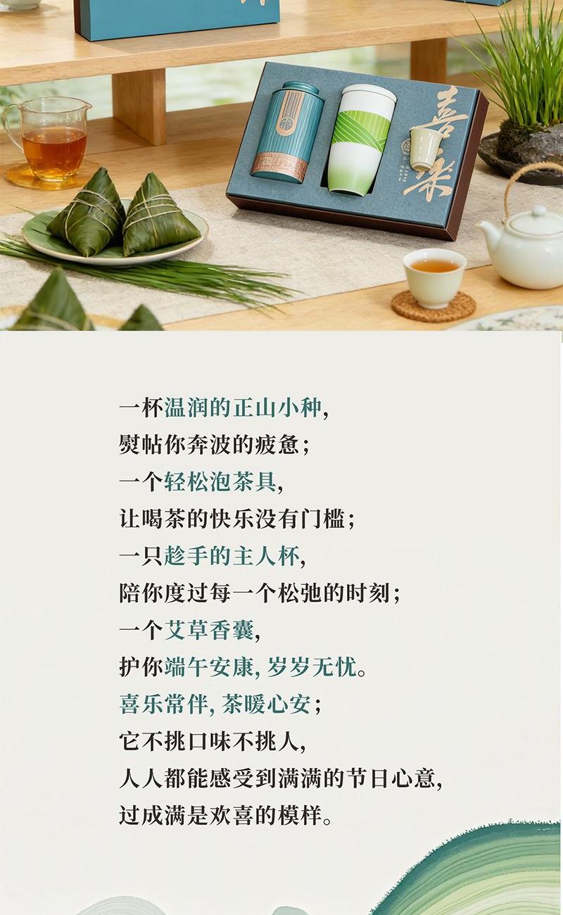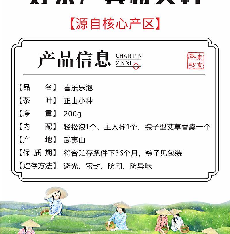 【原料】正山小种 【净重】200克 【内配】轻松泡1个、主人杯1个、粽子型艾草香囊一个