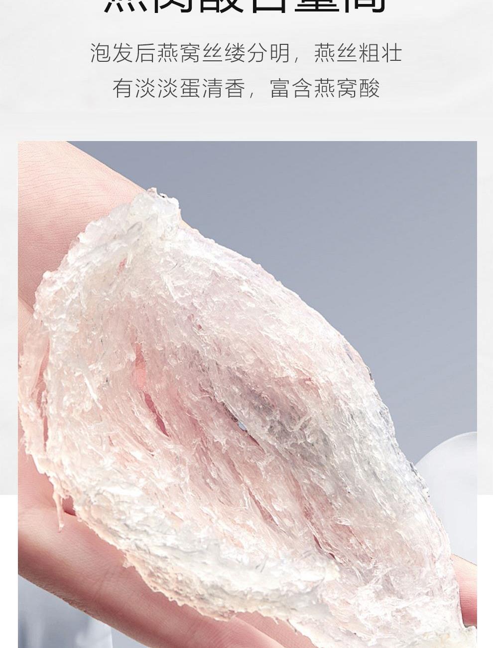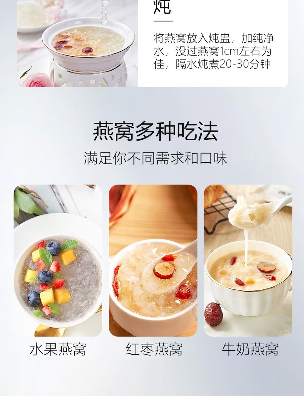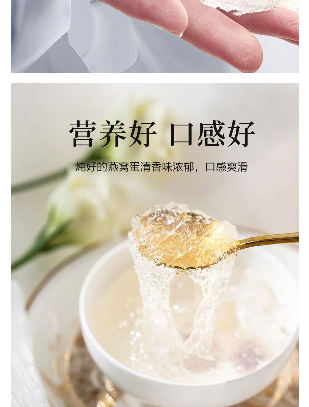 规格:免泡发大盏6克、(3克*2盏) 卖点:产品通过预处理技术实现 “免泡发、免挑毛、免清洗” 的便捷性,可直接放入炖盅,加入清水炖煮 20 分钟即可食用,对比传统干盏需 4-6 小时泡发 + 40 分钟炖煮的繁琐流程,效率提升 80% 以上。