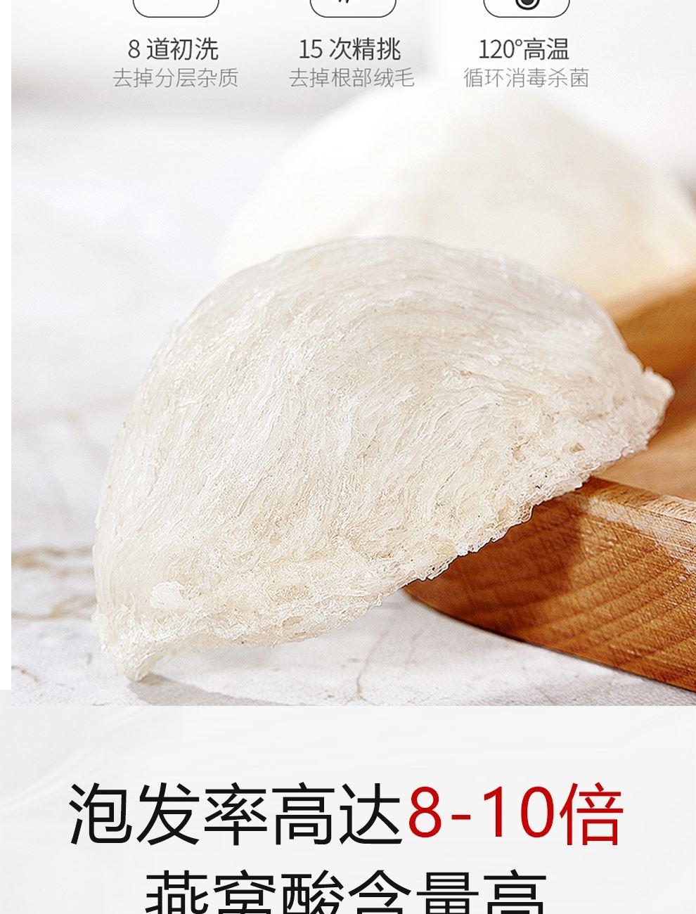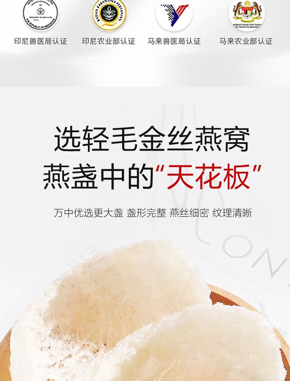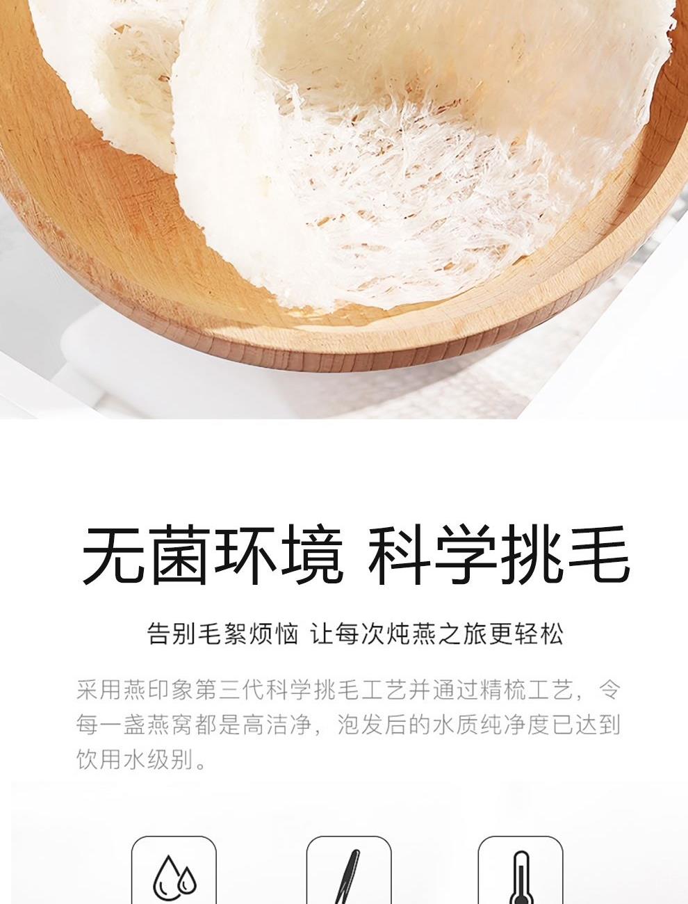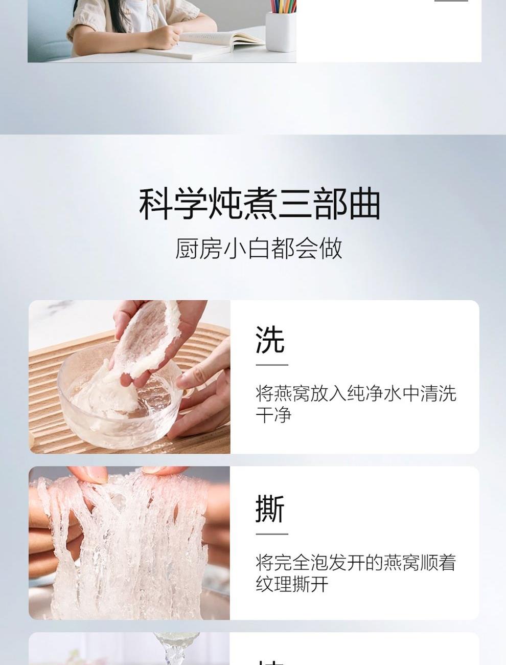 规格:免泡发大盏6克、(3克*2盏) 卖点:产品通过预处理技术实现 “免泡发、免挑毛、免清洗” 的便捷性,可直接放入炖盅,加入清水炖煮 20 分钟即可食用,对比传统干盏需 4-6 小时泡发 + 40 分钟炖煮的繁琐流程,效率提升 80% 以上。