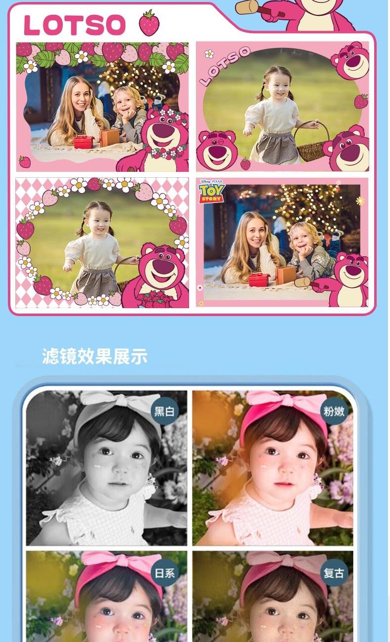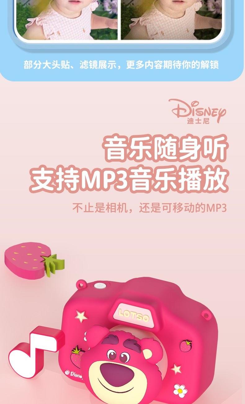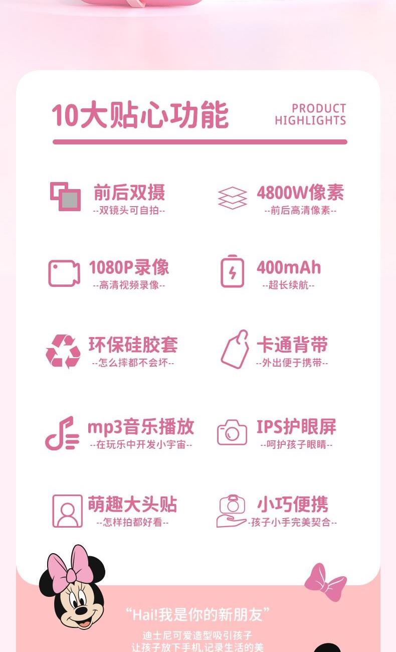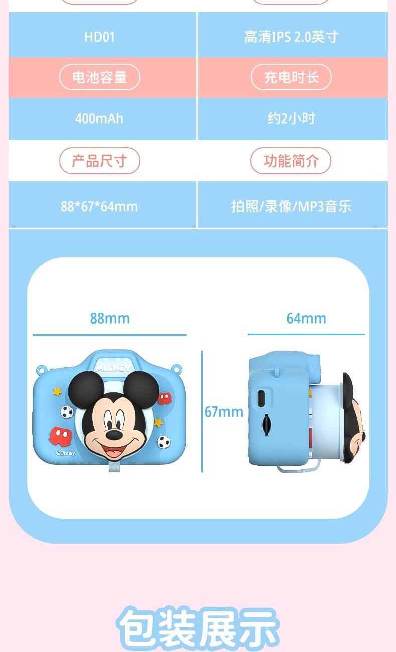屏幕尺寸:2.0"IPS高清屏 像 素 :4800万像素 产品功能:双摄拍照/录像/游戏/音乐播放 产品材质:ABS+PC+硅胶 电池容量:400mAh 产品款式:草莓熊/米奇/米妮 充电电压:直流DC-5V/1A 存储方式:TF卡(需单独购买) 支持:32GB(需单独购买) 拍照时间:约3小时 录像时间:约2.5小时 产品尺寸 : 88*67*64mm 1、迪士尼正版儿童相机 2、成长伴侣,情感纽带 3、前后双摄,自由切换,4800W高清像素 4、拍照 录像两用,1080p高清摄像 5、内硅胶保护套,多重防摔,圆润无邻角造型不伤手 6、IP主题大头贴,内置多款滤镜,支持MP3播放 音乐随声听 7、自带挂绳 出游更方便,大容量电池 超长待机 8、可单独购买32GTF,读卡器,数据线方便家长取出打印相片更便捷